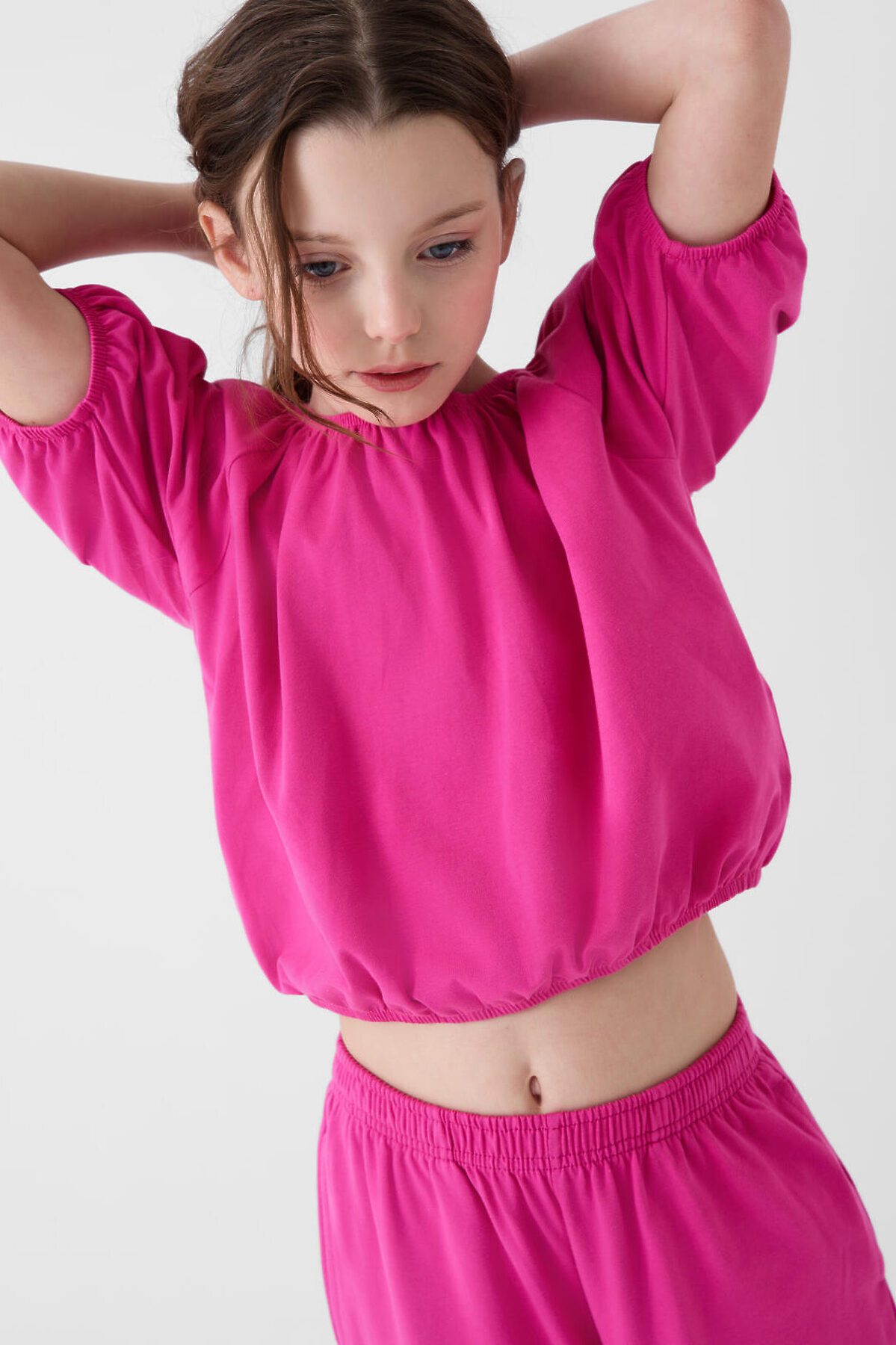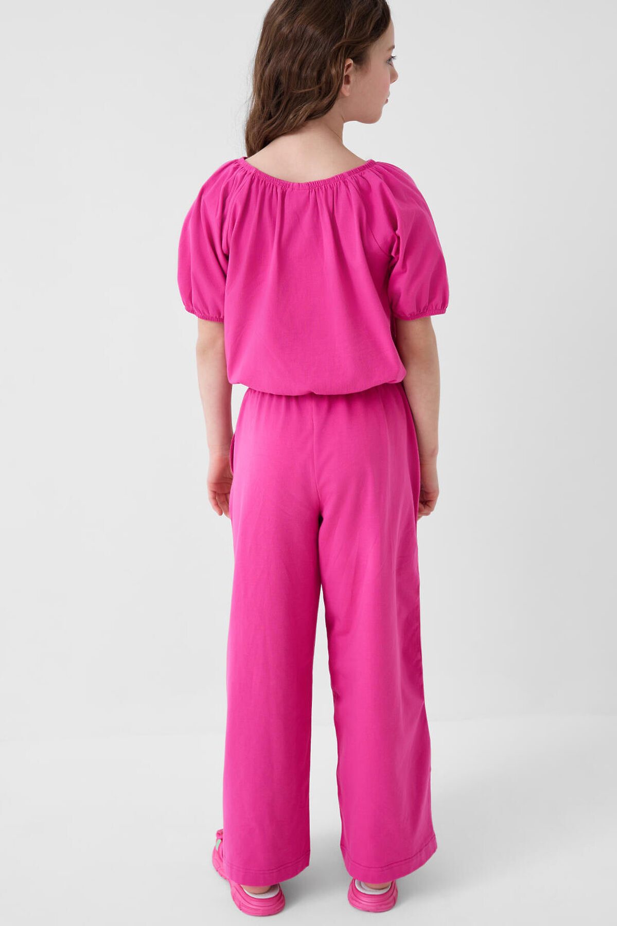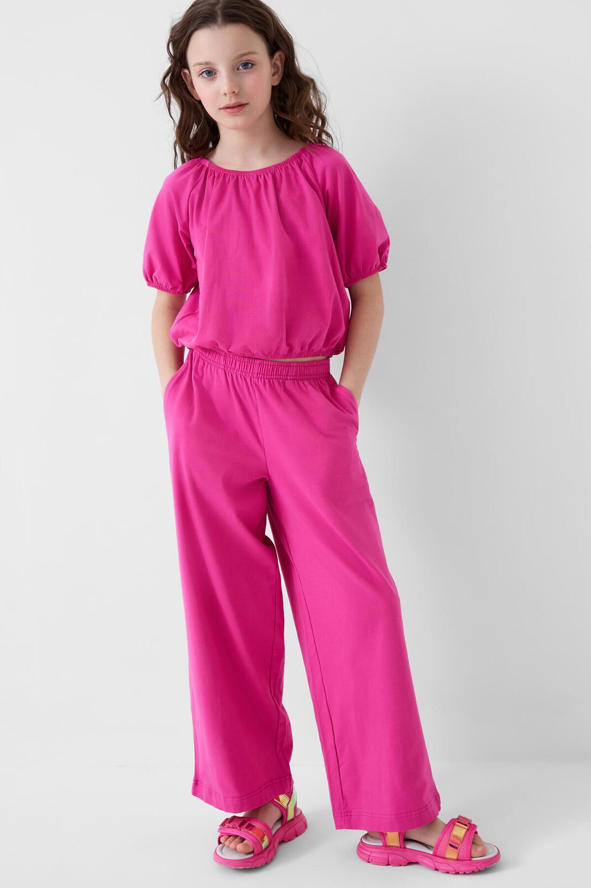 Детский легкий комплект для девочки. Состоит из футболки и прямых брюк на резинке. Выполнен из хлопкового трикотажа. Футболка свободная, с округлым вырезом и мягкой сборкой по горловине и низу, за счёт чего выглядит воздушной и комфортной. Брюки — прямые, со средней посадкой на резинке.