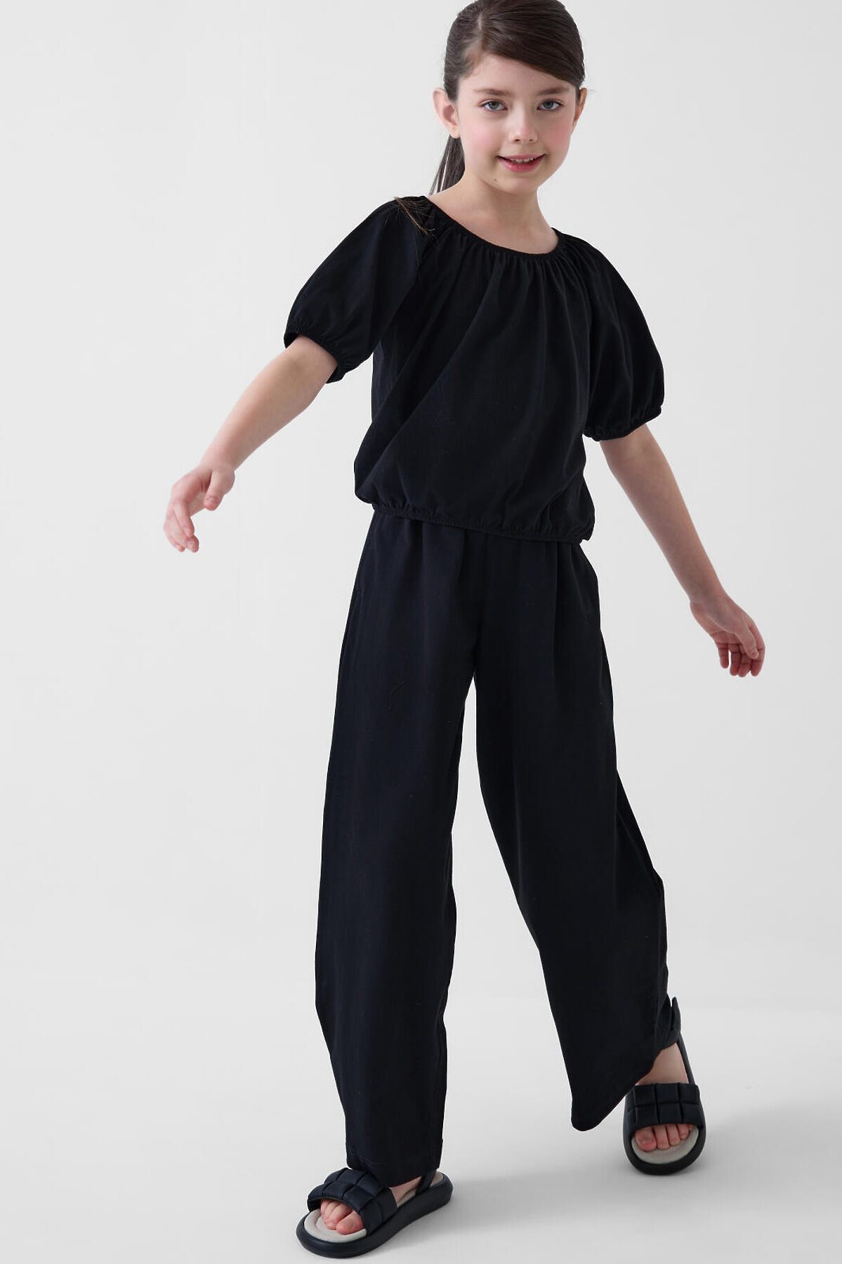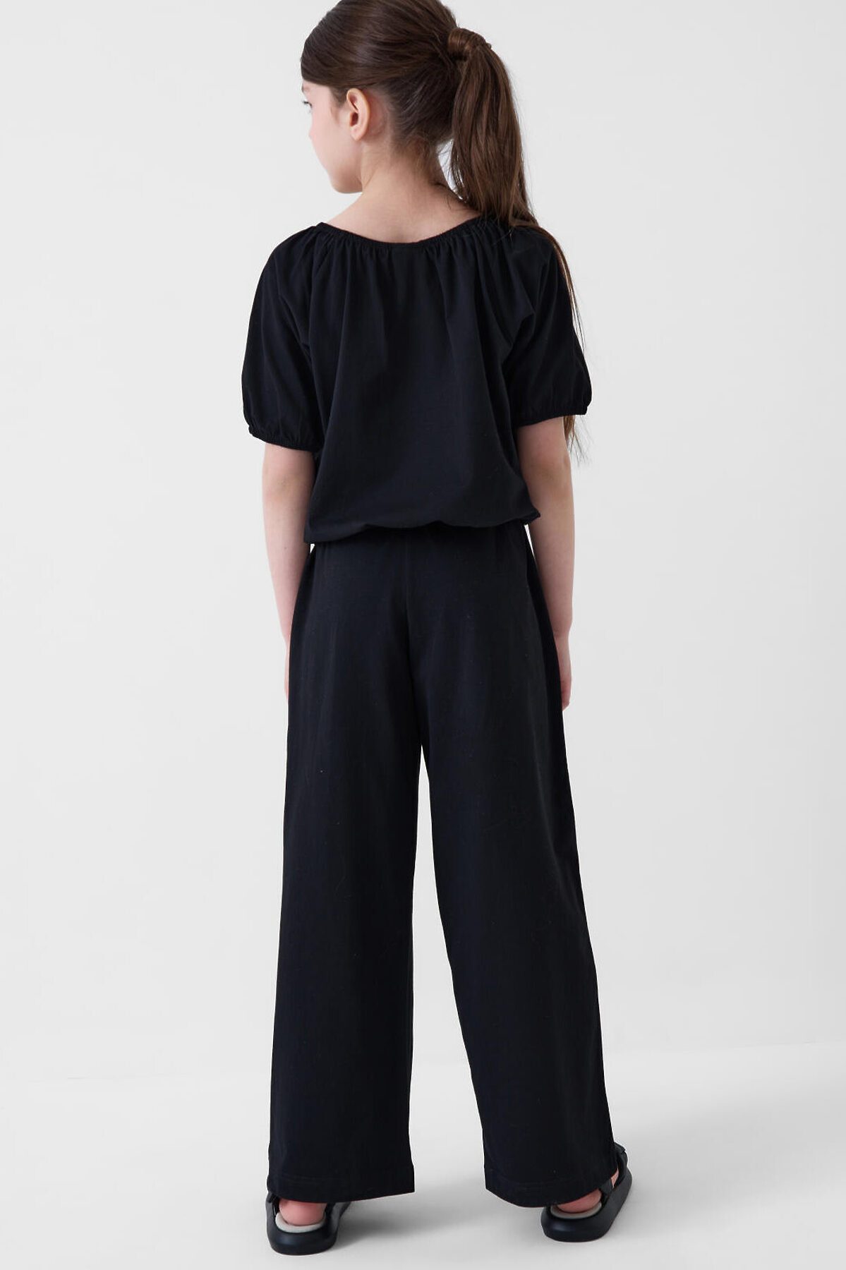 Детский легкий комплект для девочки. Состоит из футболки и прямых брюк на резинке. Выполнен из хлопкового трикотажа. Футболка свободная, с округлым вырезом и мягкой сборкой по горловине и низу, за счёт чего выглядит воздушной и комфортной. Брюки на резинке — прямые, со средней посадкой.