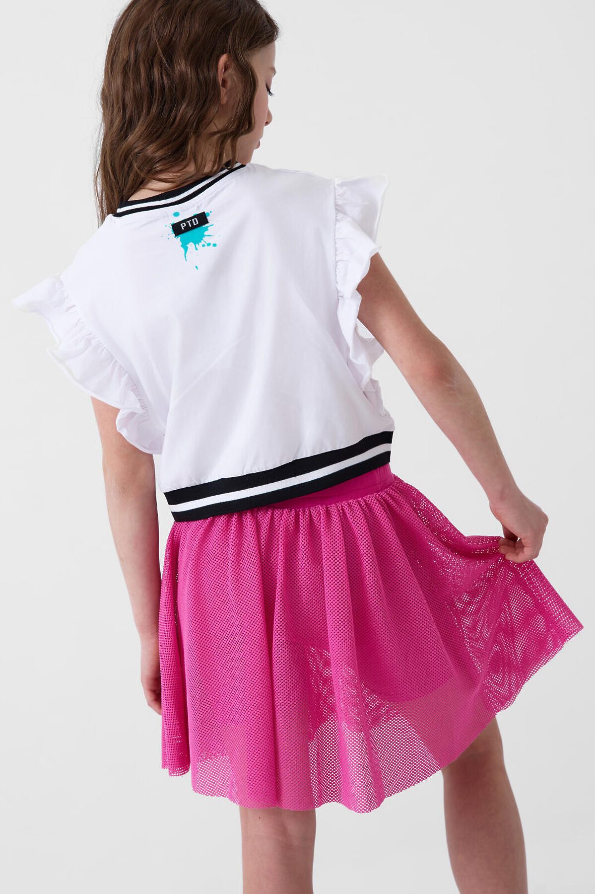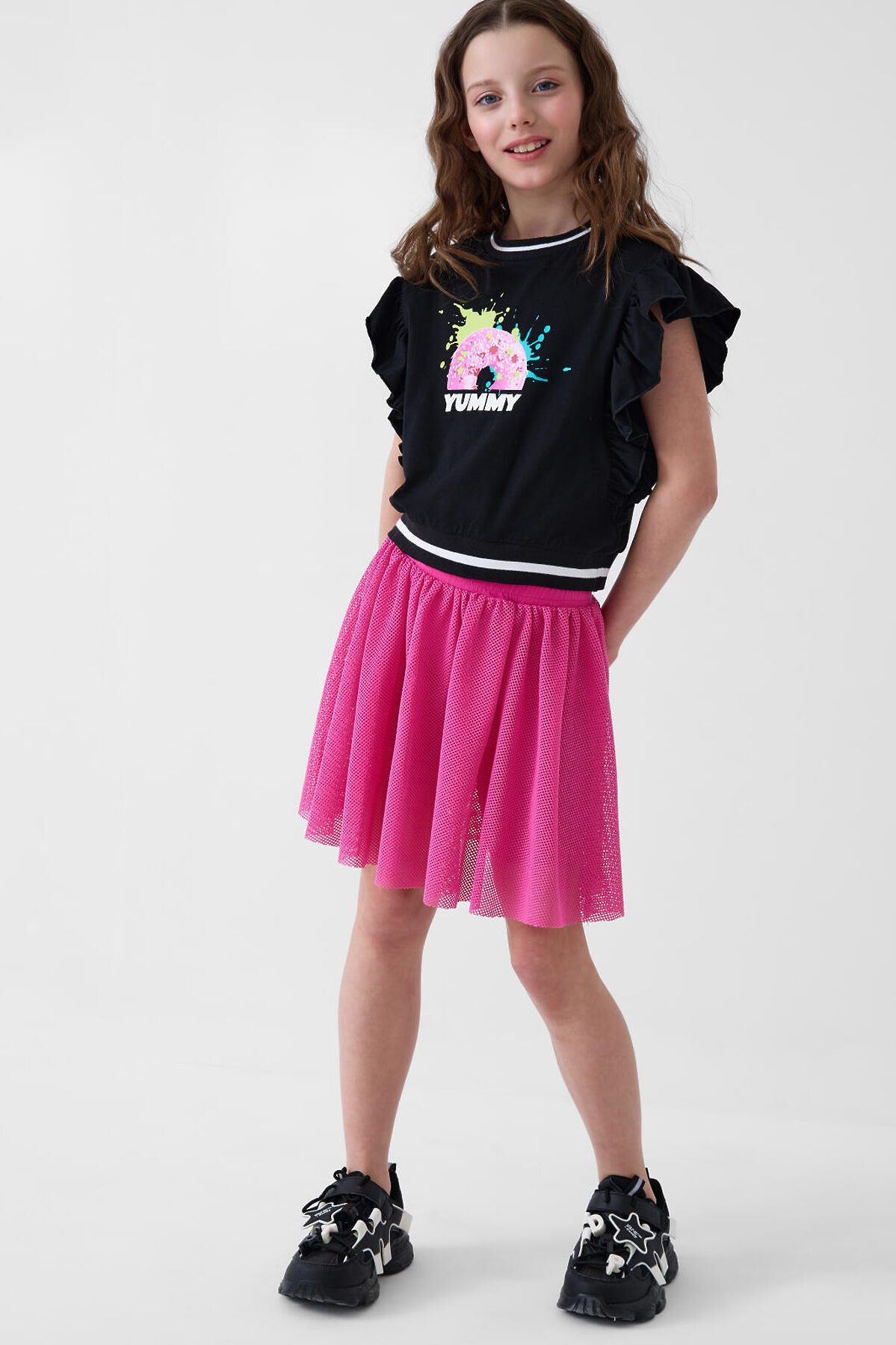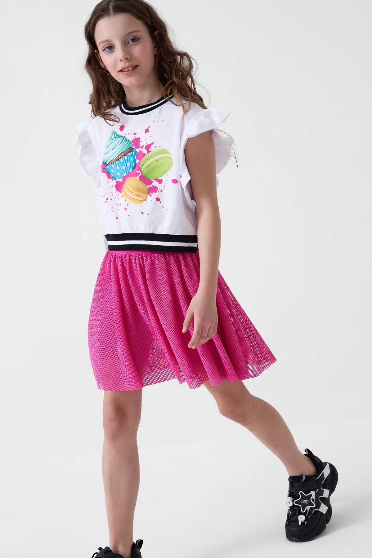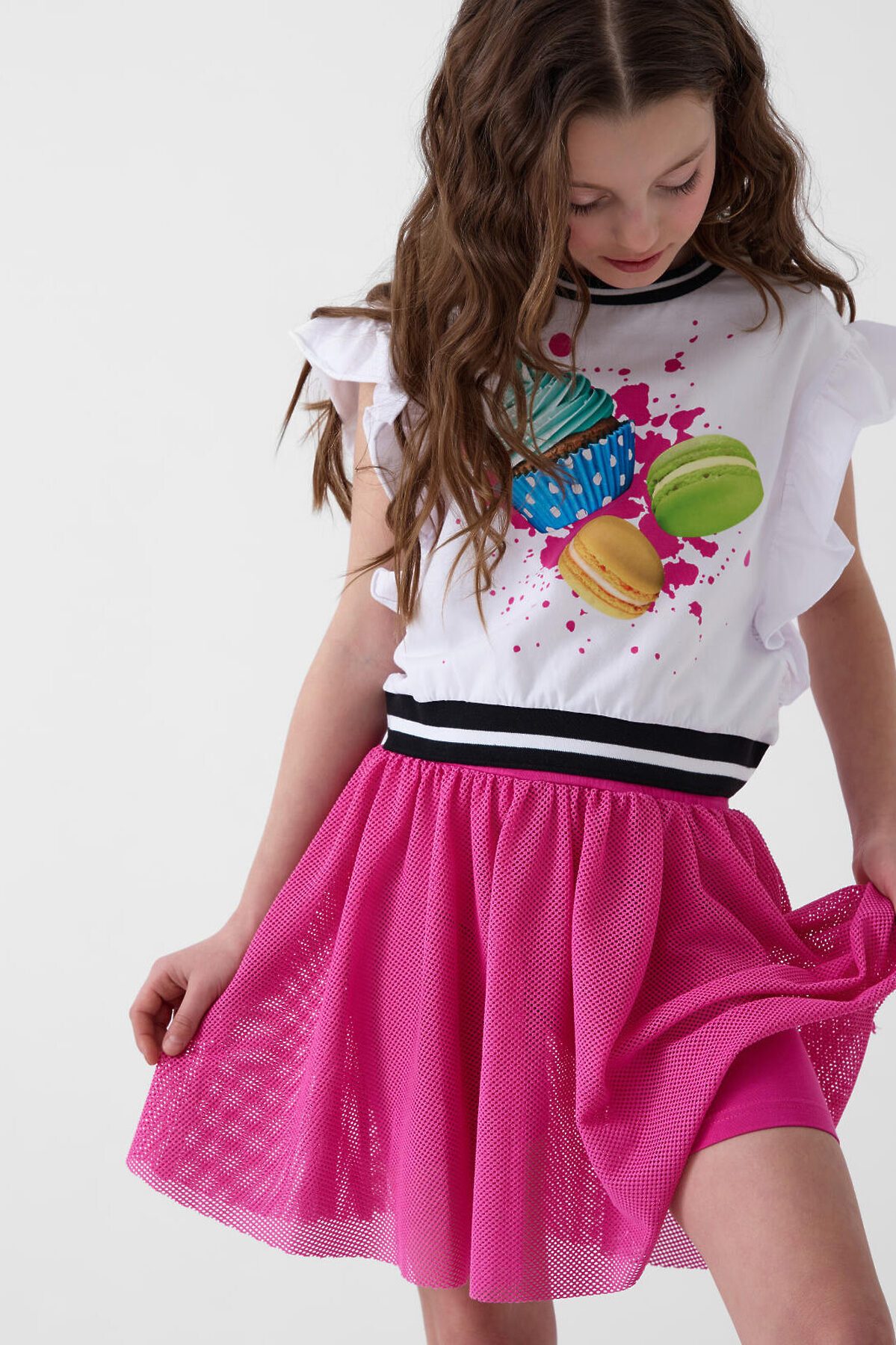Юбка-леггинсы для девочки подростка. Верхняя часть выполнена из легкой сетчатой ткани, под ней — плотные трикотажные укороченные леггинсы. Широкий пояс держится за счёт внутренней резинки. Длина юбки — до середины бедра.