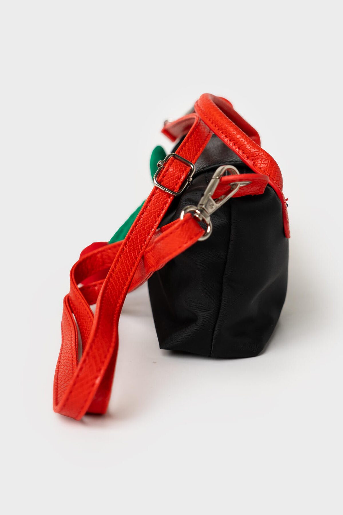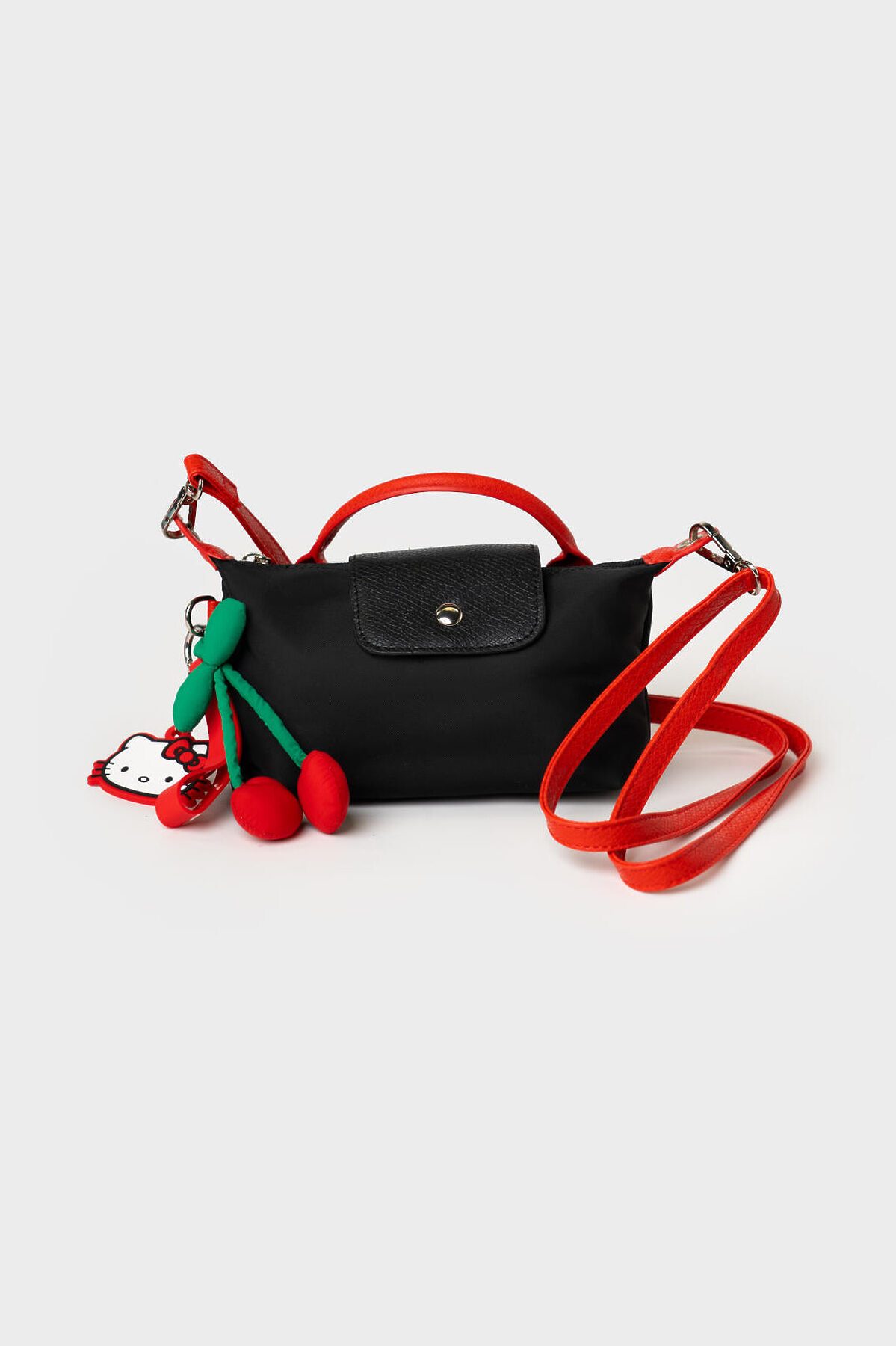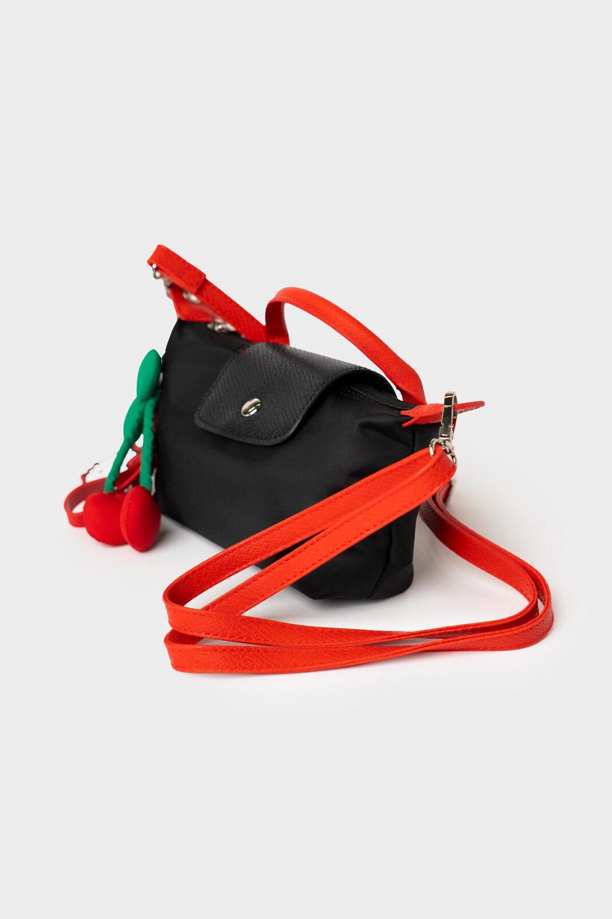 Трендовая мини-сумочка кросс-боди. Сумочка выполнена из нейлона и искусственной кожи. Сумка имеет одно отделение на молнии и сверху закрывается на клапан. Внутри есть карман на молнии. Регулируемый плечевой ремень. Хотя сумочка и выглядит маленькой, она очень вместительная, в ней помещается телефон, ключи, документы и т.п. Сумочка декорирована ярким стильным навесом вишенки. Параметры сумки: высота - 11 см, ширина - 17 см, глубина - 5,5 см
