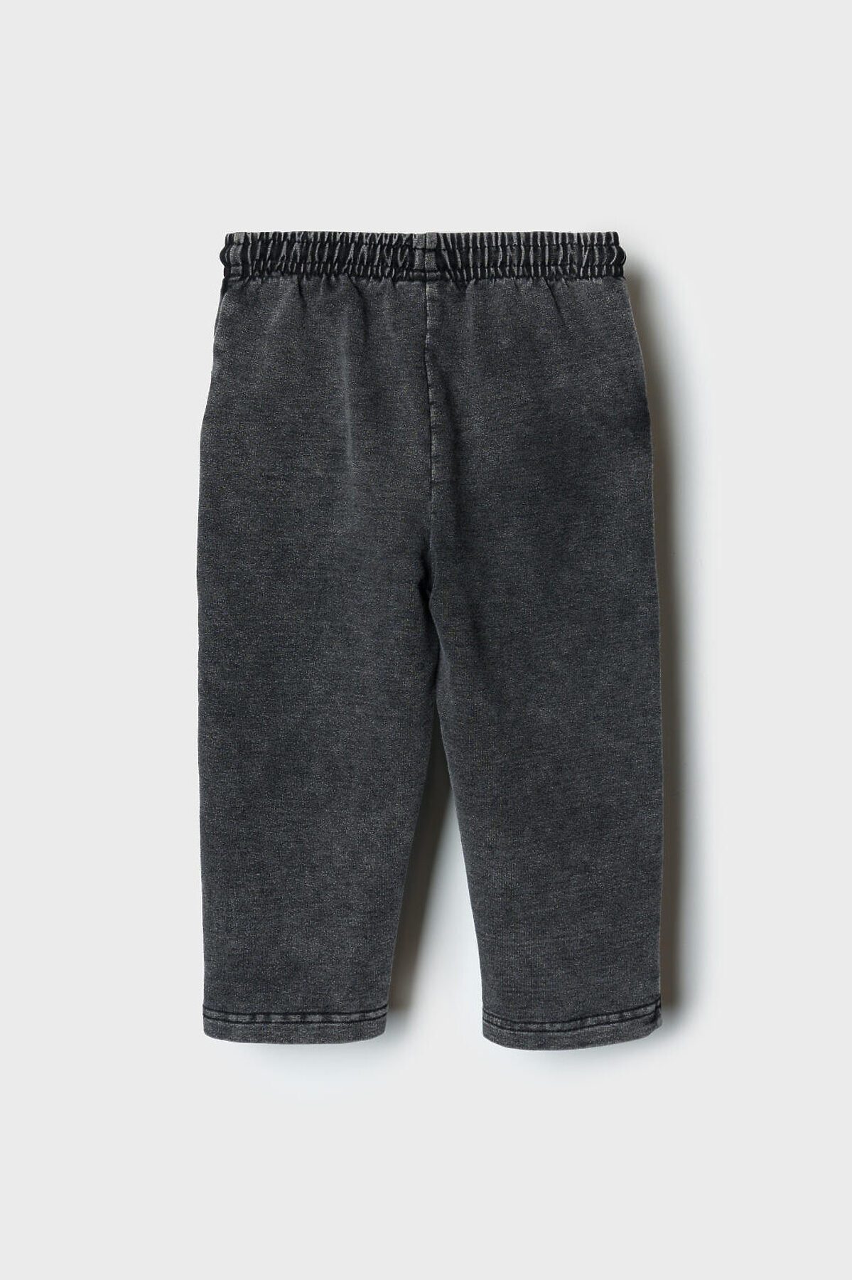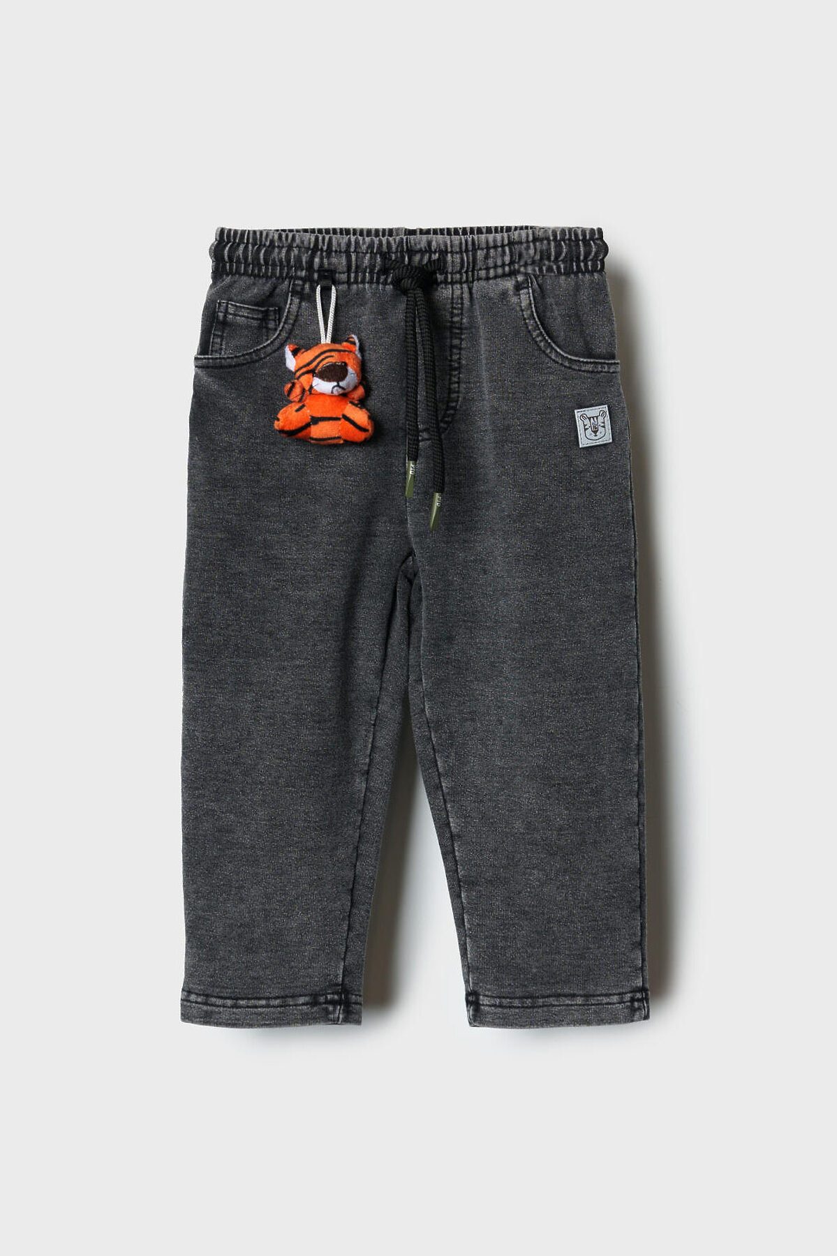 Детские брюки для мальчика. Модель прямого силуэта, выполнена из мягкого хлопкового трикотажа с эффектом денима. У брюк высокий комфортный пояс на широкой резинке и шнурок для регулировки. Спереди — два удобных кармана. Декоративная нашивка, а на левом кармане — съемный брелок в виде тигренка.