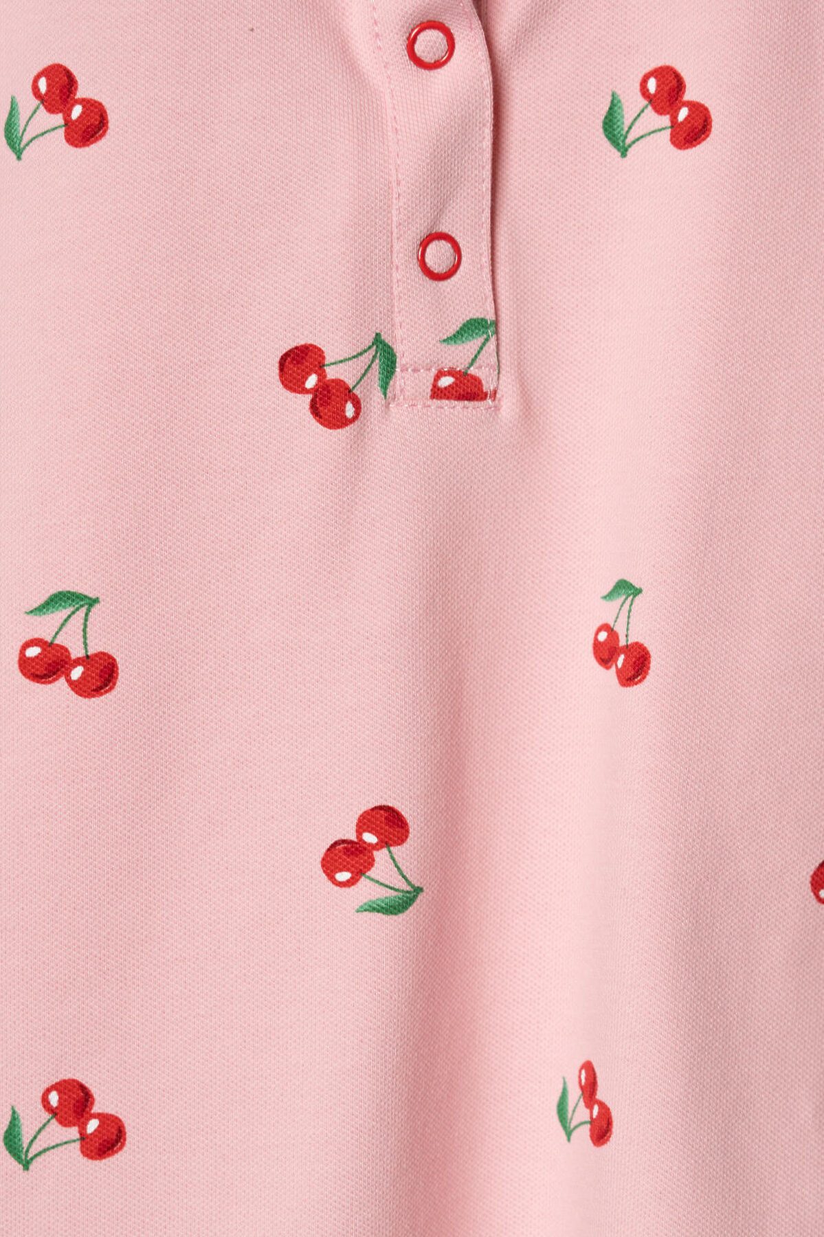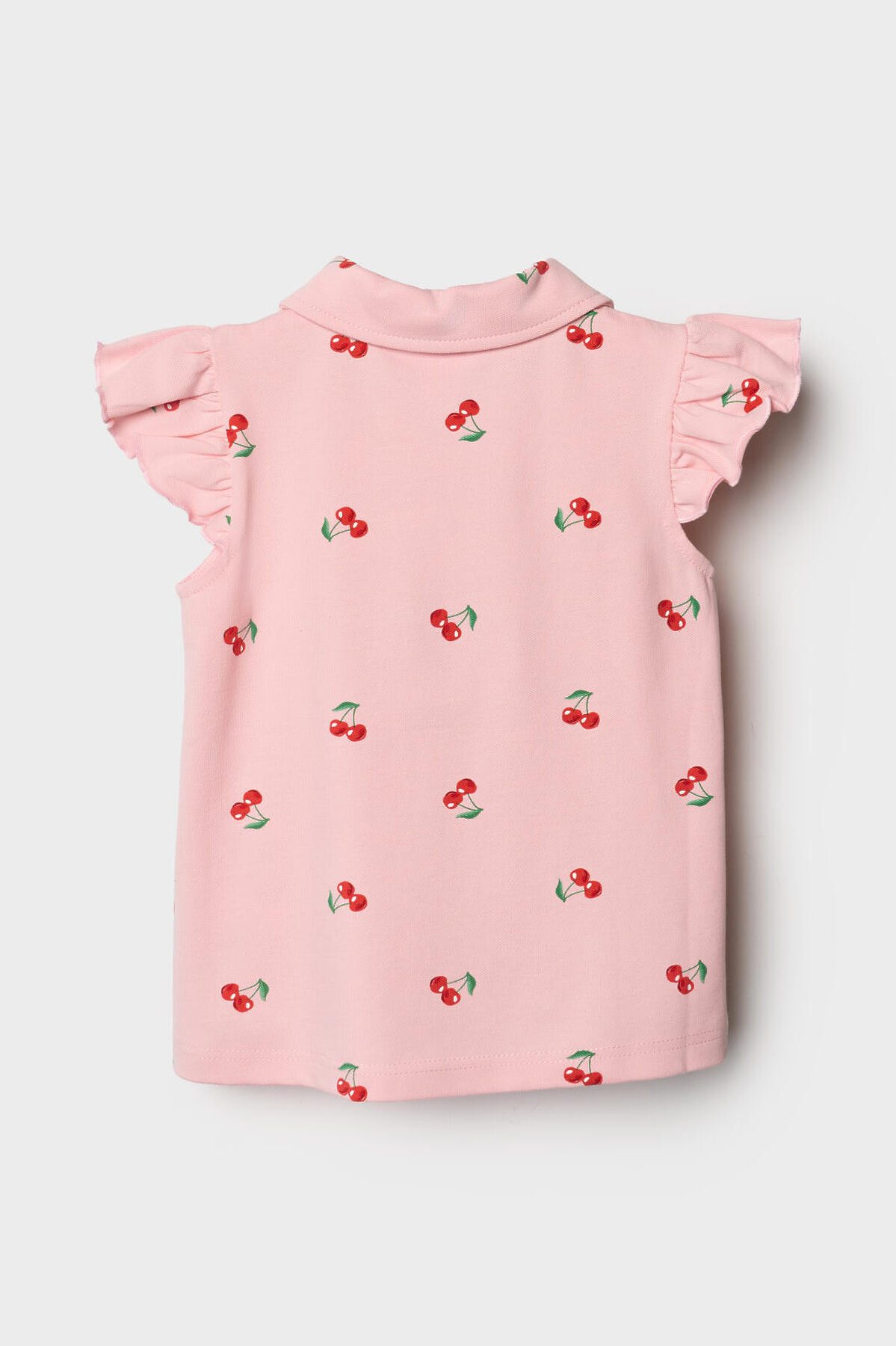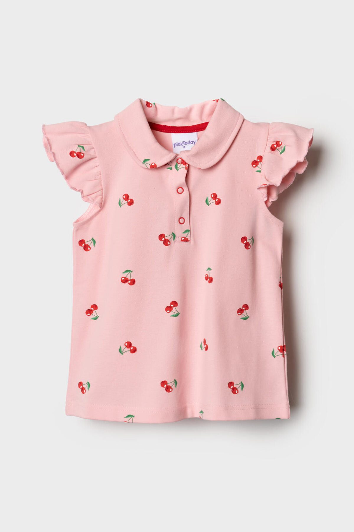Детская футболка-поло для девочки. Модель прямого кроя, выполнена из эластичного хлопкового трикотажа пике. Яркий принт с вишнями. Отложной воротник с застежкой на кнопки. Рукава-крылышки.