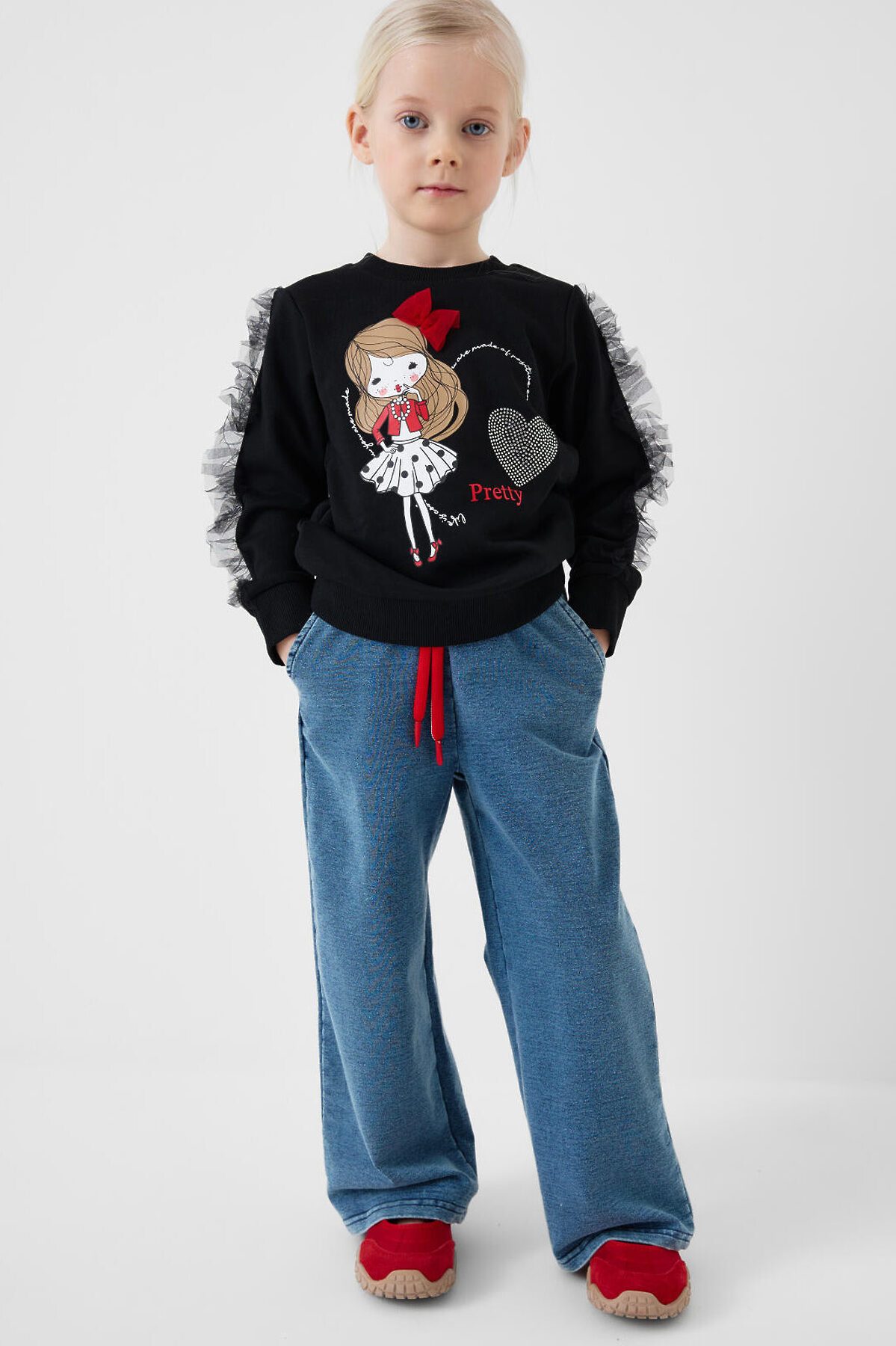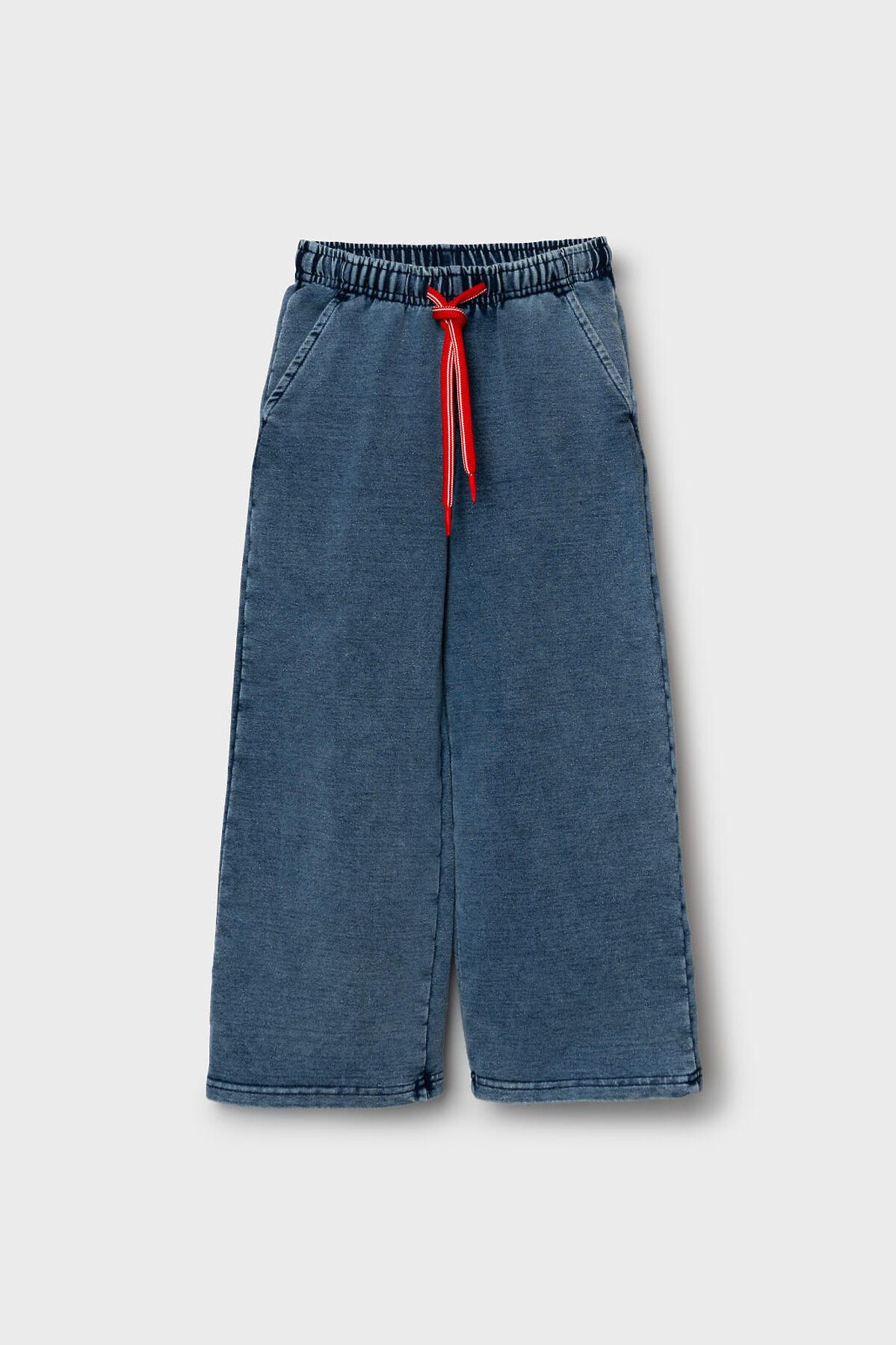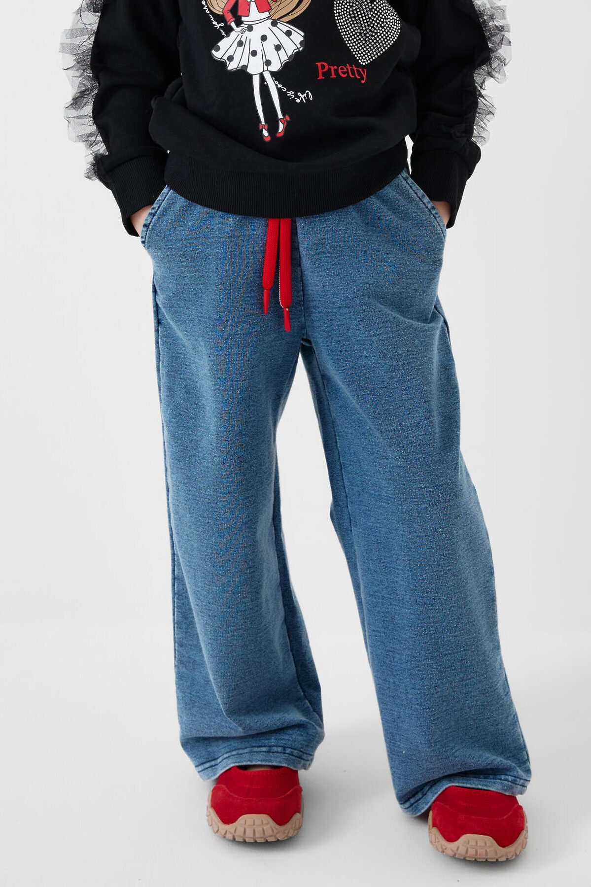 Детские брюки для девочки. Модель прямого кроя, выполнена из мягкого хлопкового трикотажа с эффектом денима. У брюк комфортный пояс на резинке и шнурок для регулировки. Спереди — два удобных кармана.