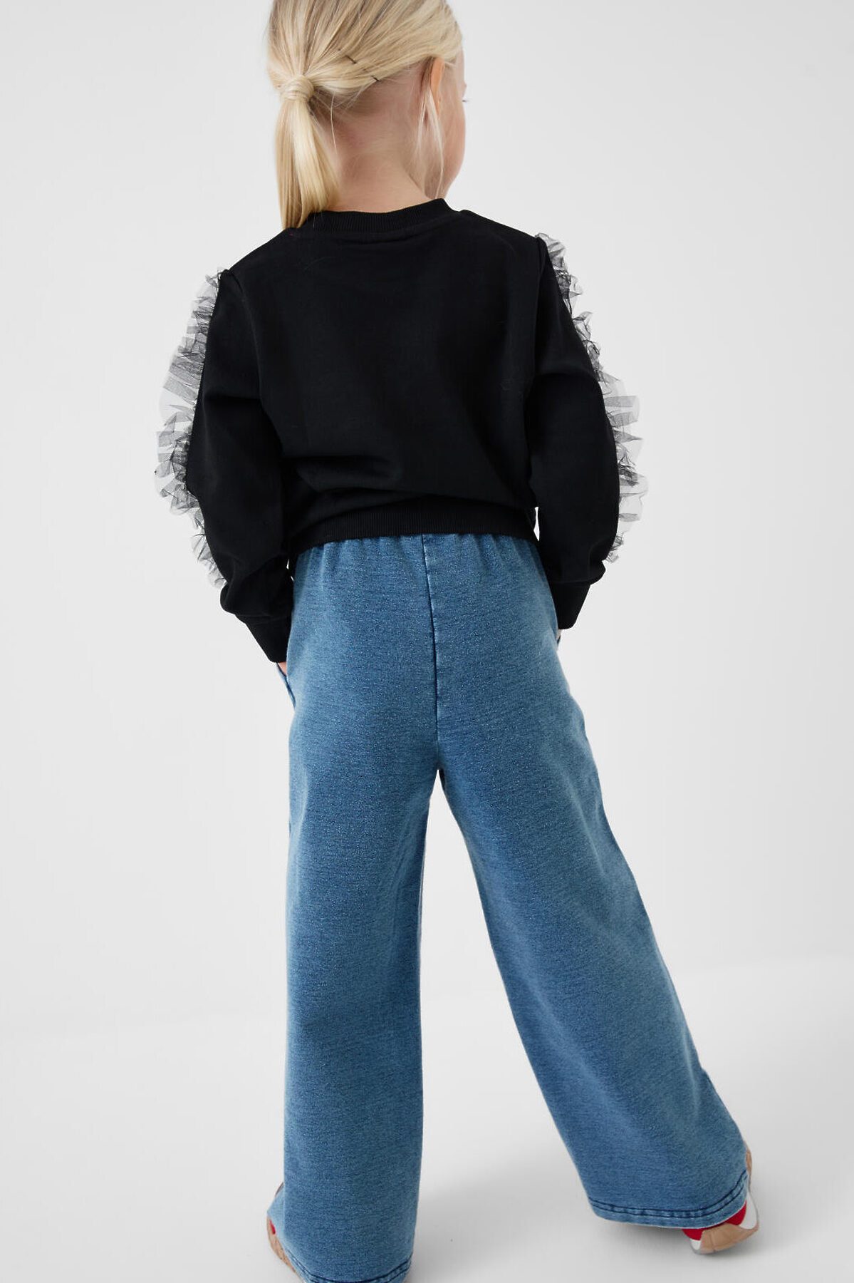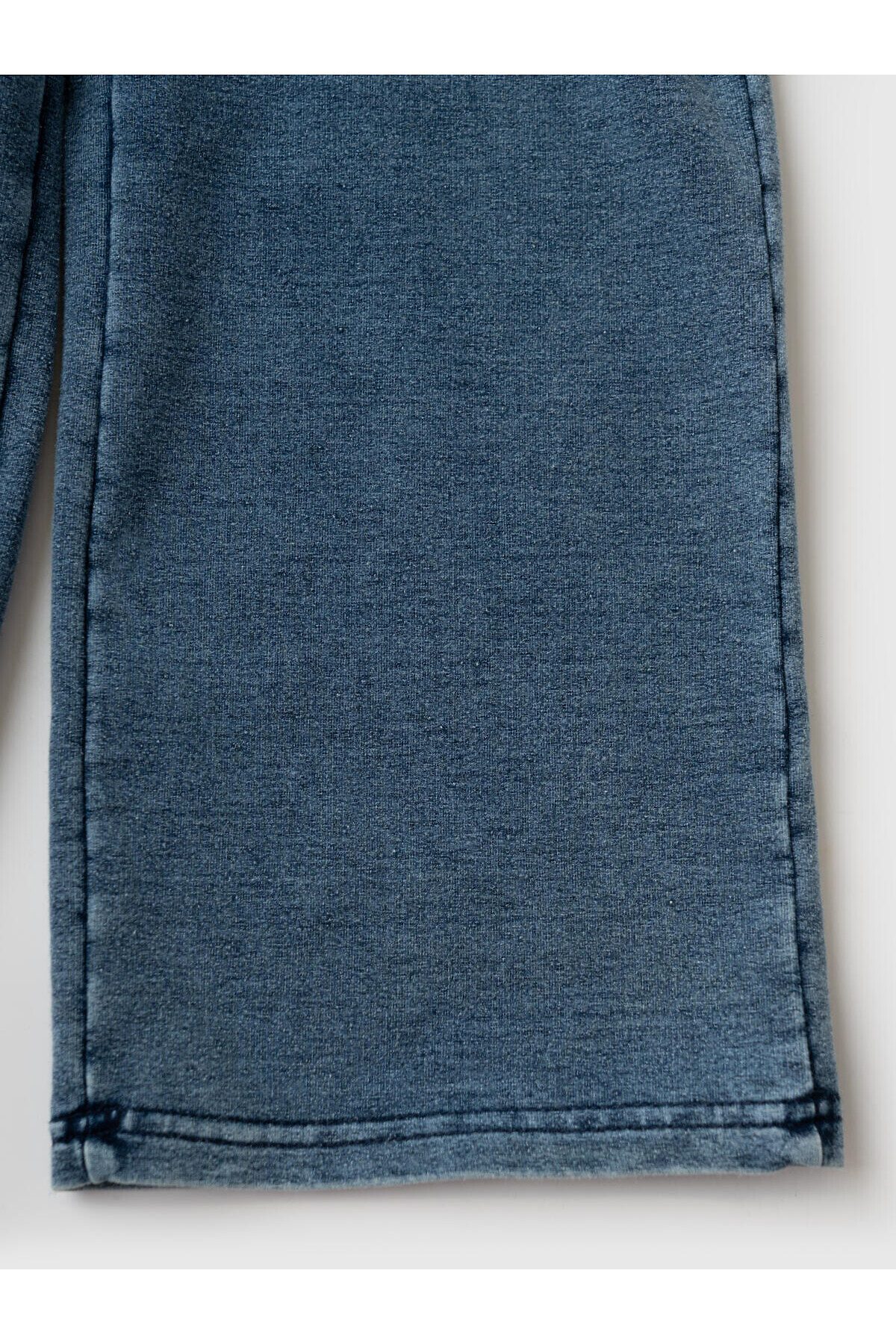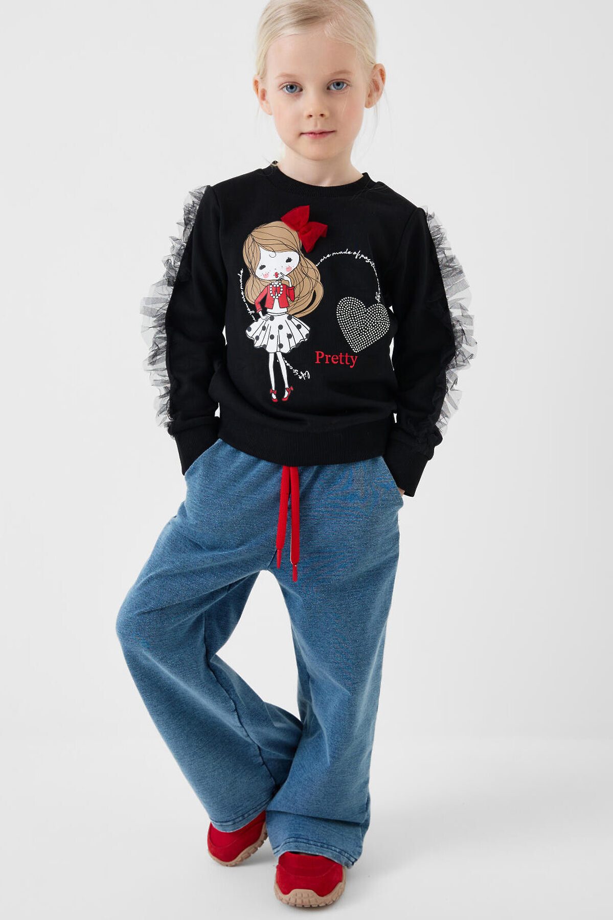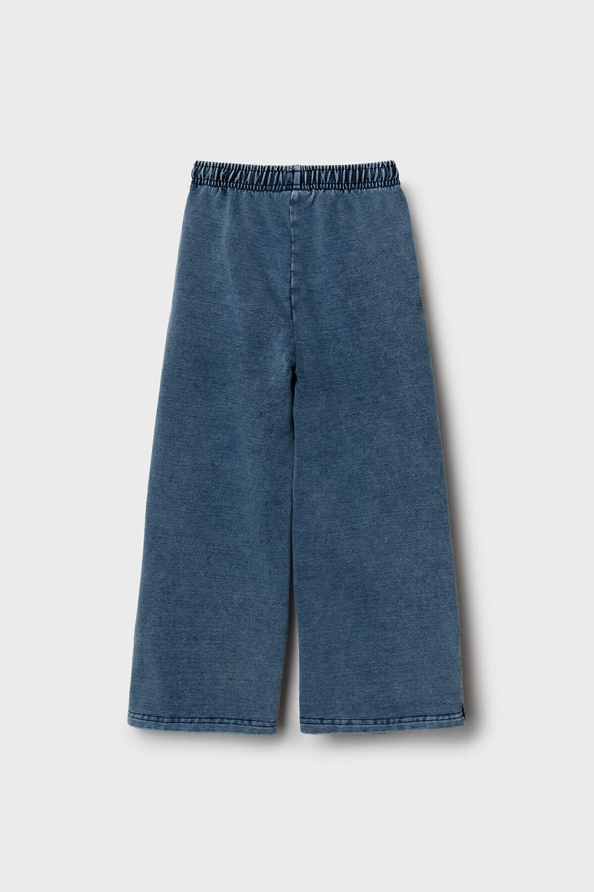 Детские брюки для девочки. Модель прямого кроя, выполнена из мягкого хлопкового трикотажа с эффектом денима. У брюк комфортный пояс на резинке и шнурок для регулировки. Спереди — два удобных кармана.