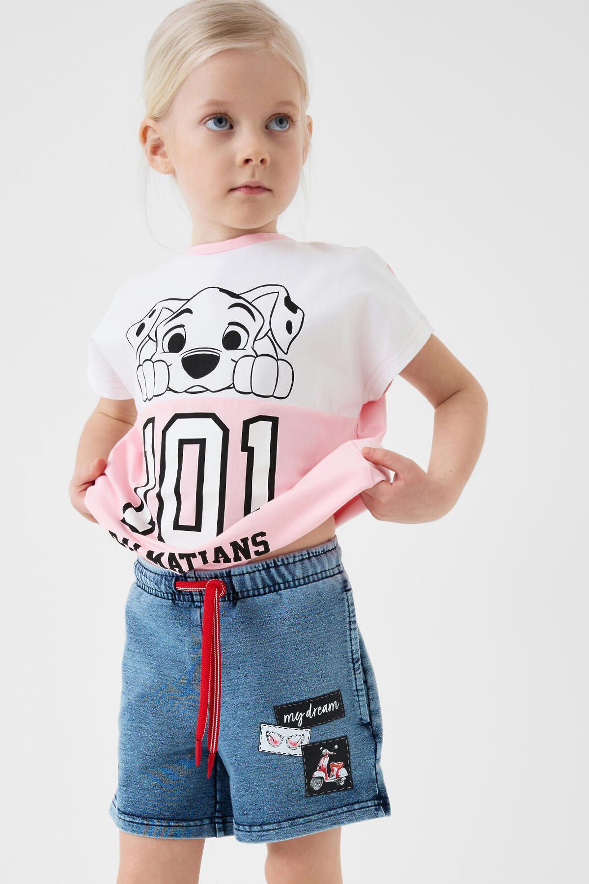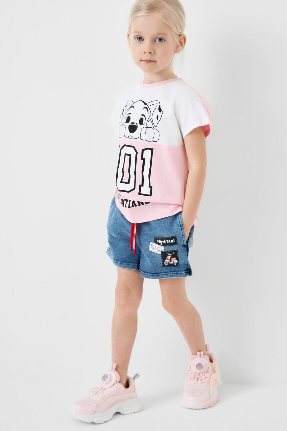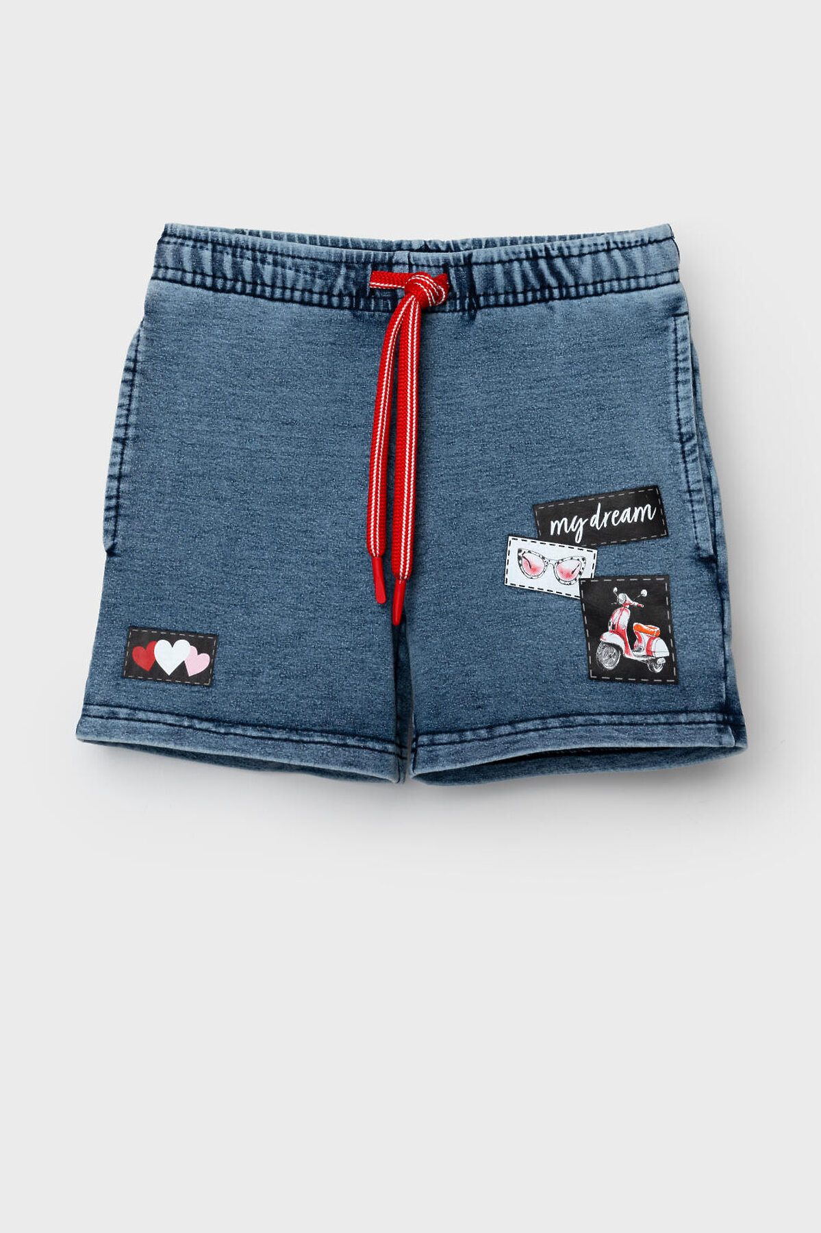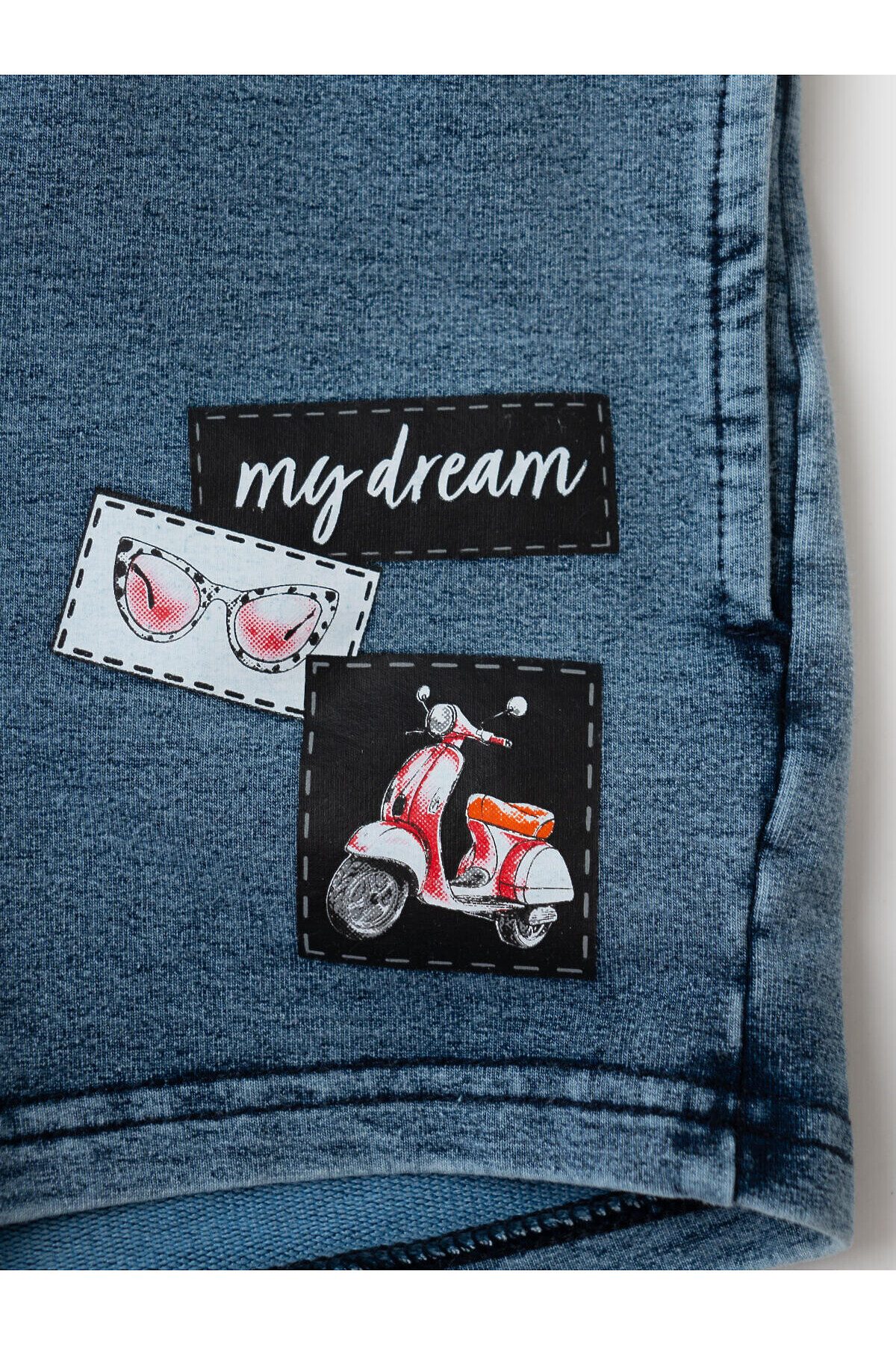 Детские шорты короткие для девочки. Модель свободного кроя. Материал визуально похож на деним, но имеет все качества хлопкового трикотажа. Удобная посадка обеспечивается эластичным поясом со шнуром. Спереди расположены два боковых кармана. Декоративные нашивки.