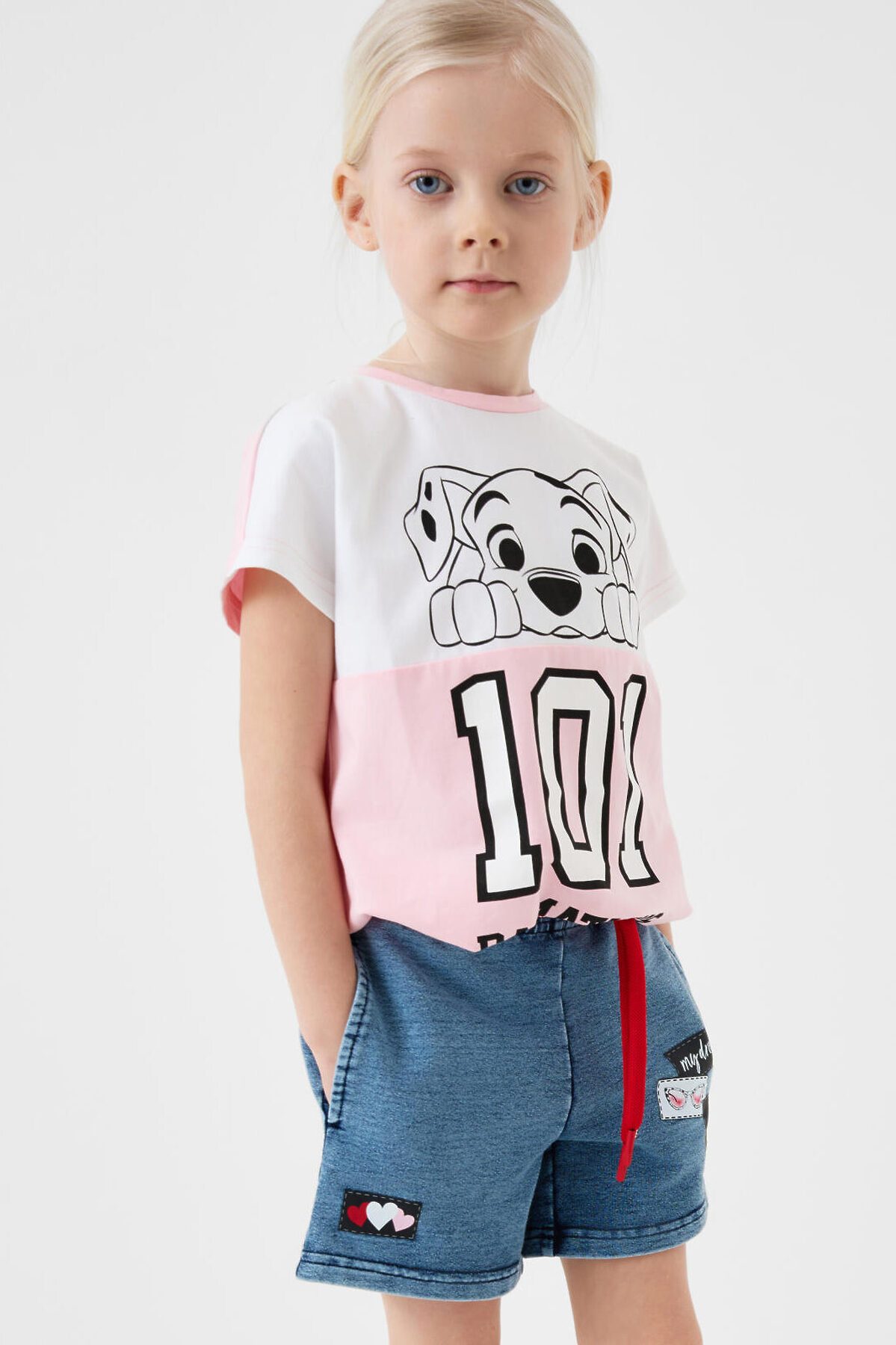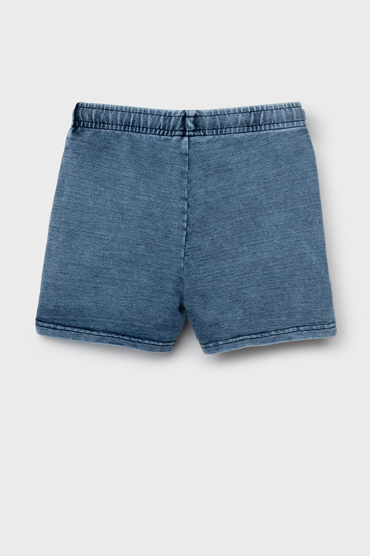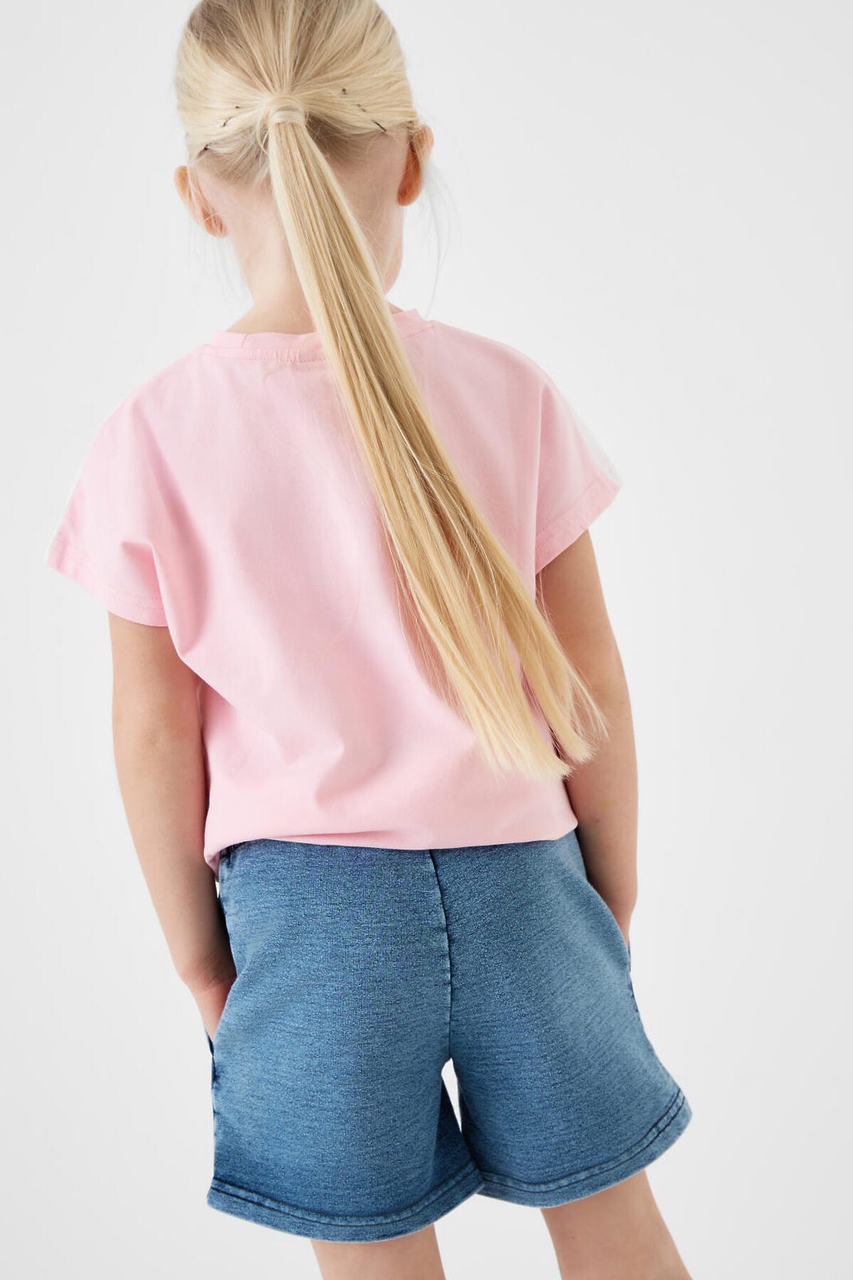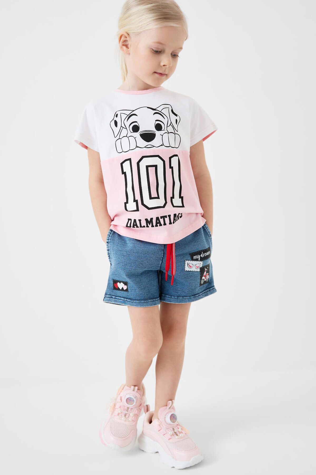 Детские шорты короткие для девочки. Модель свободного кроя. Материал визуально похож на деним, но имеет все качества хлопкового трикотажа. Удобная посадка обеспечивается эластичным поясом со шнуром. Спереди расположены два боковых кармана. Декоративные нашивки.