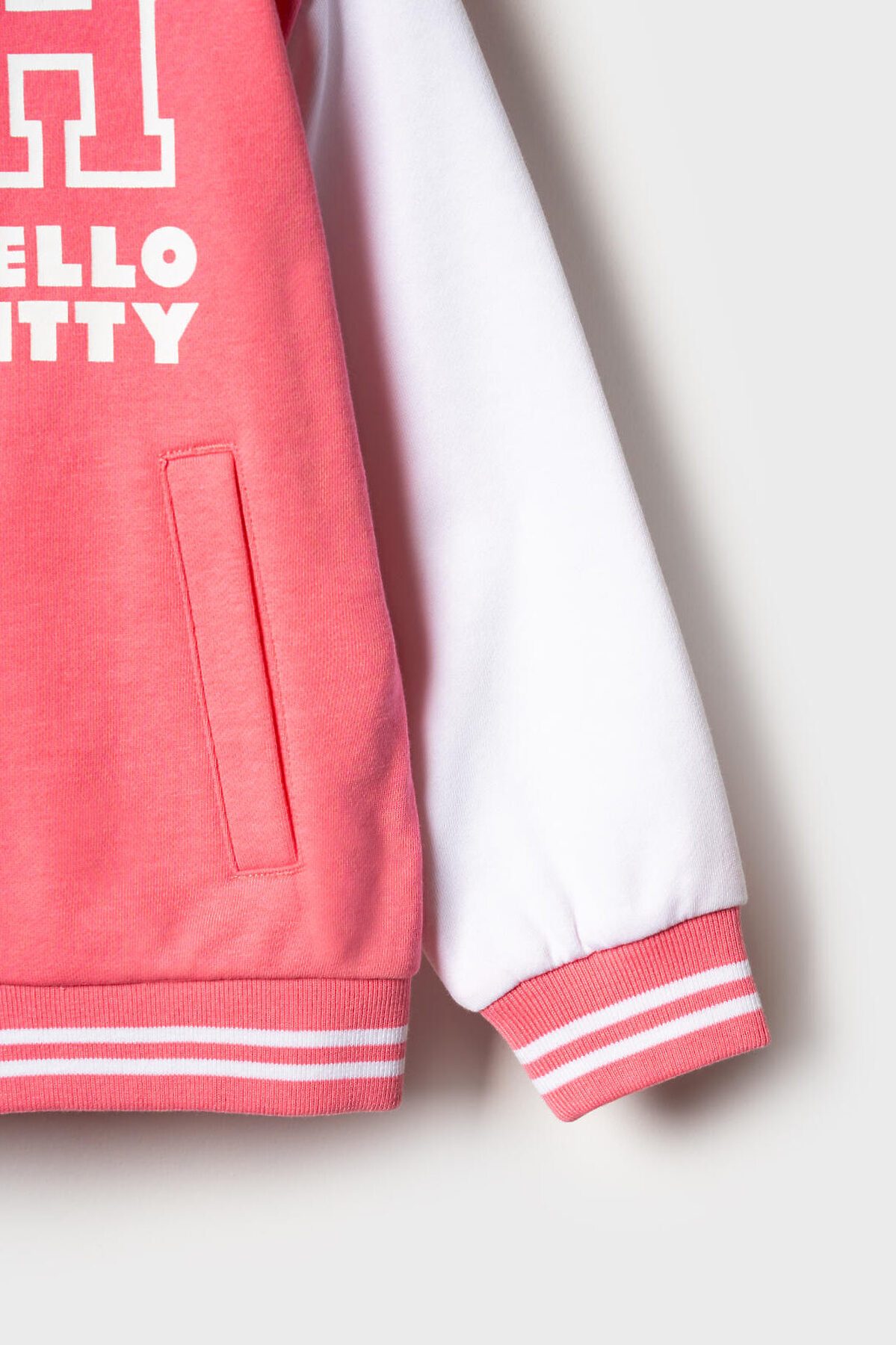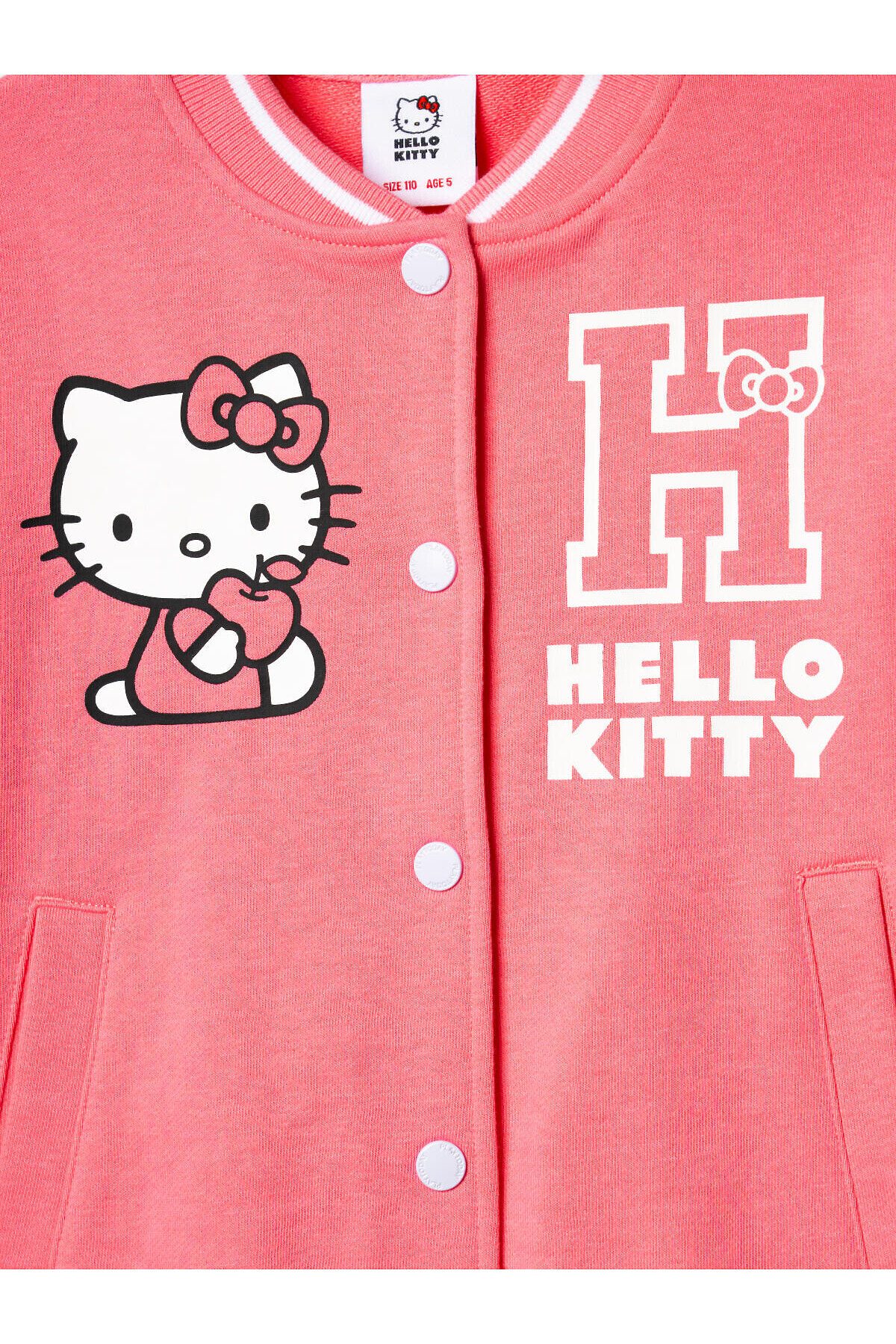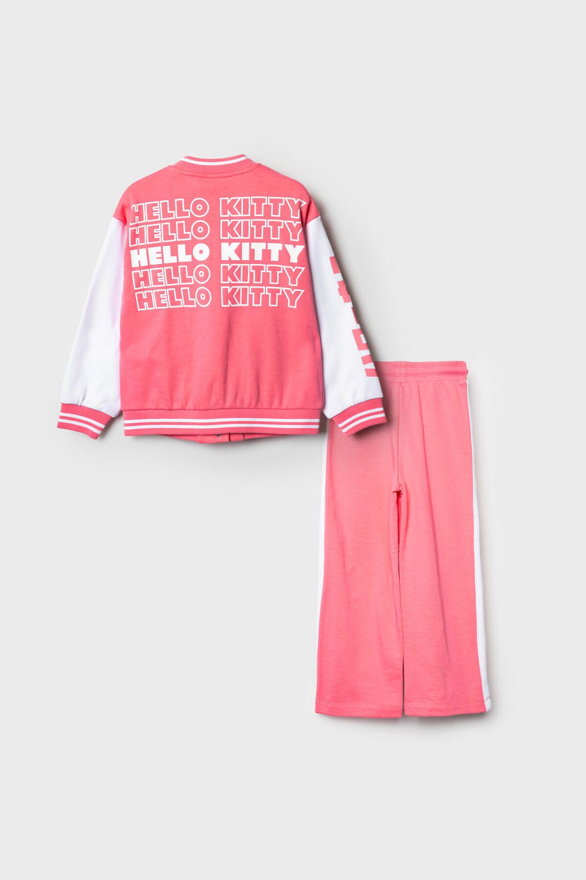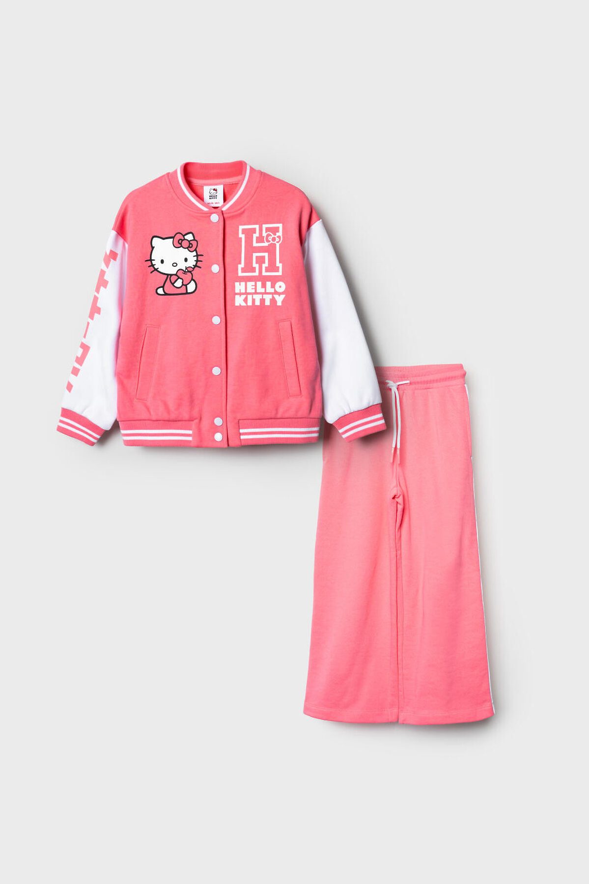 Детский спортивный костюм для девочки. Комплект выполнен из хлопкового футера и состоит из толстовки бомбера на кнопках и широких брюк на резинке. Толстовка прямого кроя с красочным принтом Хеллоу Китти. Боковые карманы. Манжеты и пояс выполнены из эластичного риба, благодаря чему изделие хорошо держит форму. Широкие брюки — комфортные, с эластичным поясом и шнуром для регулировки посадки. Удобные боковые карманы. Декоративные лампасы.