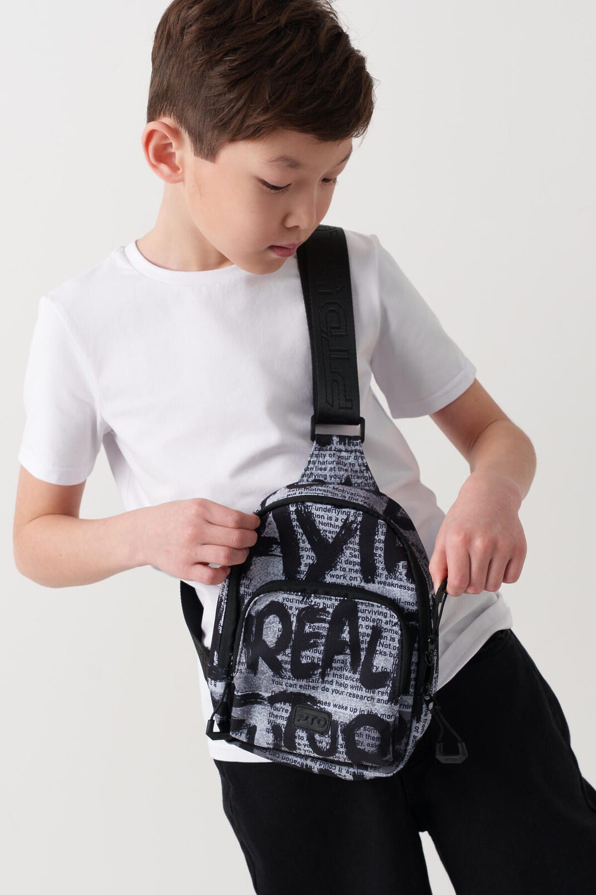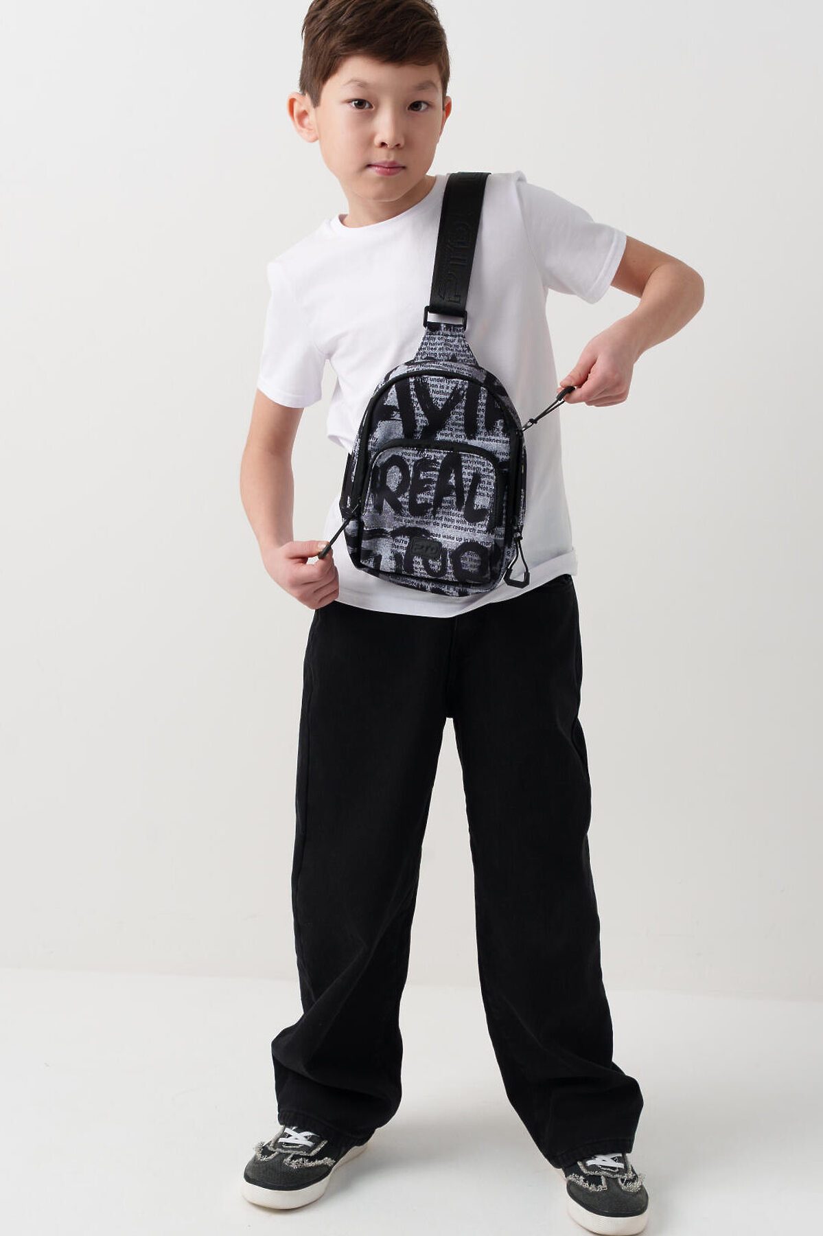 Трендовая сумка кросс-боди для мальчика-подростка. Регулируемый брендированный ремень. Основной отсек на молнии, спереди дополнительный карман на молнии, сзади карман для транспортной карты. Внутри есть карман на молнии. Параметры: высота - 18 см, ширина -13 см, глубина - 6 см.