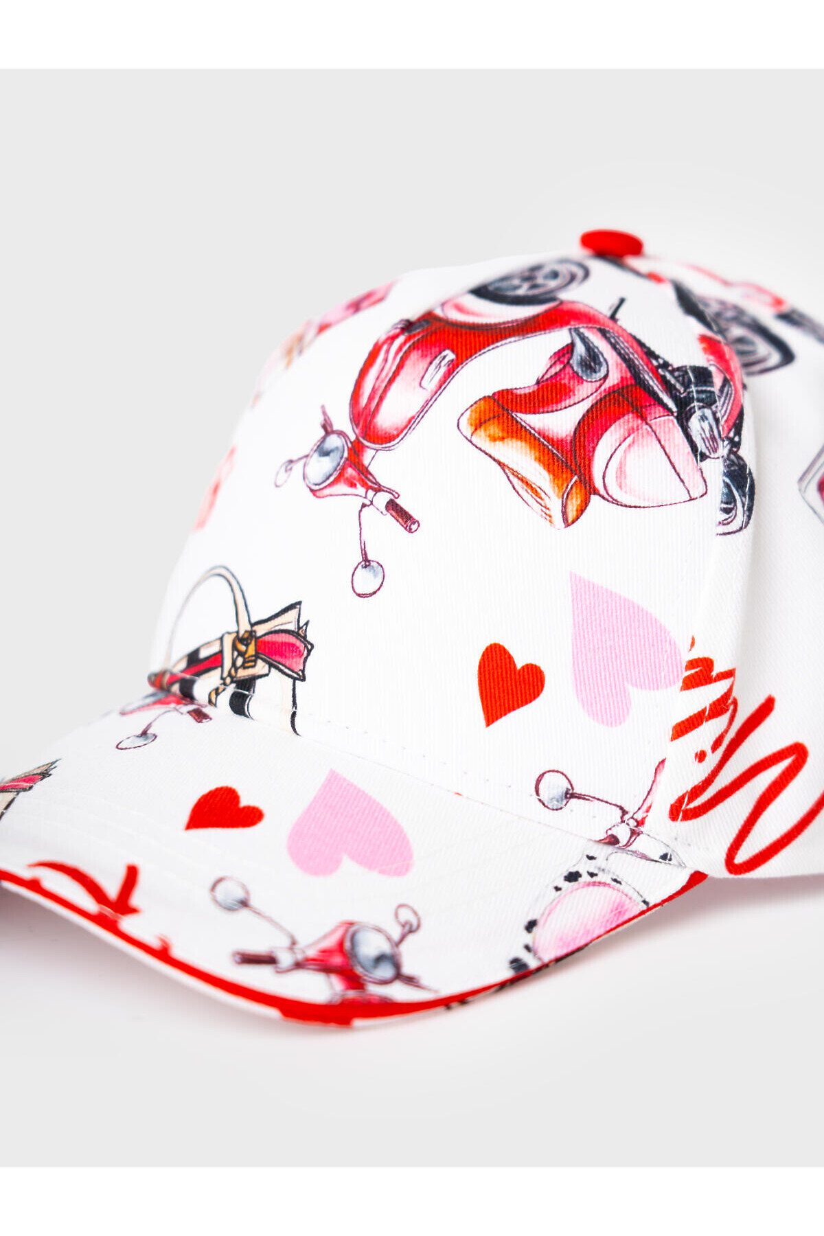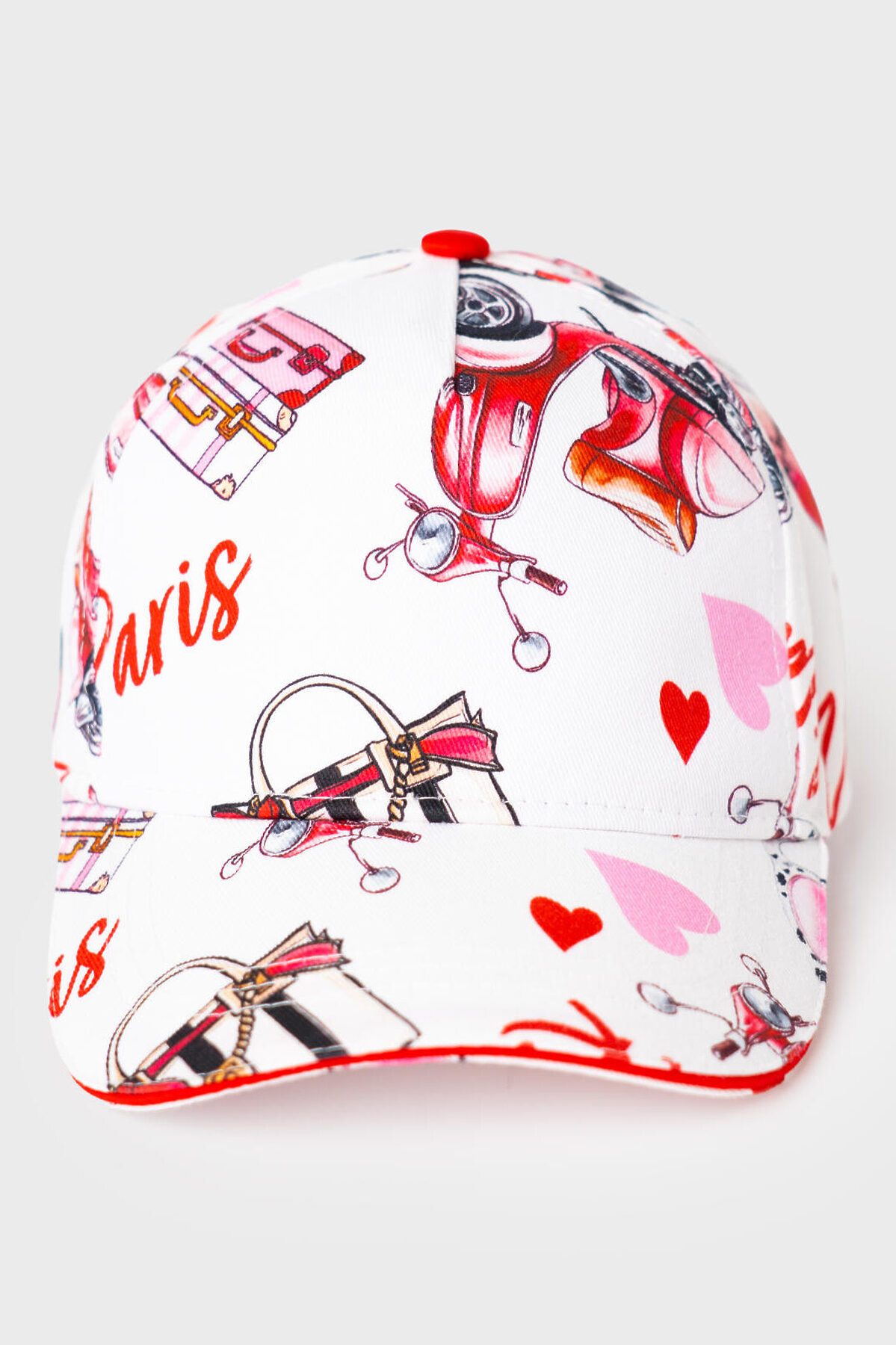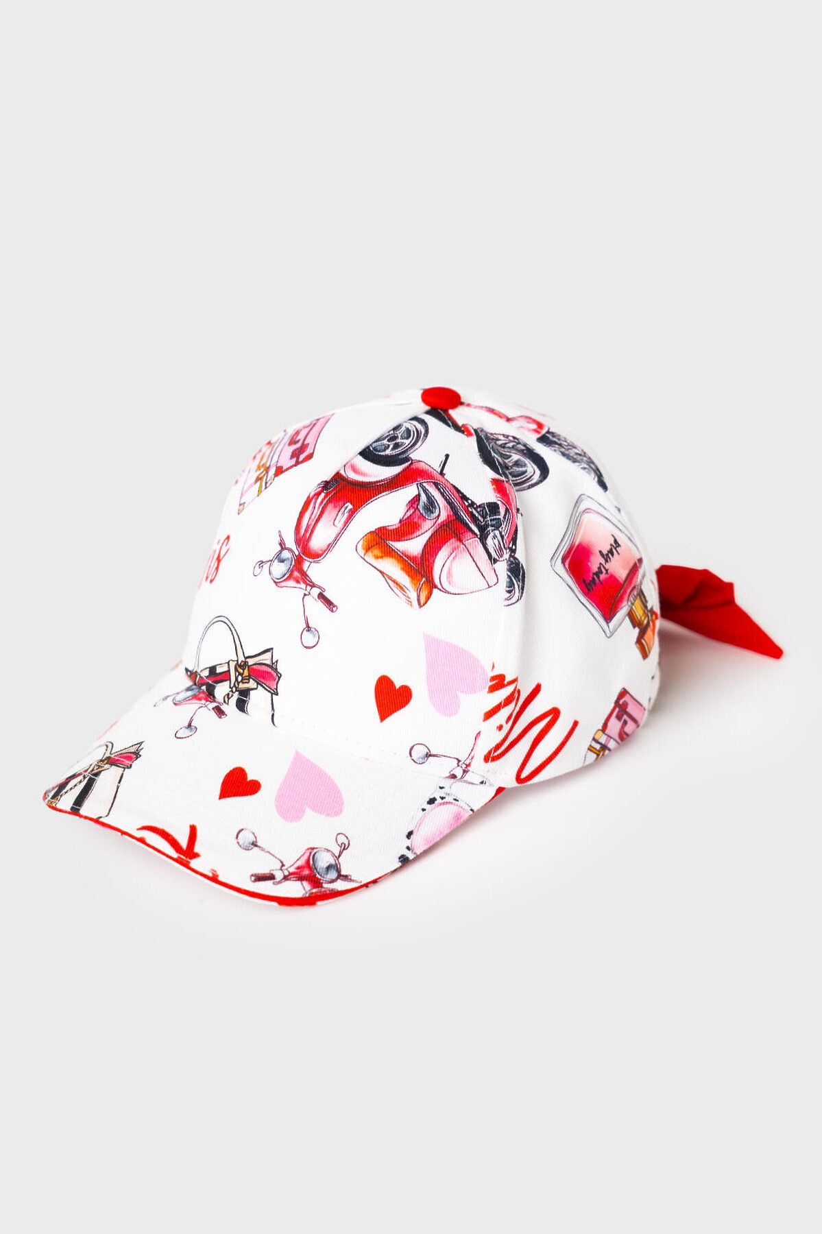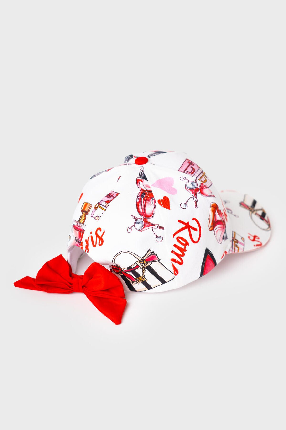 Стильная детская бейсболка для девочки. Выполнена из белой ткани с насыщенным принтом: духи, очки, скутер, сердечки и надписи. У бейсболки изогнутый козырек, классическая форма и вентиляционные отверстия. Особое внимание привлекает большой красный бантик на задней части — он делает изделие особенно нарядным.