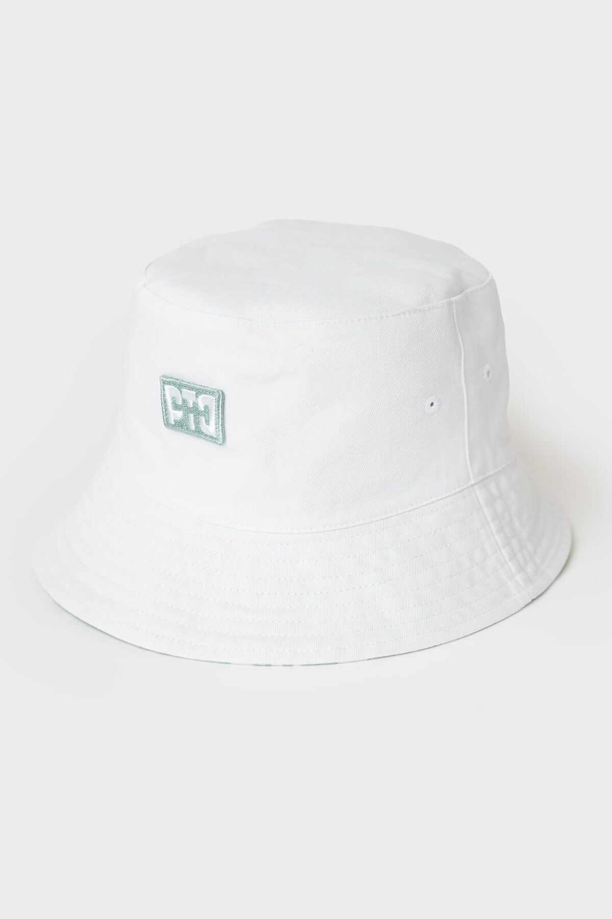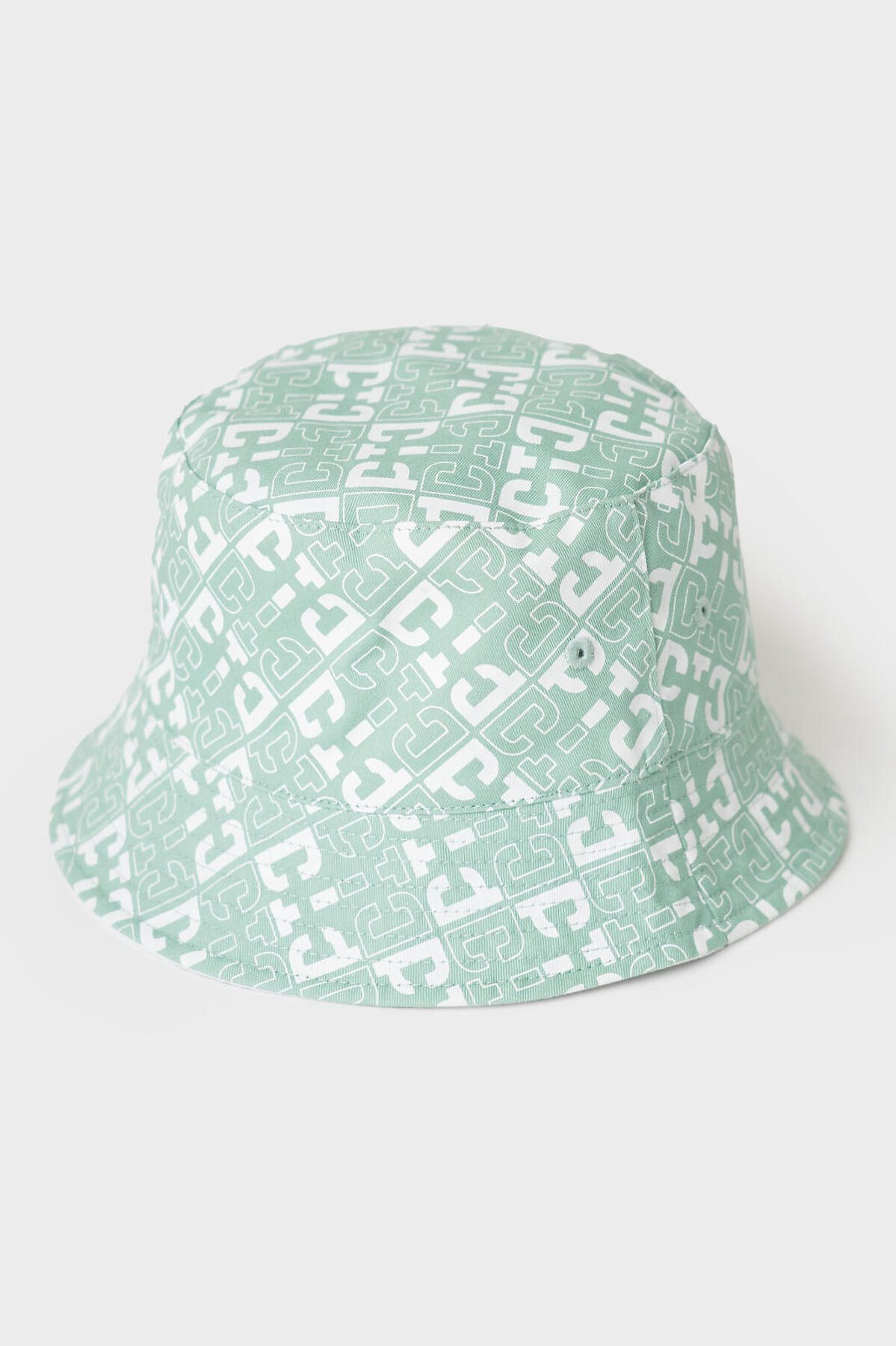 Двусторонняя детская панама для девочки. С одной стороны она полностью покрыта светло-зелёным принтом с логотипами, а с другой — однотонная белая с небольшим логотипом по центру. Панама выполнена из лёгкой хлопковой текстильной ткани, идеально подходящей для тёплой погоды. Поля средней ширины, мягко ниспадают и аккуратно отстрочены.
