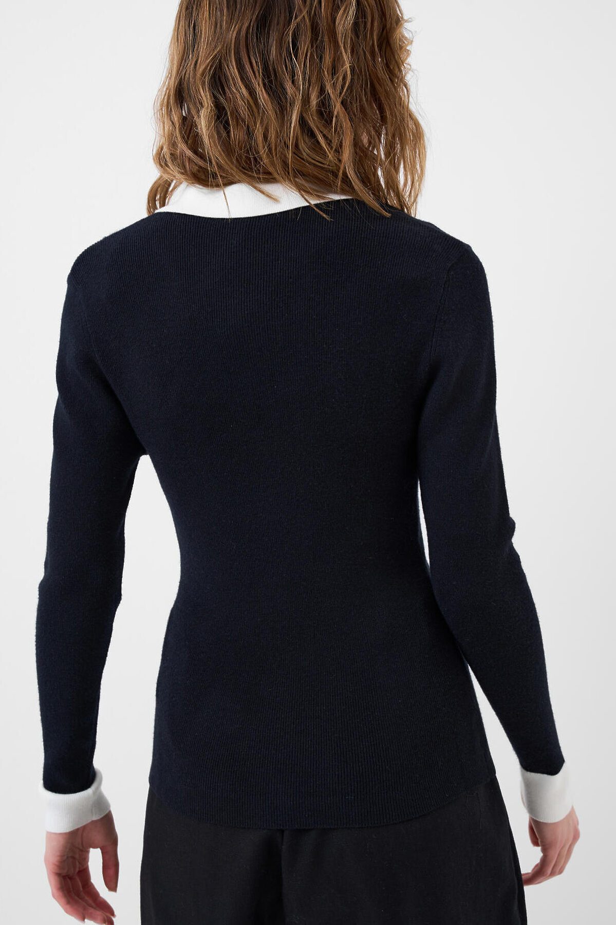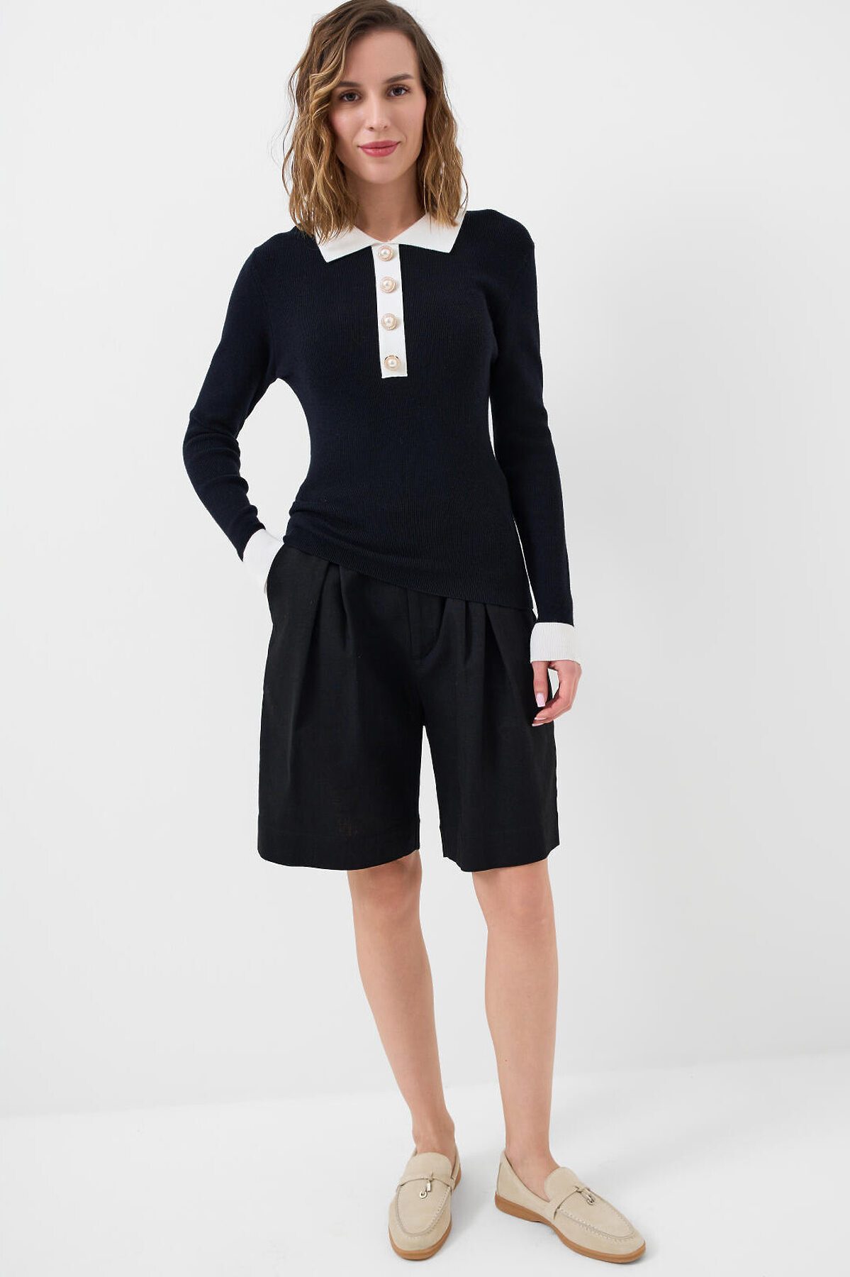 Женский джемпер. Модель с контрастным воротником поло и длинными рукавами. Застёжка на четыре пуговицы спереди. Изделие выполнено из мягкого вязаного трикотажа.