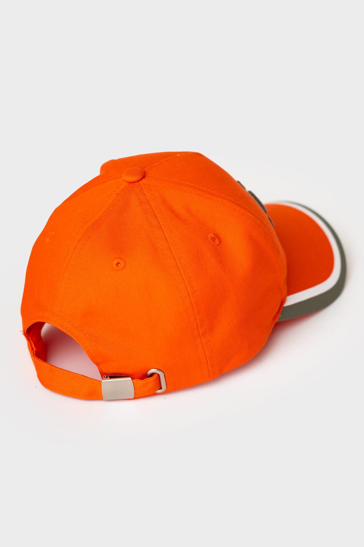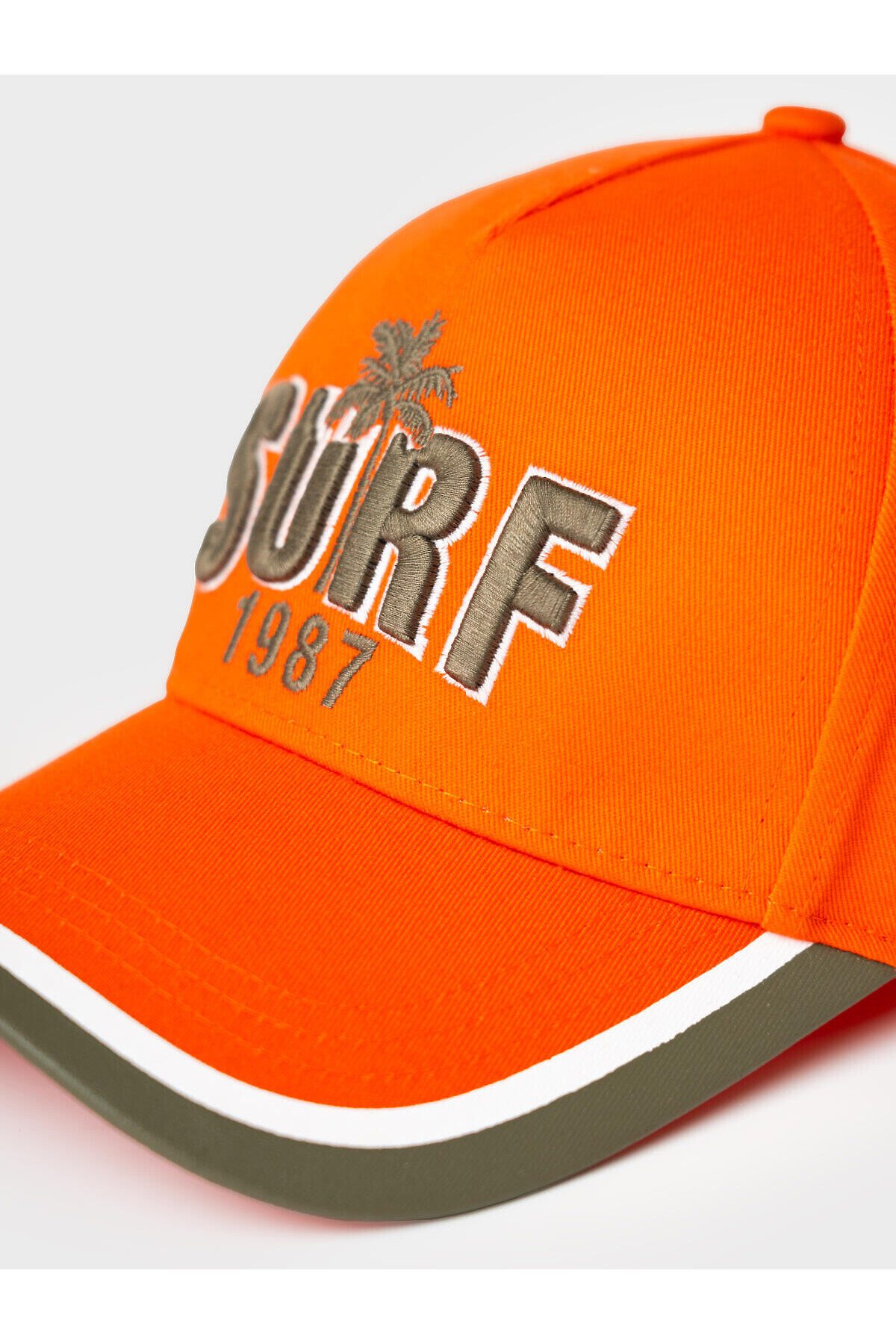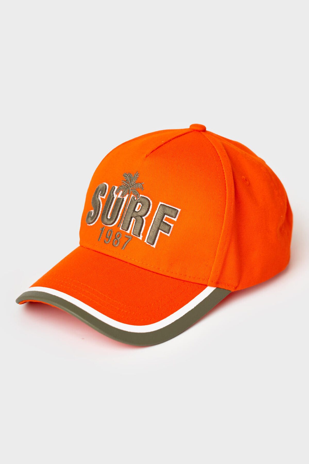 Бейсболка для мальчика подростка. Выполнена в ярком оранжевом цвете с жёстким изогнутым козырьком и контрастной отделкой по краю. Спереди — крупная вышивка, изображением пальмы. Сзади есть регулируемая застежка с металлической пряжкой. Вентиляционные отверстия.