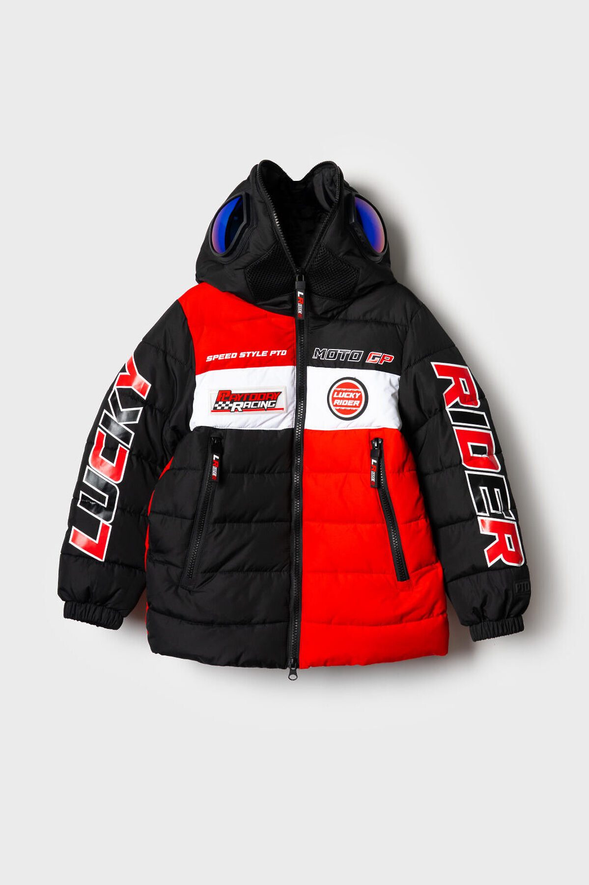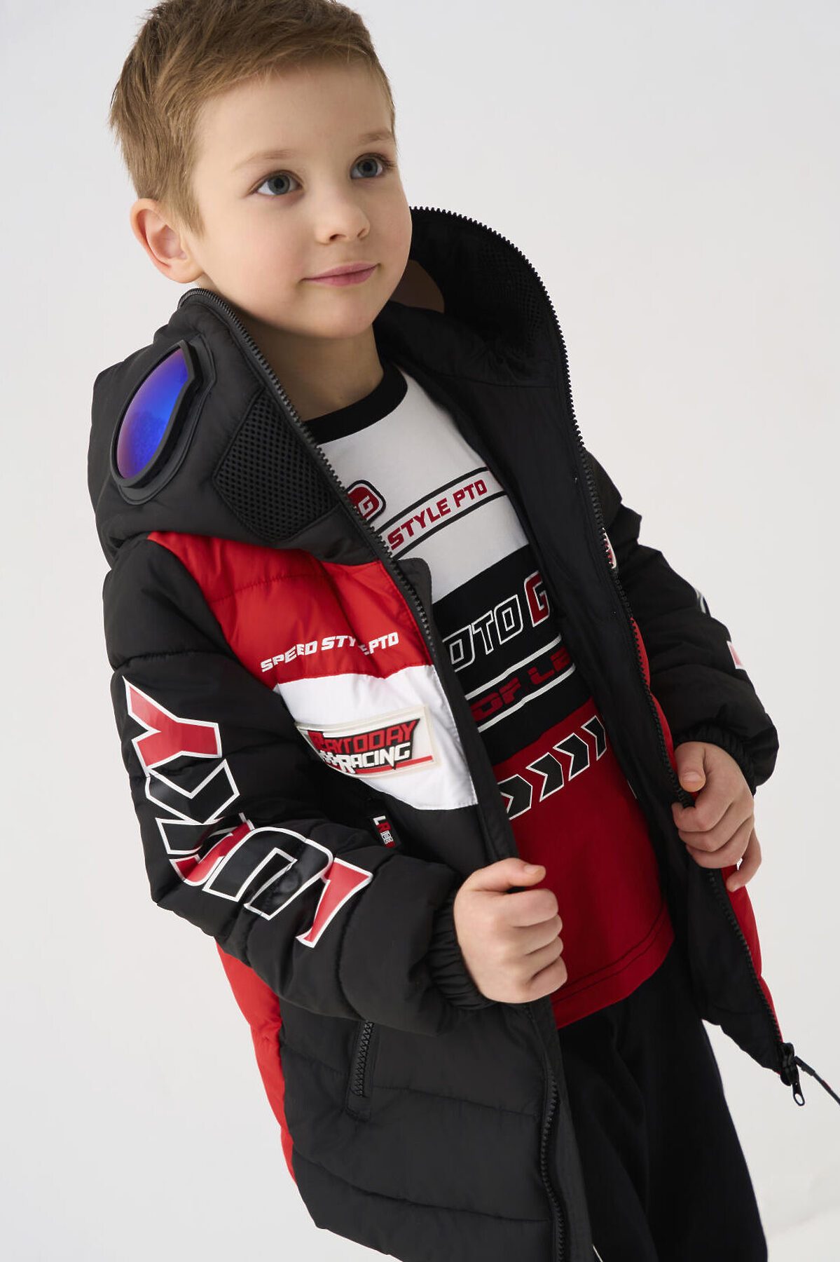 Удлинённая демисезонная детская куртка для мальчика. Температурный режим от +15С до 0С. Ткань с ветрозащитным и водоотталкивающим покрытием. Внутри гладкая подкладка. Капюшон несъемный с декоративными очками и отверстием для дыхания. Два боковых кармана на молнии. Внутренний карман на липучке. Низ куртки на утяжке стопперами. На спинке расположен светоотражающий элемент для безопасности в тёмное время суток.