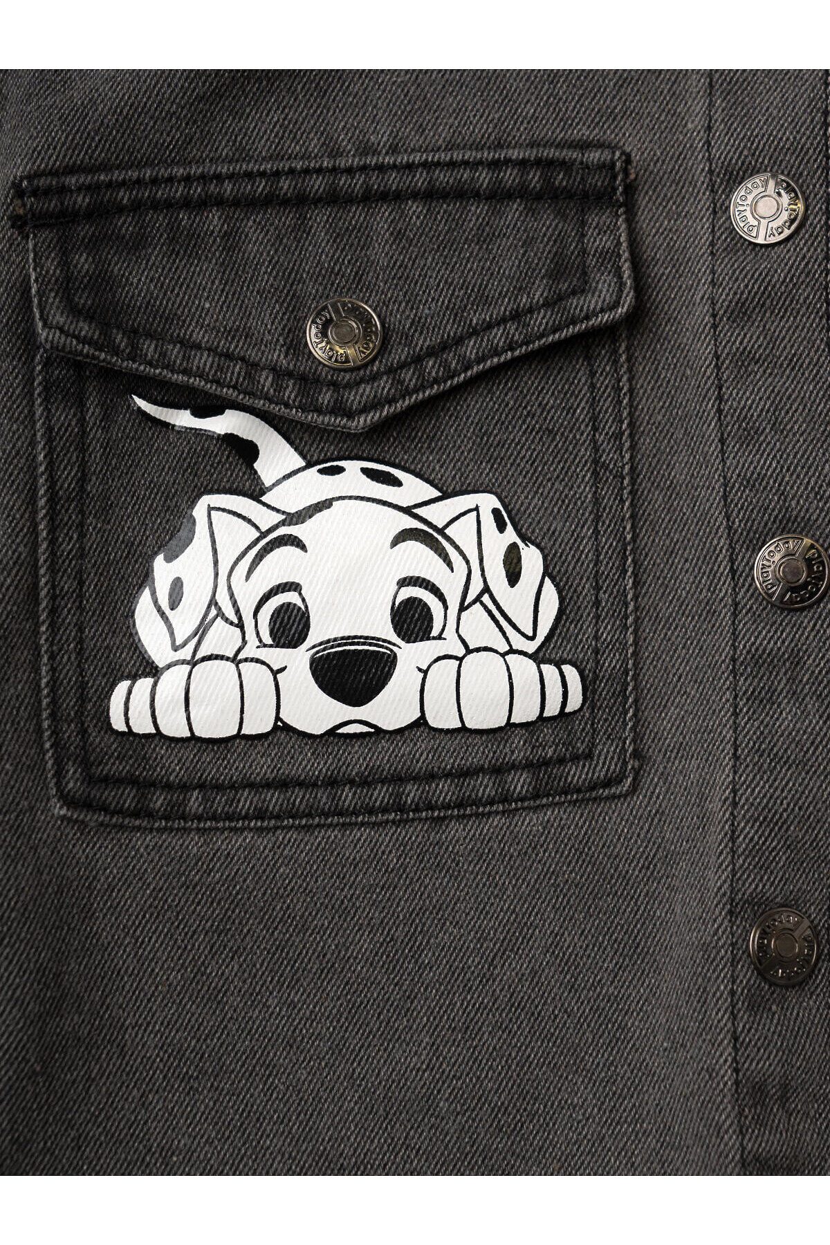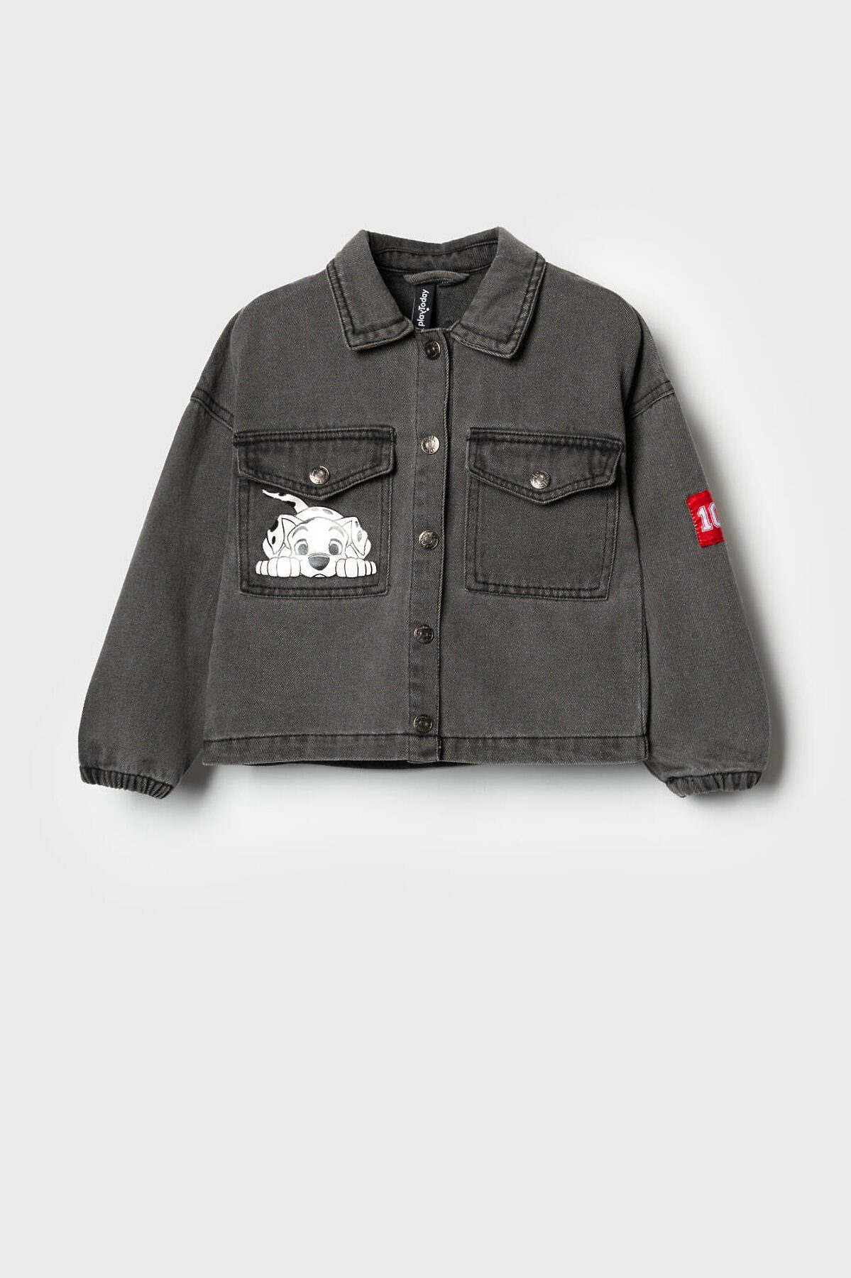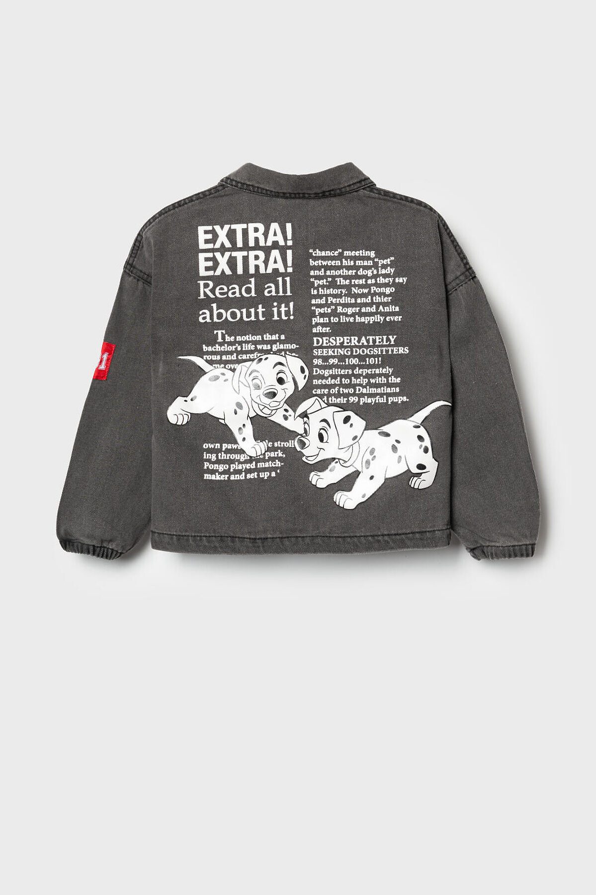 Детская джинсовая куртка для девочки. Застежка по центру на кнопках. Спереди — два накладных кармана с кнопками. На левом кармане и спинке принт с любимыми героями из мультфильма 1101 далматинец. Дополнительный акцент — красная нашивка с цифрой "101" на правом рукаве. Манжеты обработаны эластичной резинкой, а воротник выполнен в классическом стиле. Яркая и запоминающаяся модель с узнаваемым дизайном.
