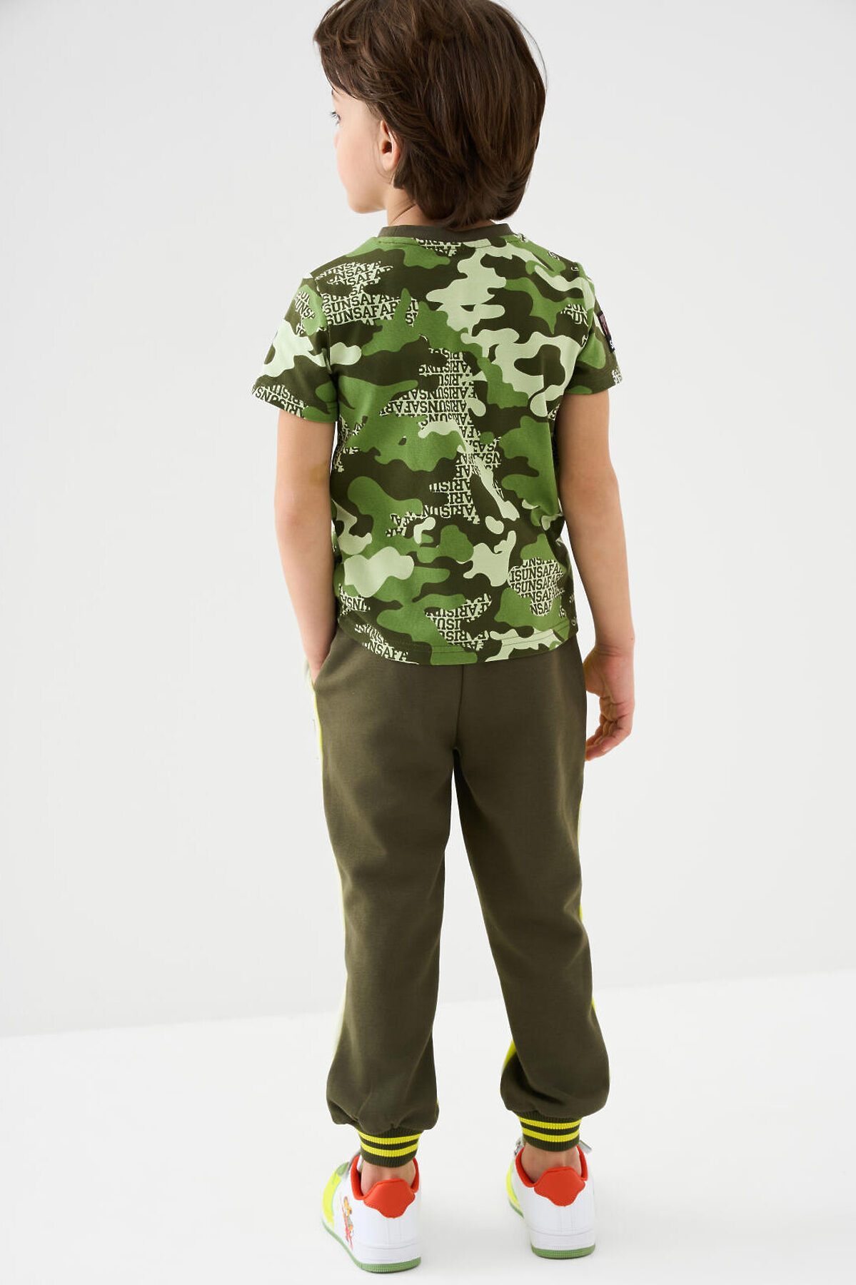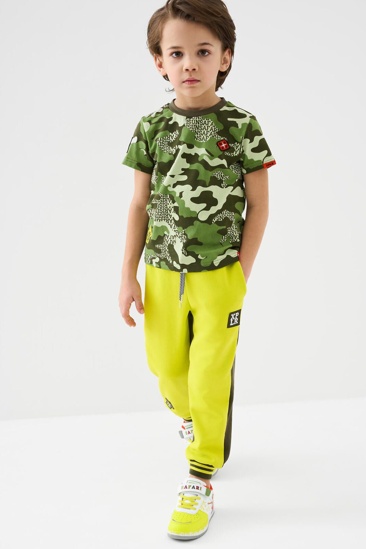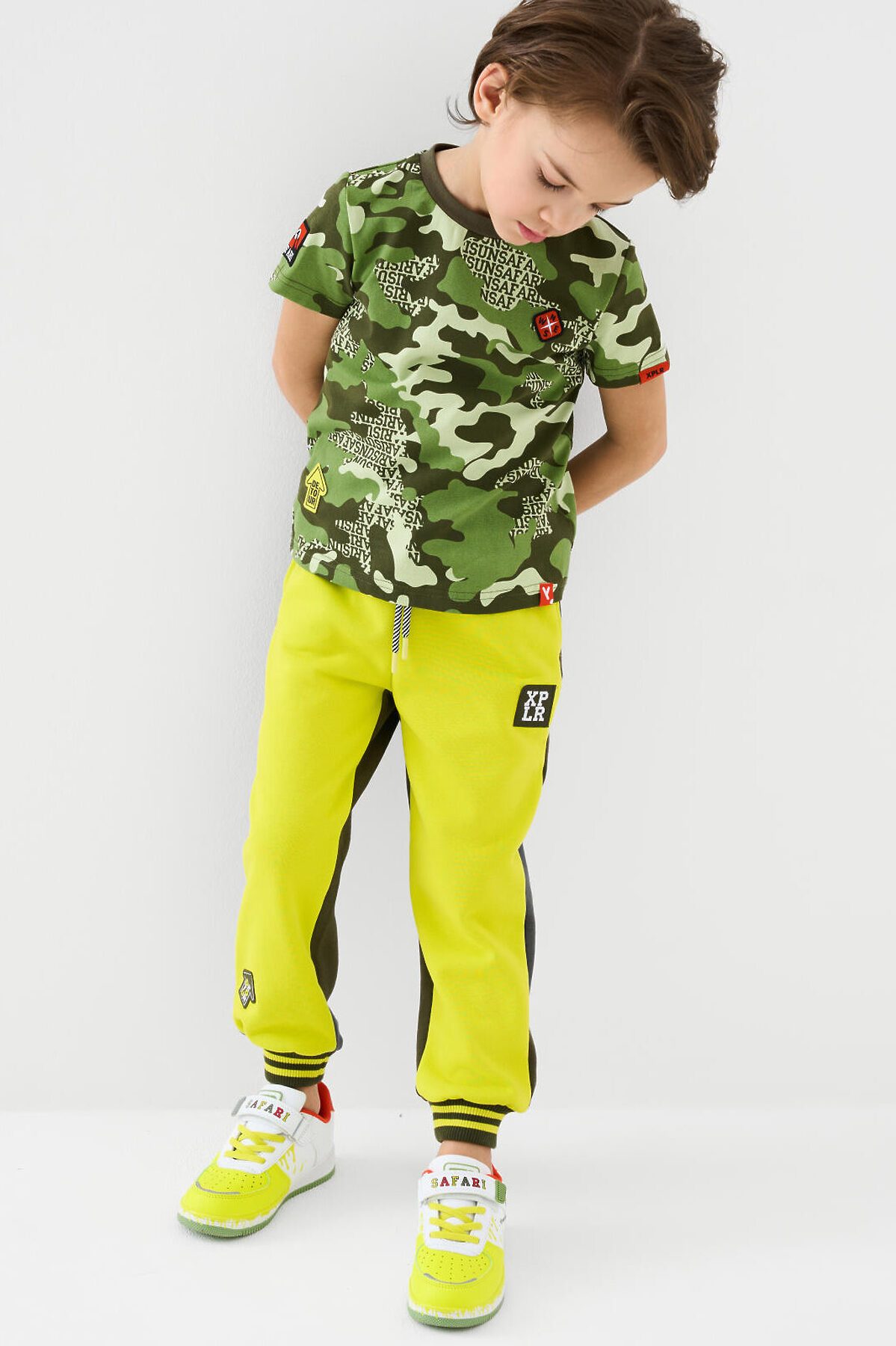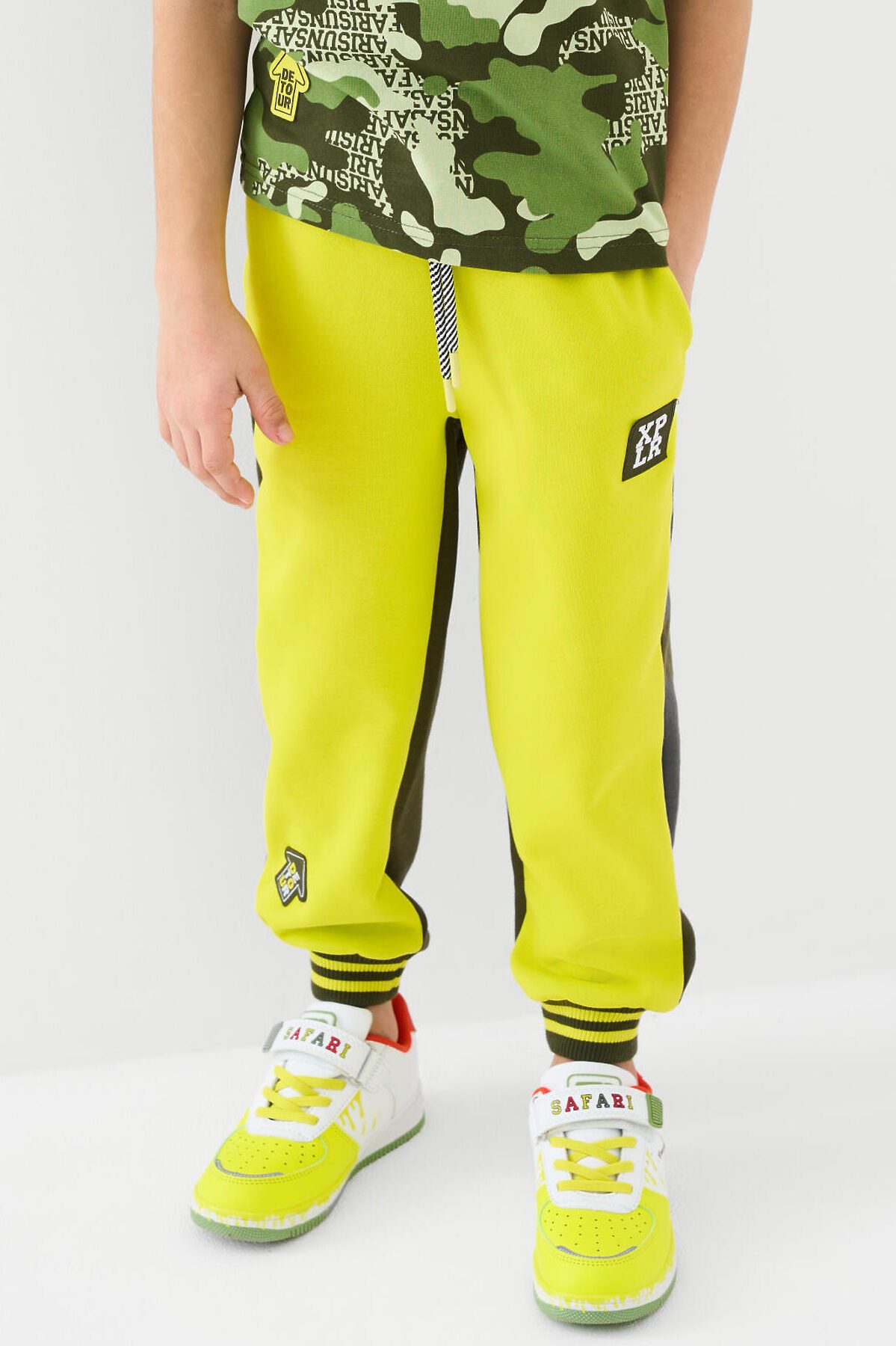 Брюки-джоггеры детские для мальчика. Выполнены из хлопкового трикотажа футер без начеса. Модель прямого кроя со средней посадкой на талии. Пояс выполнен на резинке, дополнительно регулируется шнурком. По бокам — удобные карманы. В нижней части брючин предусмотрены эластичные трикотажные манжеты для лучшей фиксации. Брюки украшены нашивками.