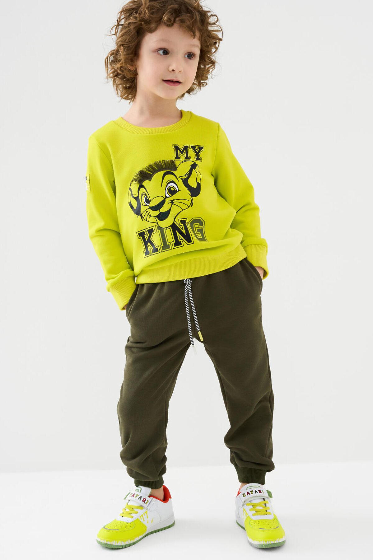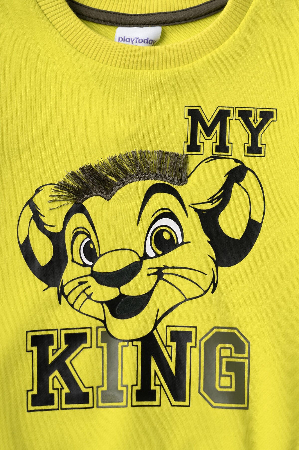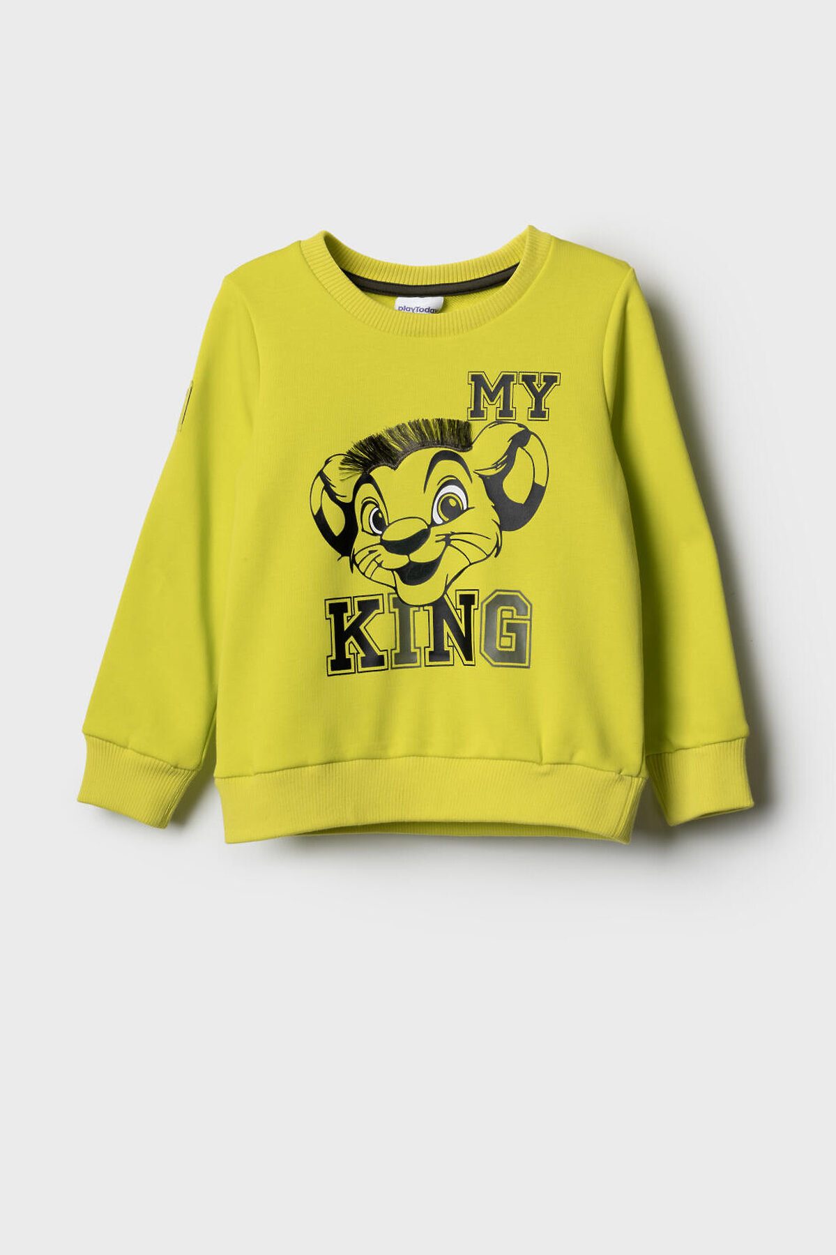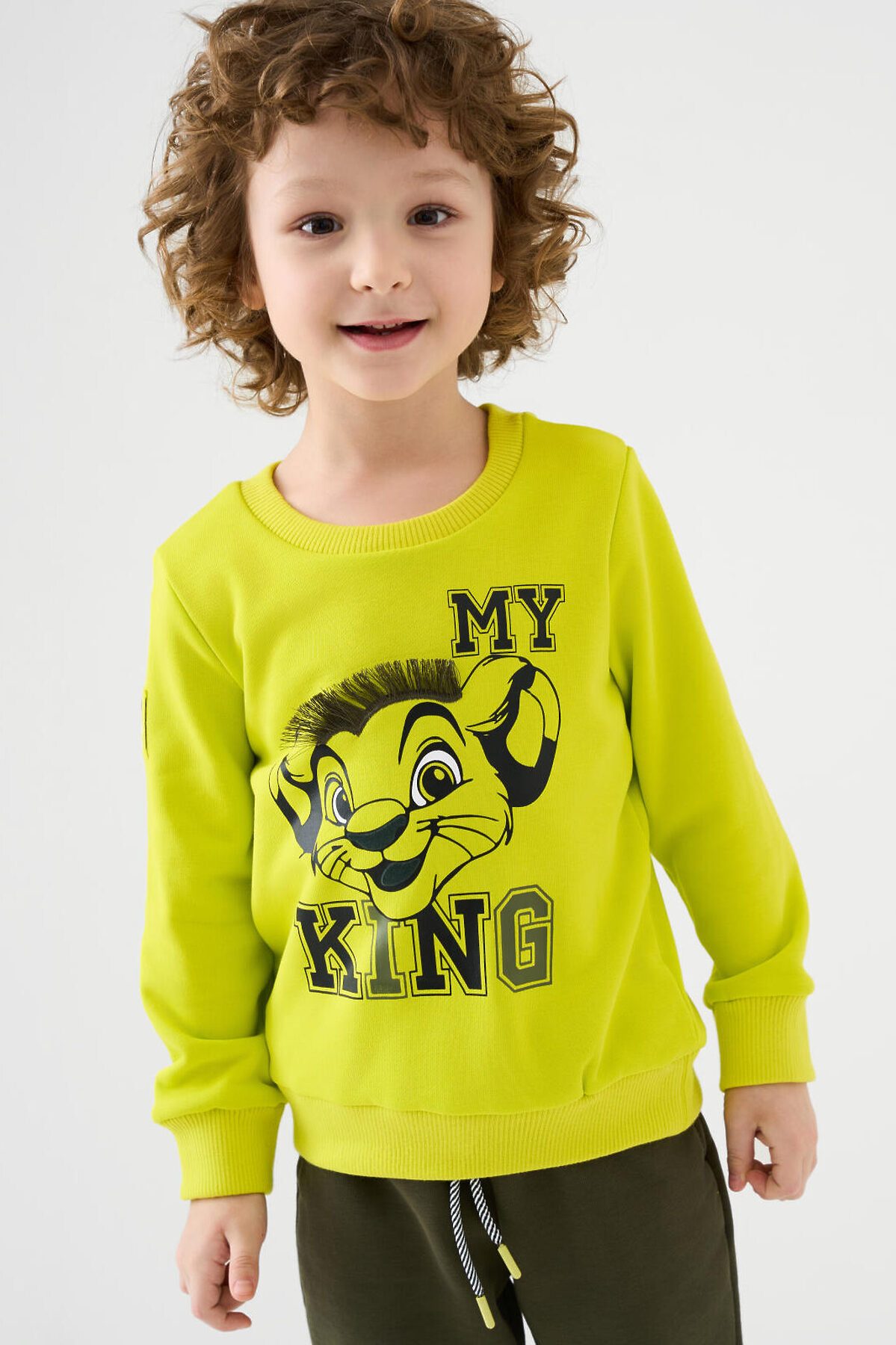 Свитшот детский для мальчика. Выполнен из хлопкового футера без начеса. Прямой крой. На груди — принт с героем из любимого мультфильма "Король Лев". На рукаве - объемная силиконовая нашивка. Манжеты и низ изделия выполнены из эластичного риба, что обеспечивает комфортную посадку.
