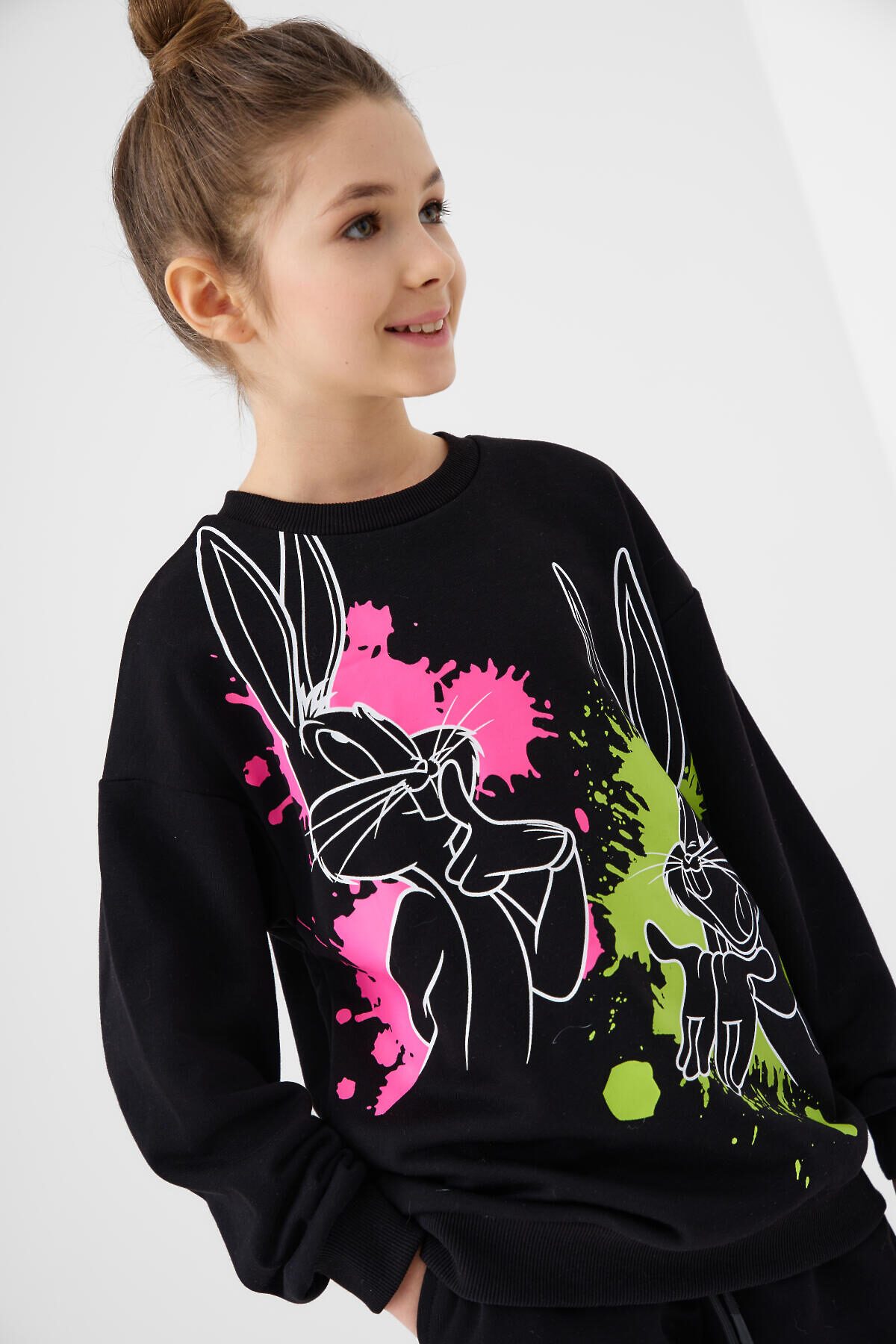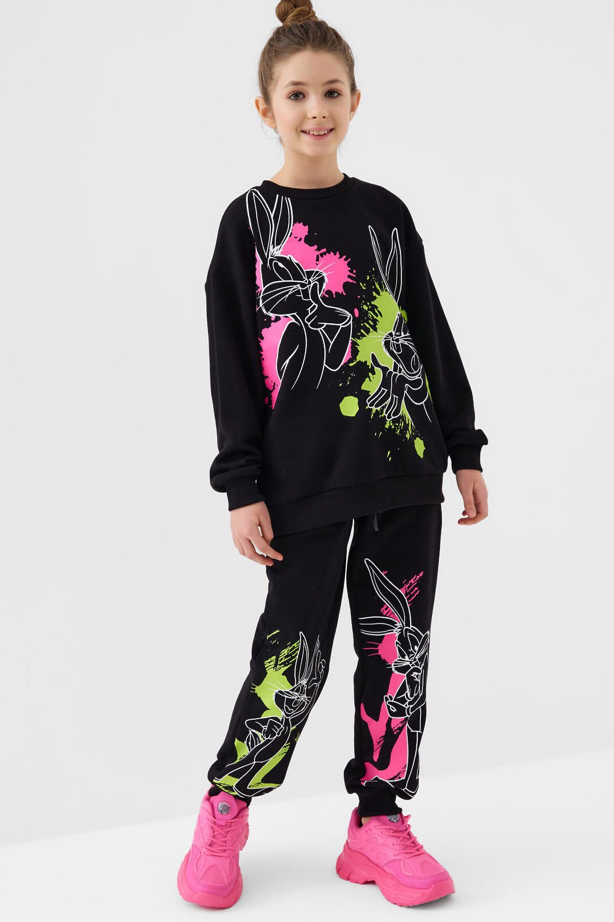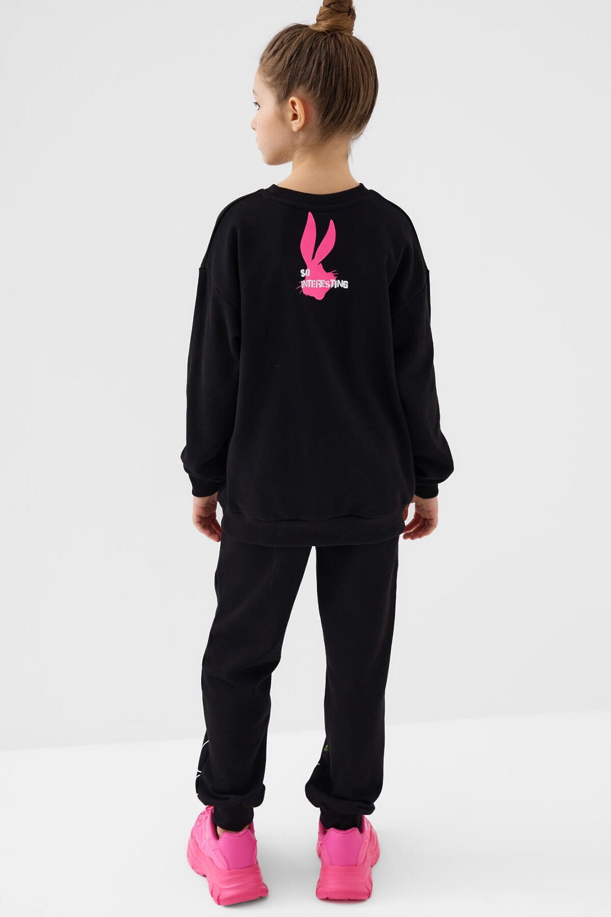 Спортивный костюм для девочки подростка. Комплект выполнен из хлопкового футера и состоит из свитшота и джогеров на резинке. Толстовка оверсайз с красочным принтом. Манжеты и пояс выполнены из эластичного риба, благодаря чему изделие хорошо держит форму. Брюки джоггеры — комфортные, с эластичным поясом и шнуром для регулировки посадки. Удобные боковые карманы. Низ штанин собран на резинку.
