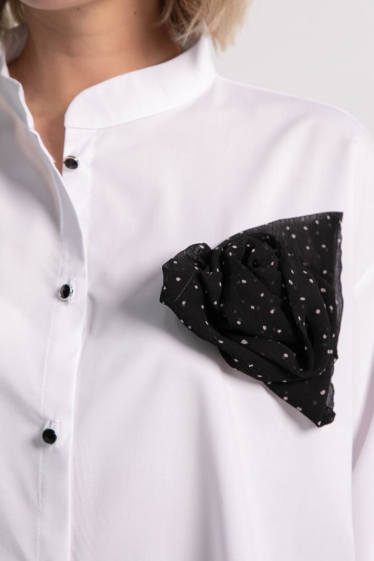 Идеальное сочетание стиля и комфорта воплощено в этой уникальной модели рубашки. Свободный крой и рукава со спущенным плечевым швом подчеркнут вашу свободу движения и создадут атмосферу непринужденности. Асимметричный низ придаёт образу оригинальность и выразительность. Уникальным акцентом данной модели является дизайнерская роза ручной работы и декоративные пуговицы, которые придают рубашке индивидуальность и изысканность. Сочетая в себе комфорт и стиль, эта рубашка станет отличным дополнением вашего гардероба, позволяя вам выделяться в любой обстановке!