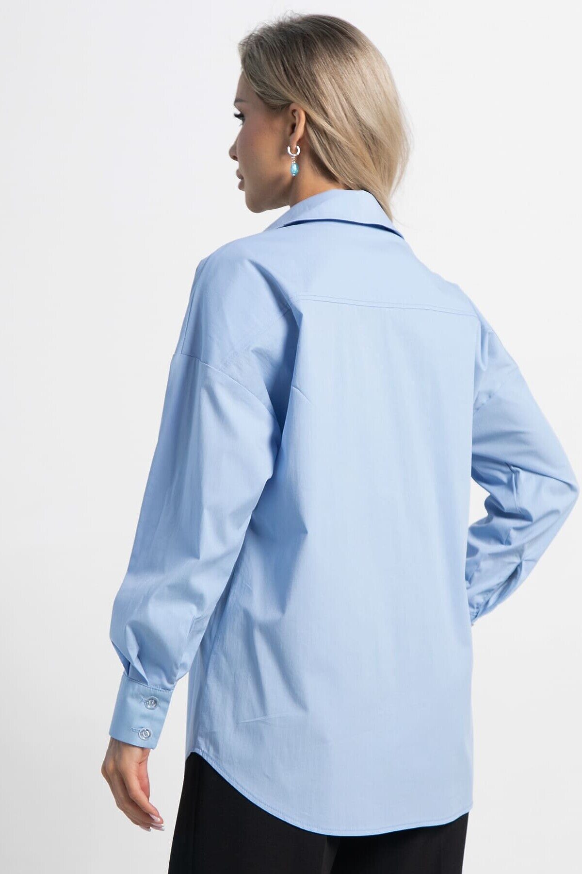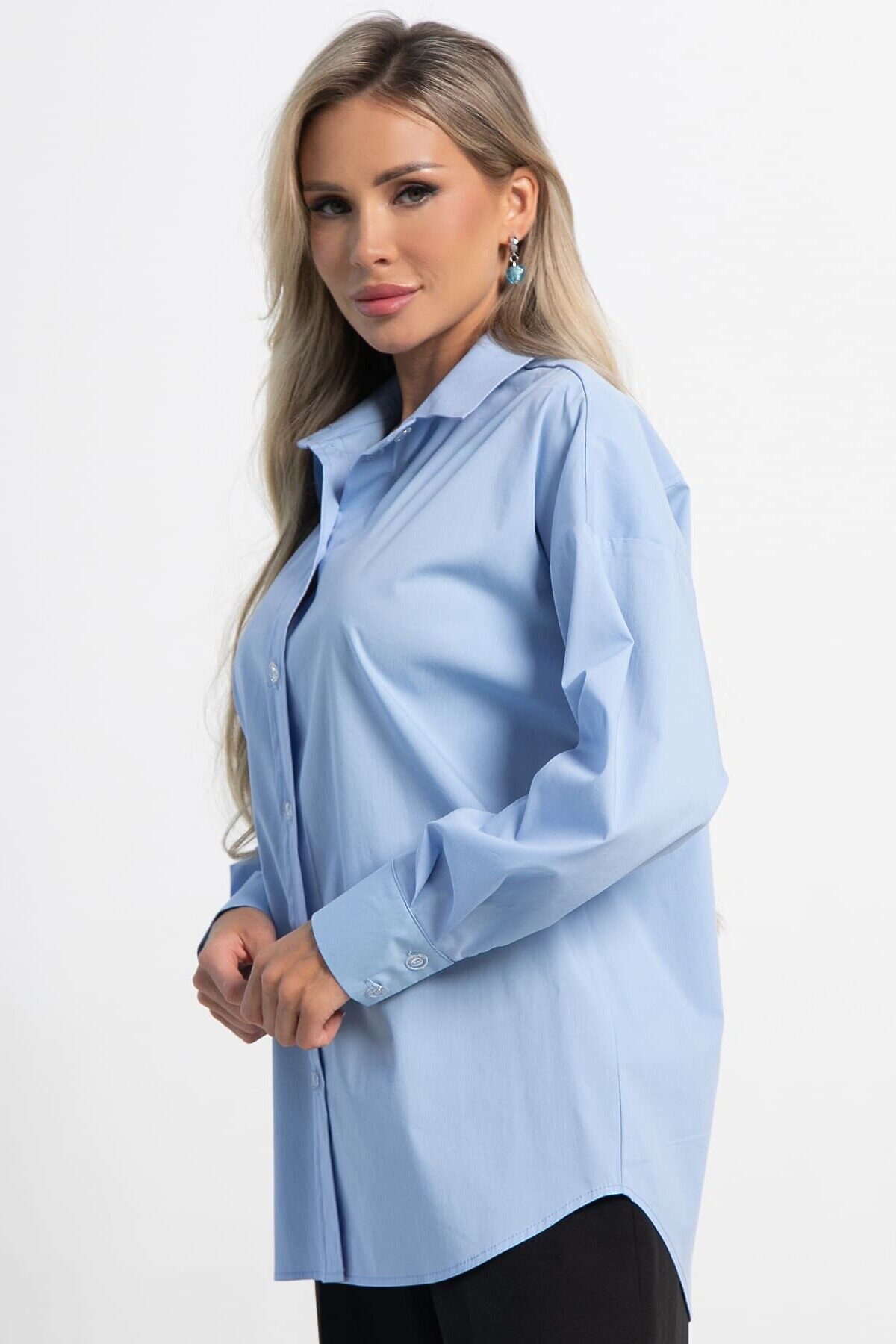 Голубая базовая рубашка — это «чистый холст» вашего гардероба. Она уместна везде: от деловой встречи до пляжной прогулки. Правильно выбранная модель прослужит долго и выручит в ситуации «нечего надеть». Классический прямой крой и легкий оверсайз — прекрасное сочетание для любого типа фигуры. Не облегает, но и не висит мешком и, главное, не полнит. Подходит для офиса.