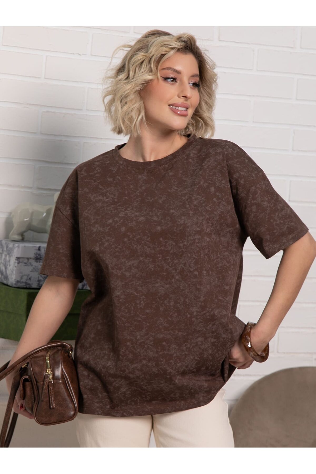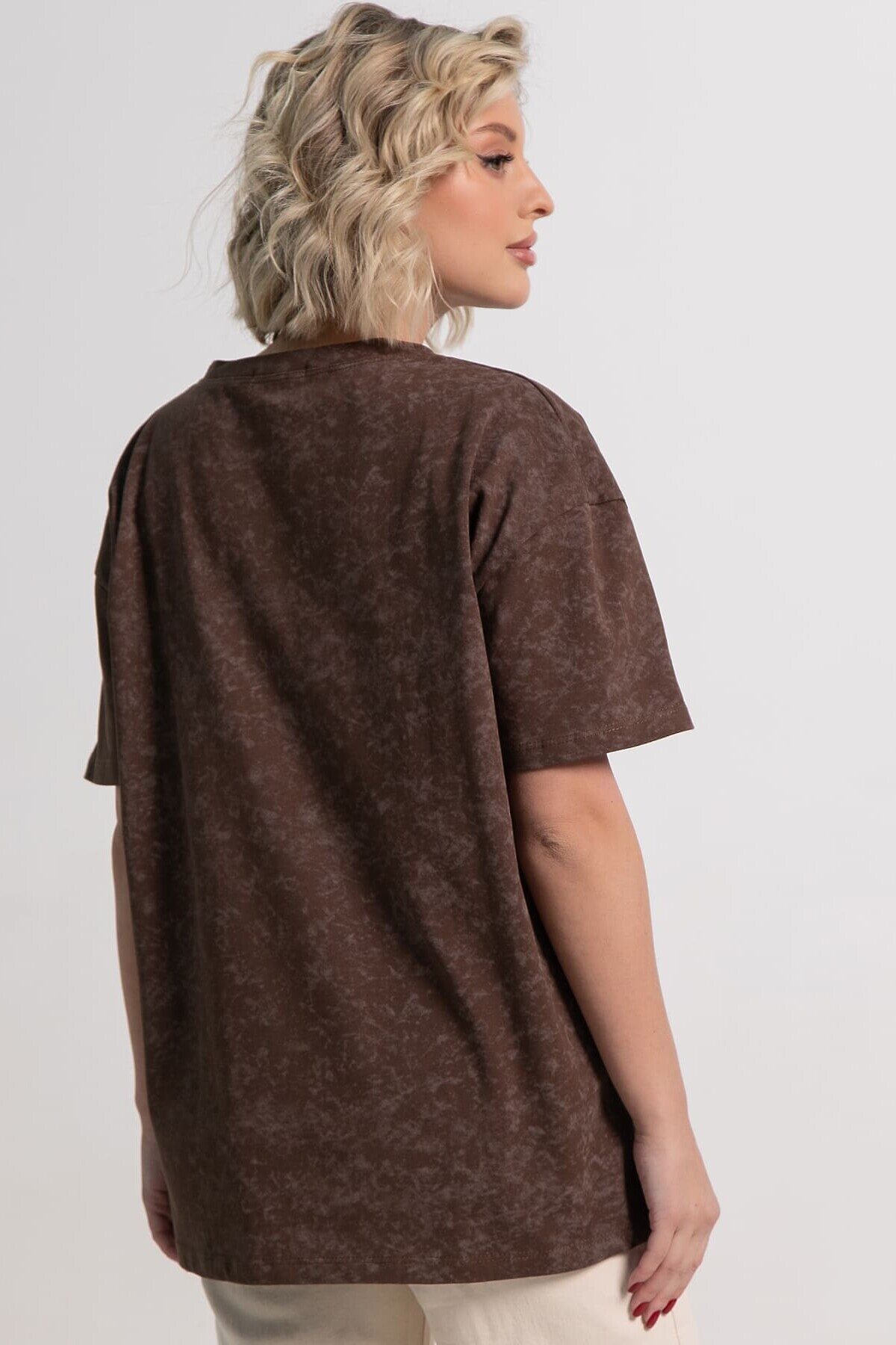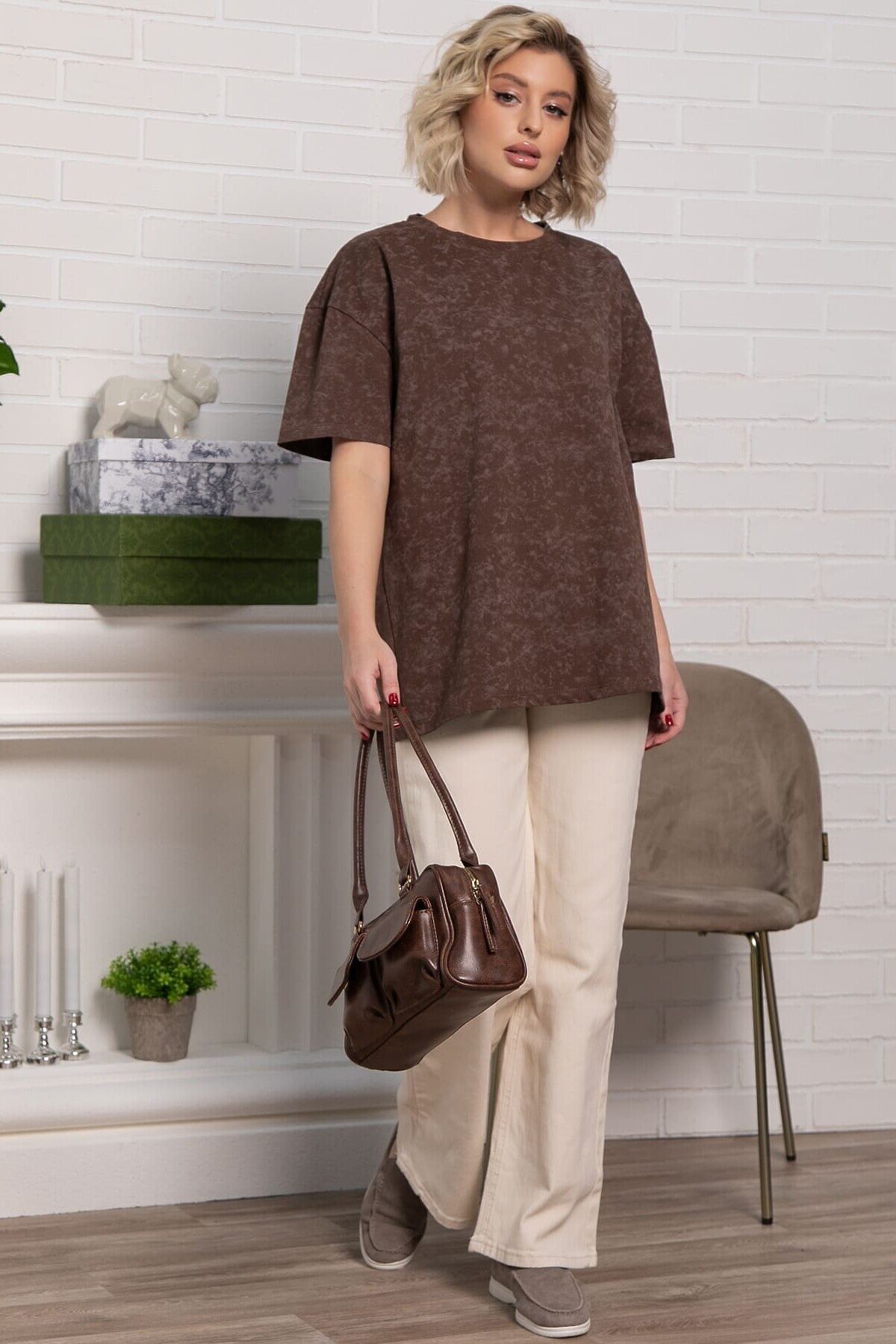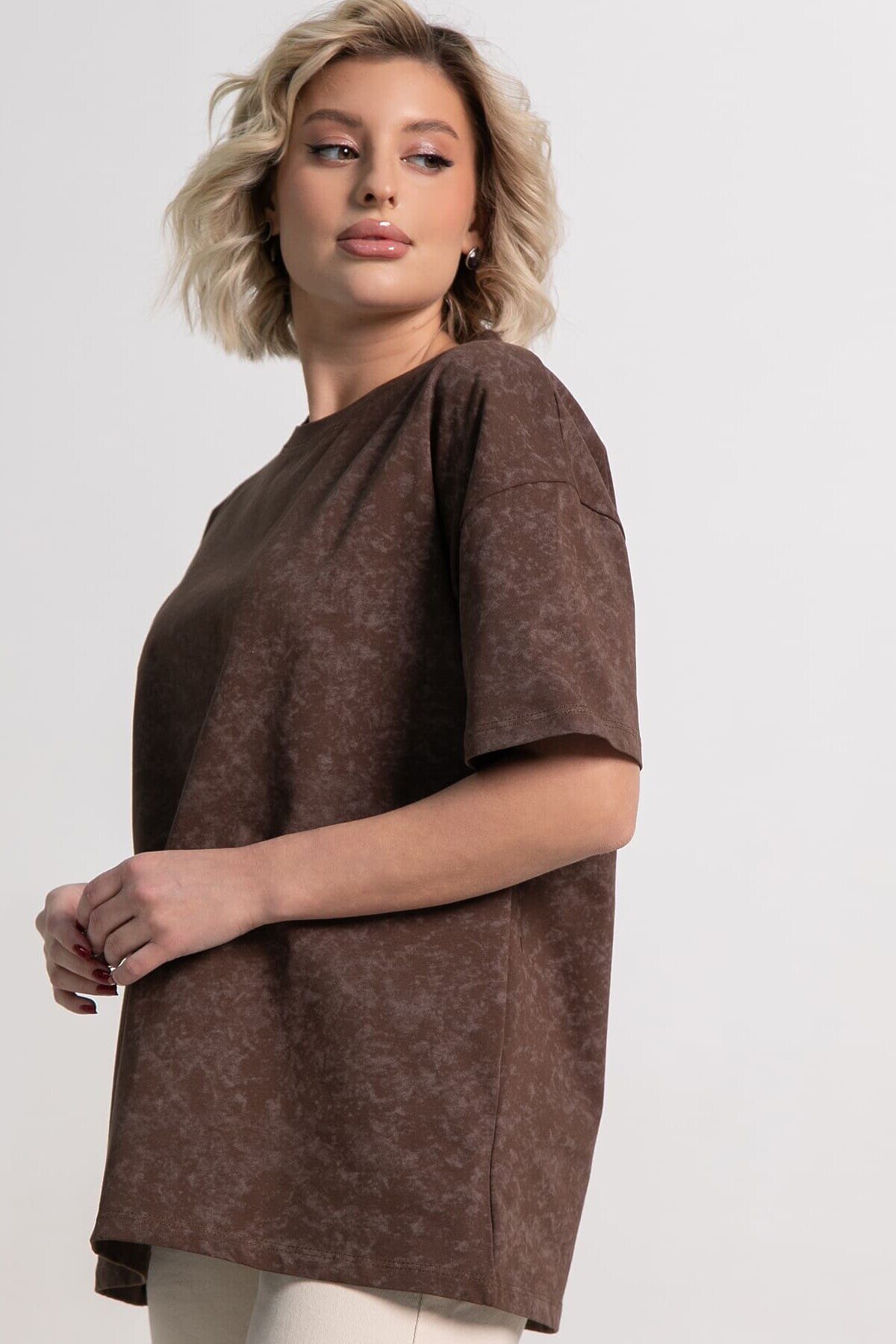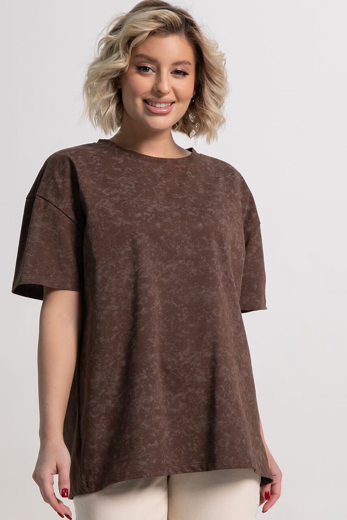 Футболка в шоколадной расцветке с принтом «варенки» и свободным кроем — идеальный выбор для создания повседневного образа. Округлая горловина и рукава со спущенным плечевым швом придают ей расслабленный и модный вид. Она легко сочетается с разными стилями, добавляя комфорт и элегантность.