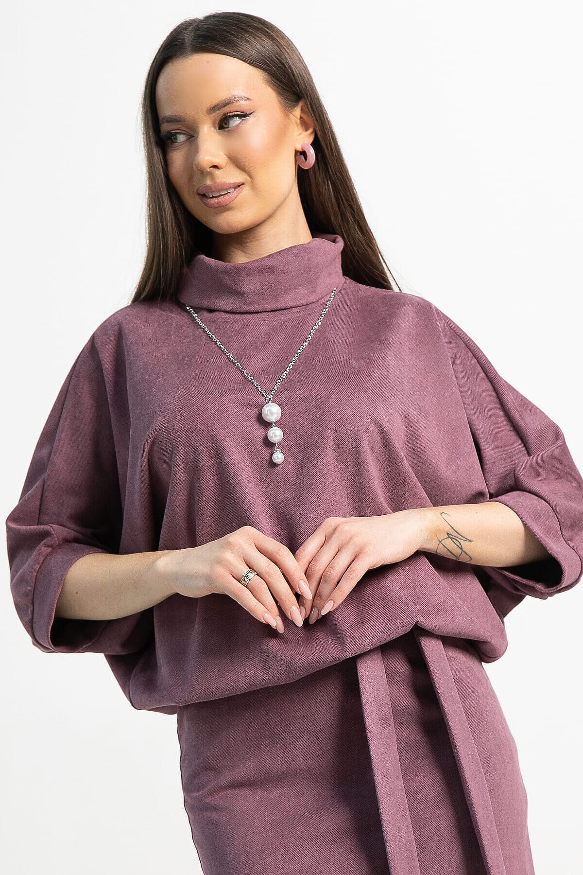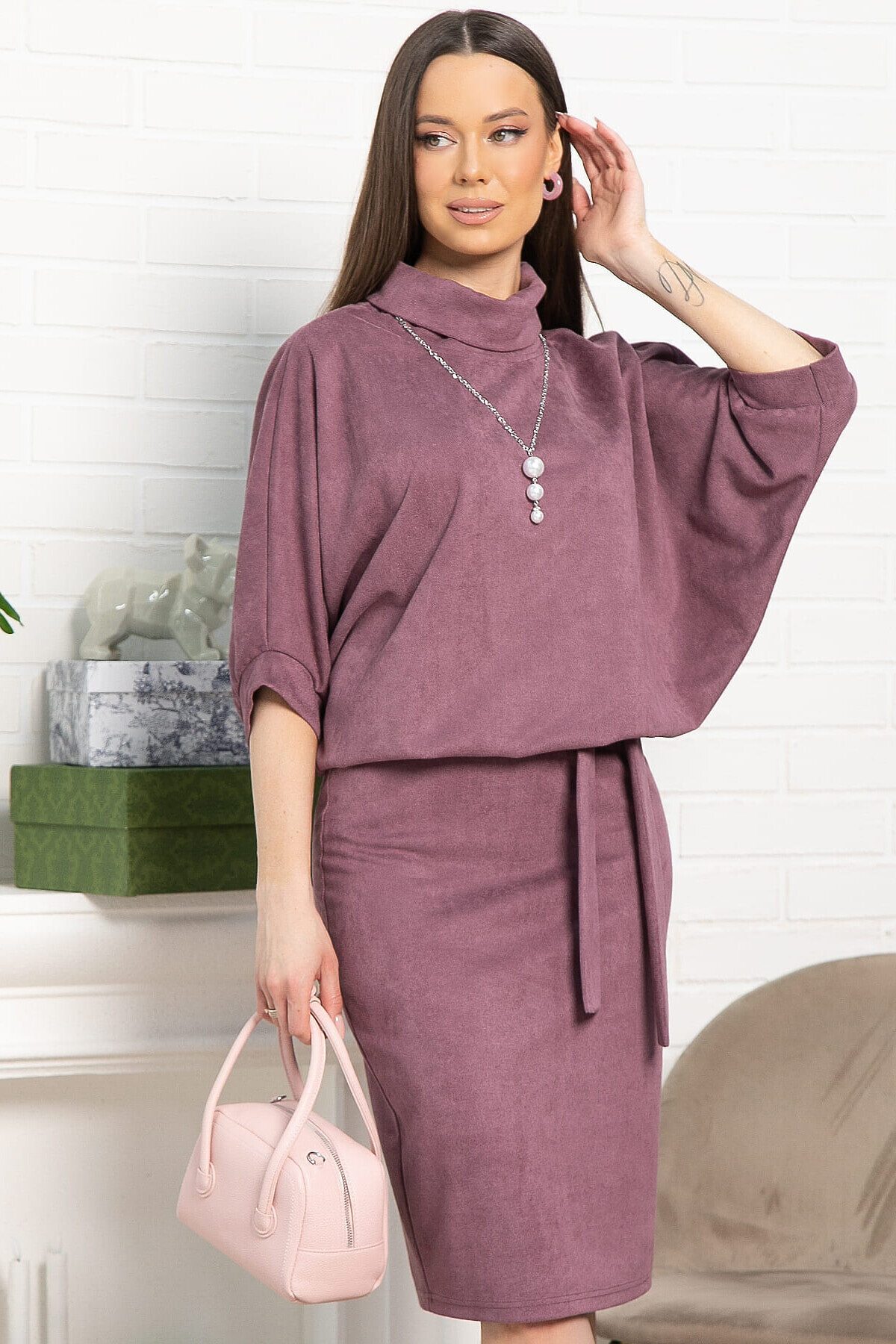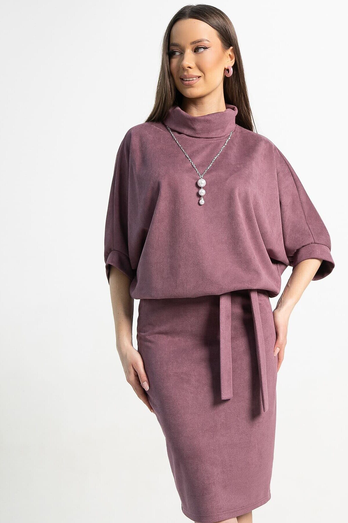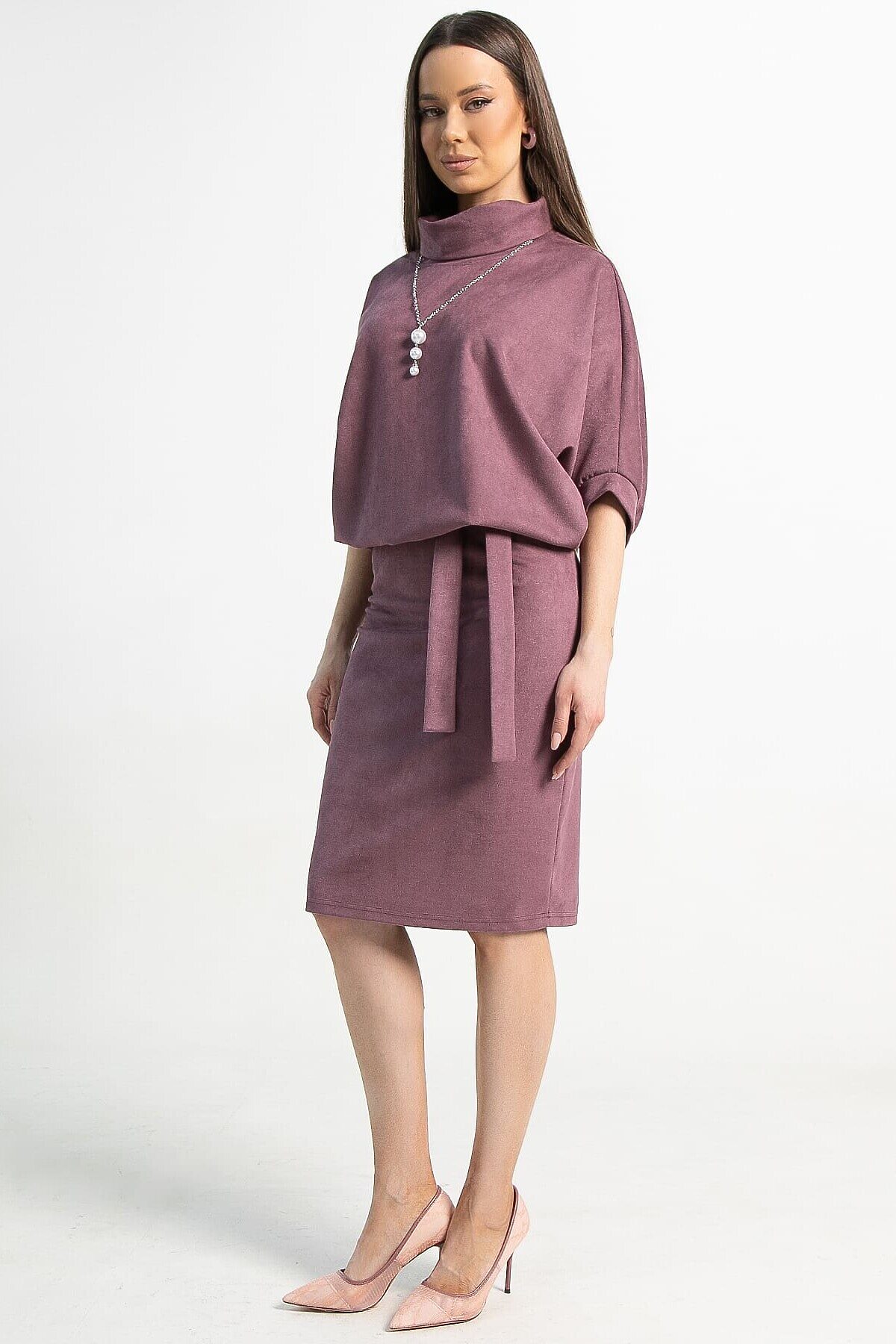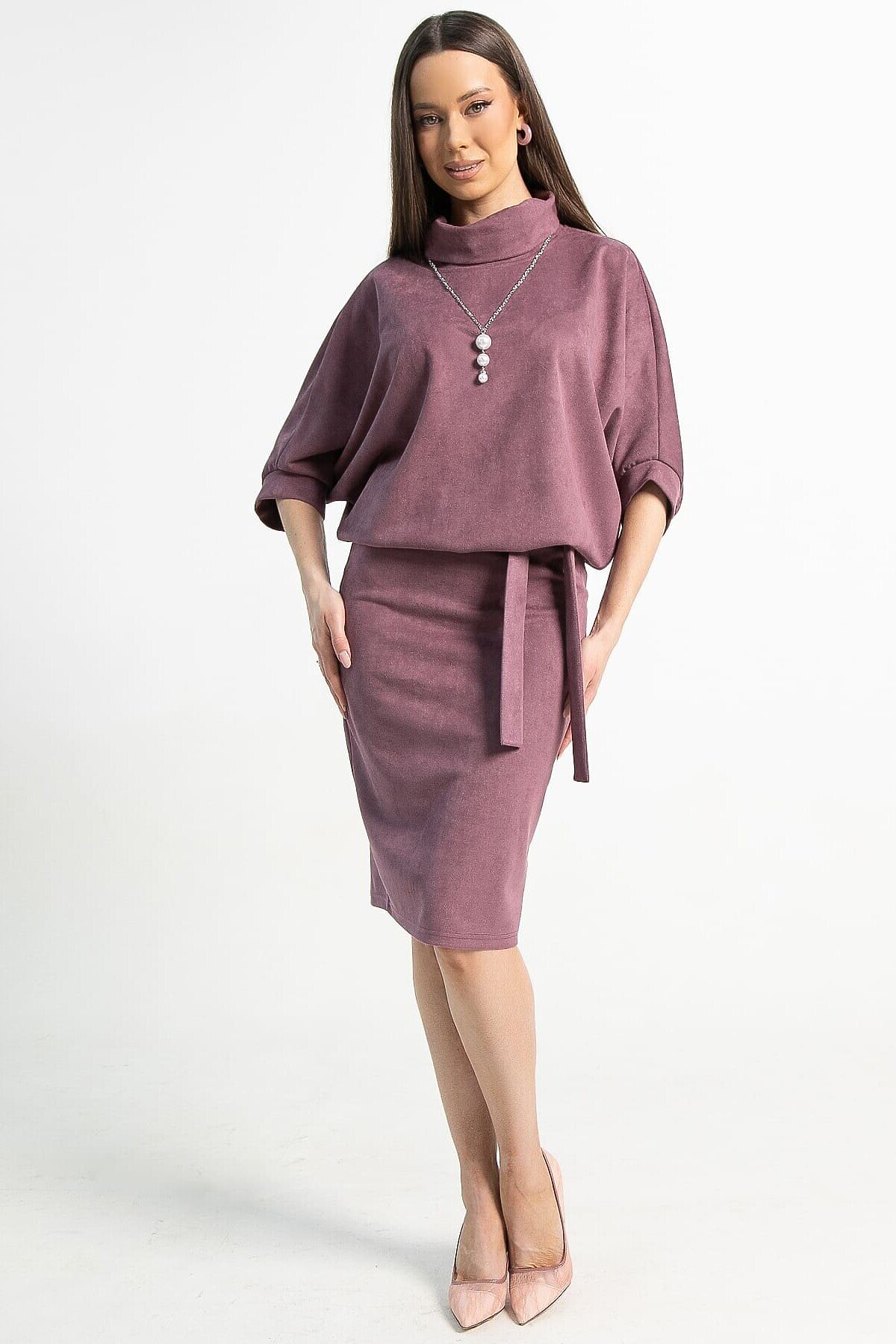 Платье из трикотажа в красивом лиловом цвете. Элегантная юбка прилегающего силуэта подчеркнёт красоту женской фигуры, а свободный верх не будет сковывать движений. Платье прекрасно подойдёт в качестве повседневного варианта и будет хорошо сочетаться как с туфлями или ботильонами, так и с кроссовками или ботинками. Благодаря своему фасону платье прекрасно справляется с задачей скрыть небольшие недостатки фигуры и подчеркнуть достоинства. Подвеска с жемчужными бусинами и пояс из основной ткани входят в комплект.