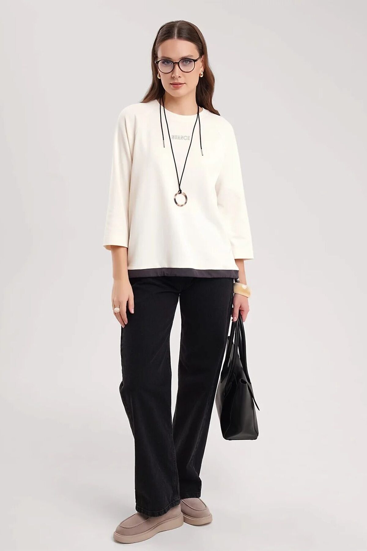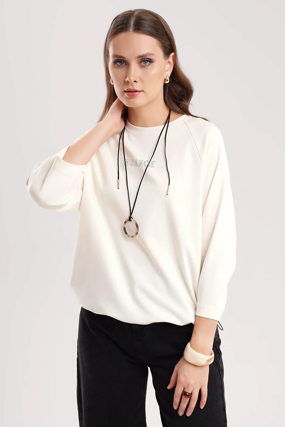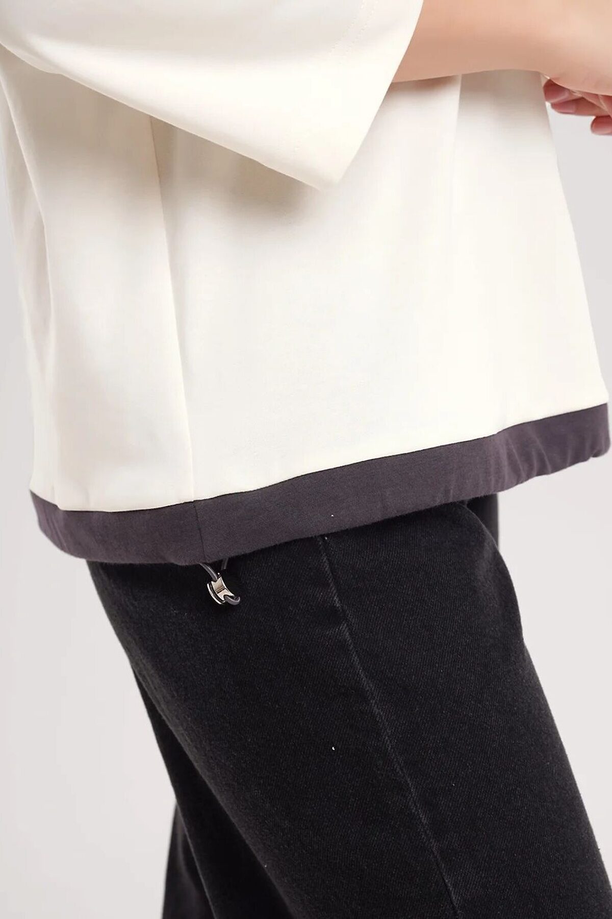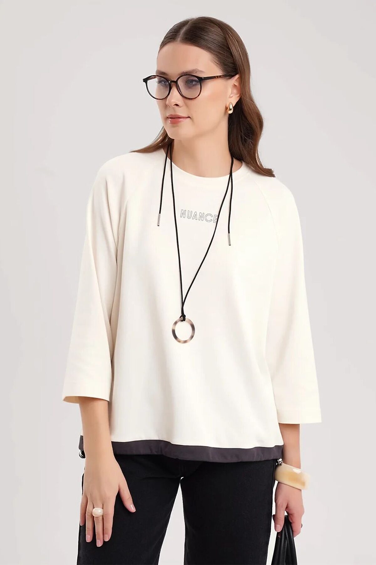 Джемпер свободного кроя из эластичного хлопкового полотна. Рукав реглан длиной 7/8. Округлая горловина с обтачкой. По низу изделия притачная контрастная кулиса с внутренним шляпным шнуром и стопором. Спереди