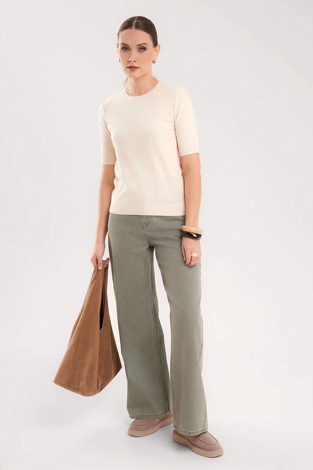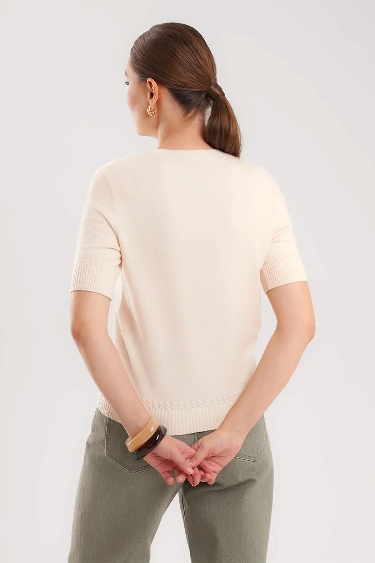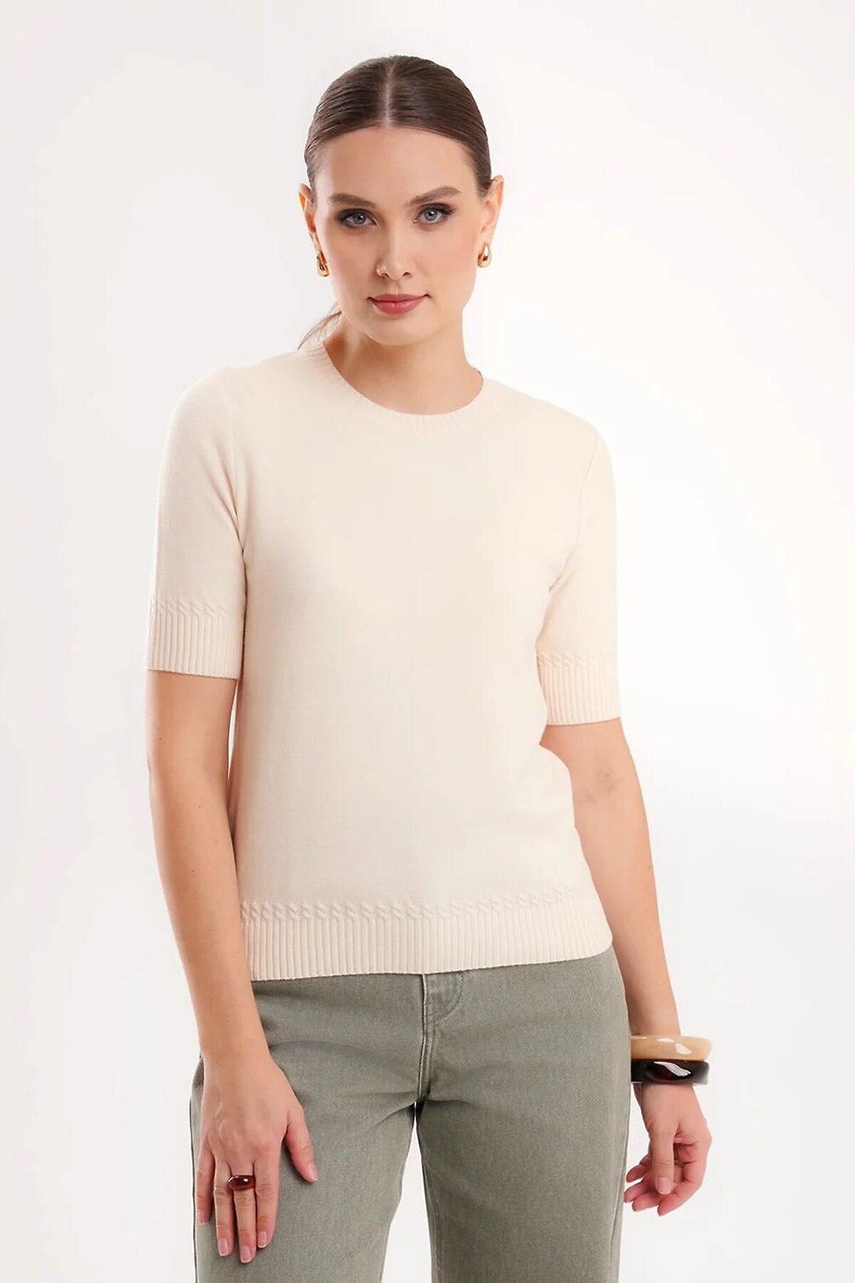 Вязаный джемпер укороченный из вискозной пряжи с добавлением нейлона, переплетения гладь. Втачной короткий рукав. Округлая горловина, по горловине бейка. По низу изделия и рукавов манжеты,в качестве декоративного элемента над манжетами вывязаны косы.