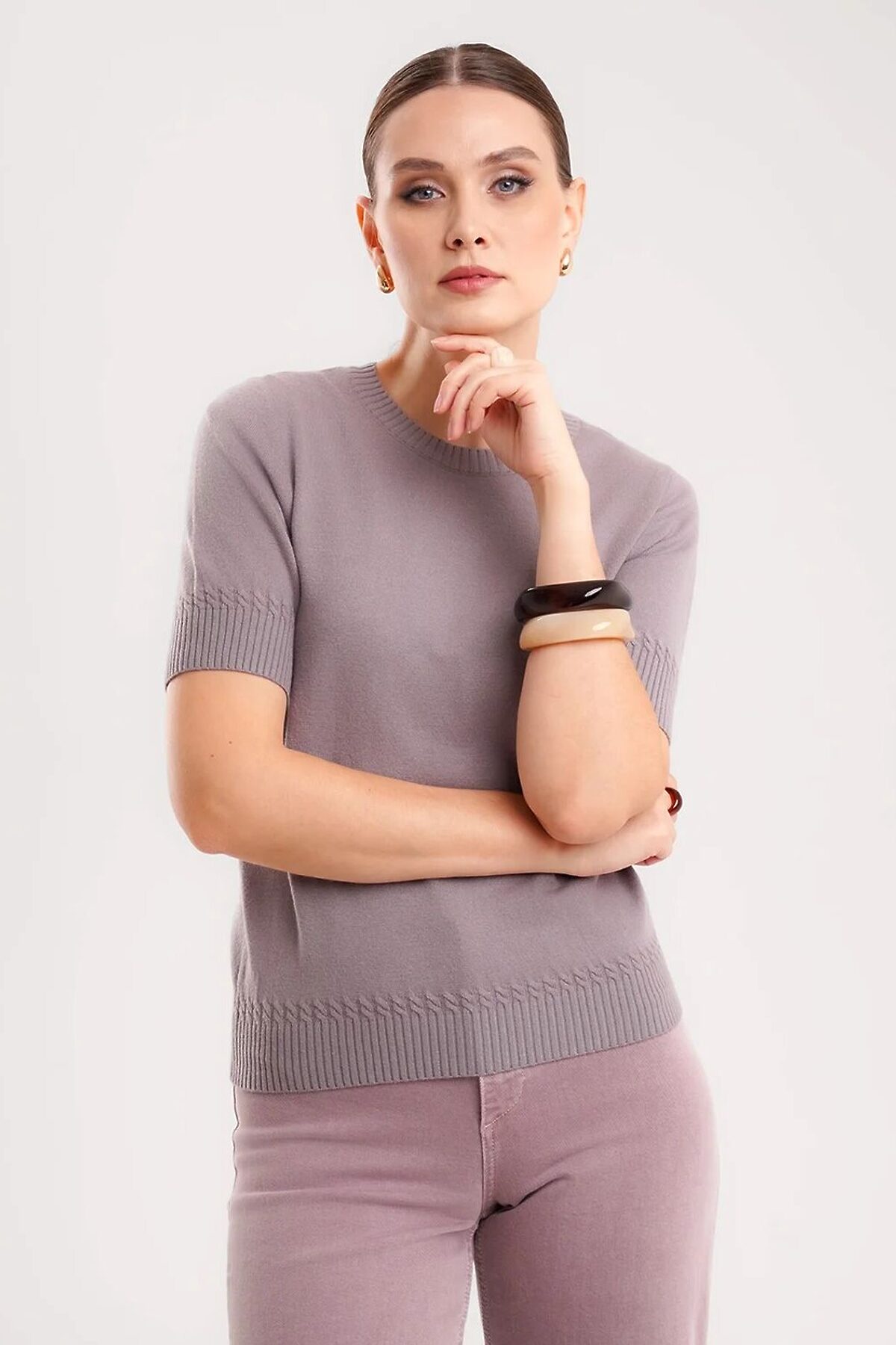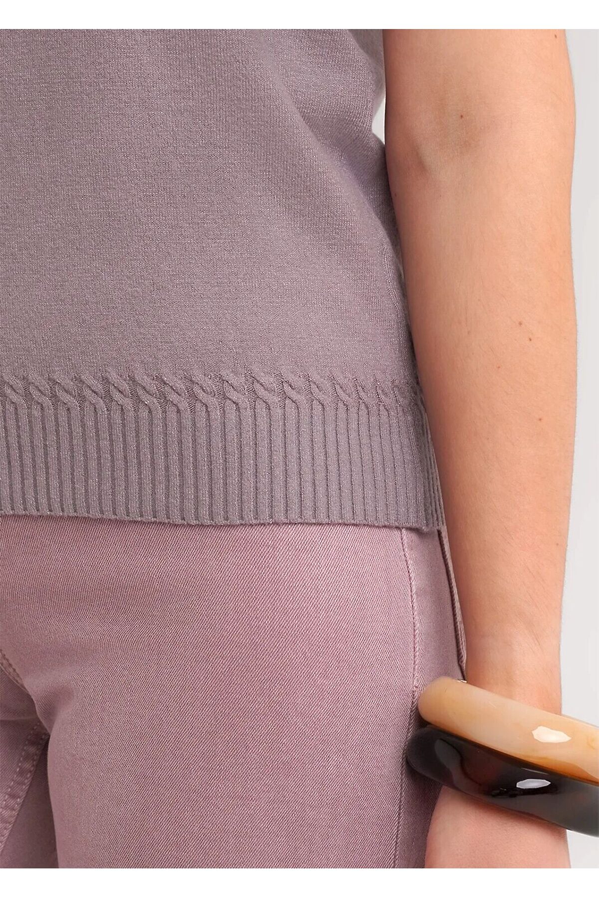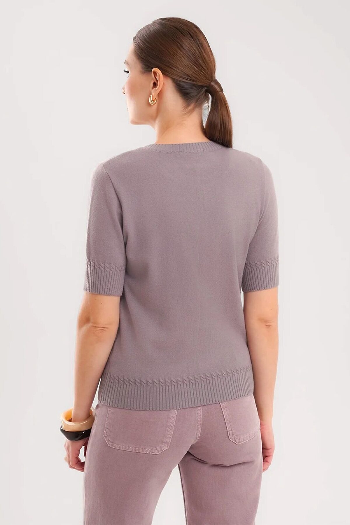 Вязаный джемпер укороченный из вискозной пряжи с добавлением нейлона, переплетения гладь. Втачной короткий рукав. Округлая горловина, по горловине бейка. По низу изделия и рукавов манжеты,в качестве декоративного элемента над манжетами вывязаны косы.
