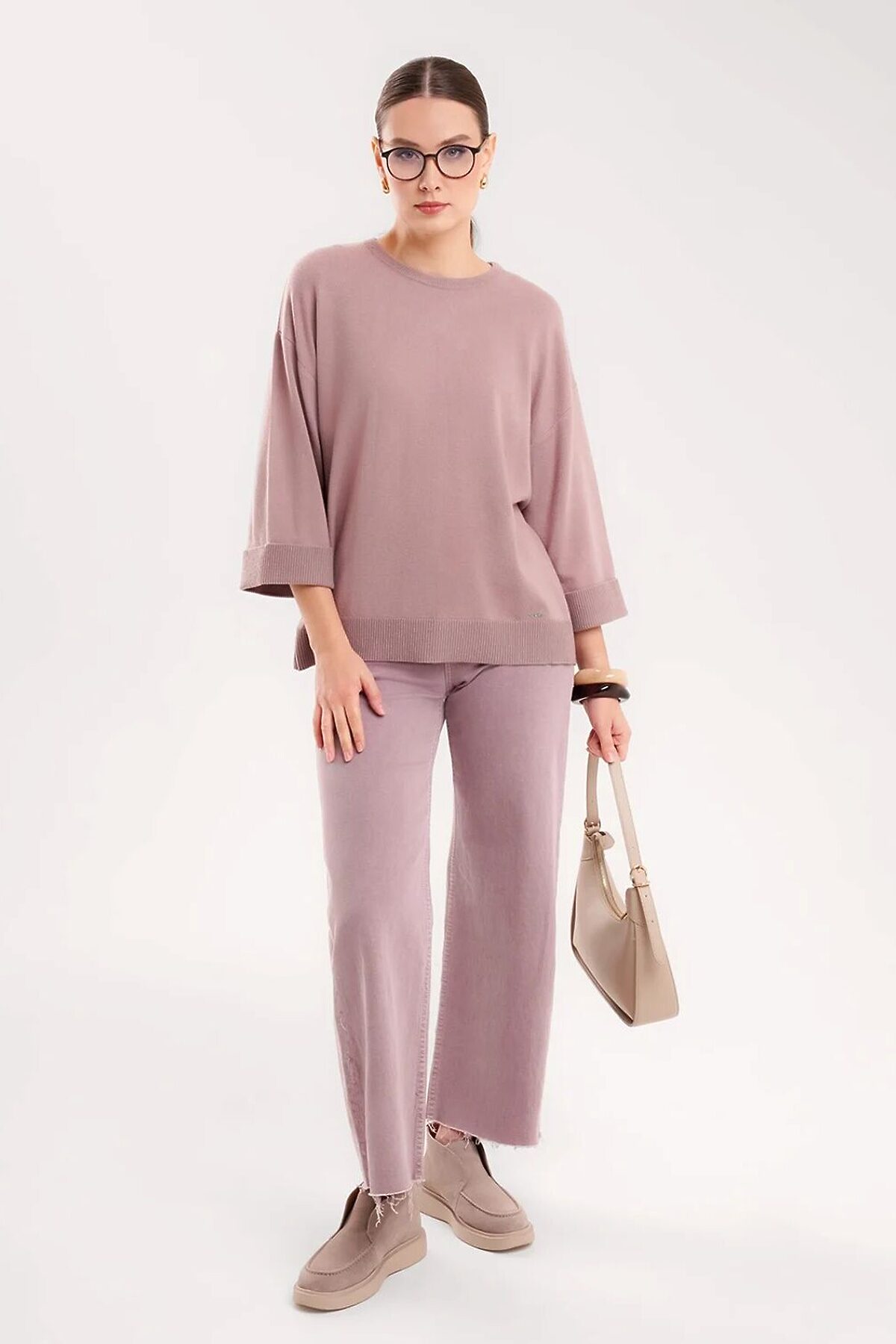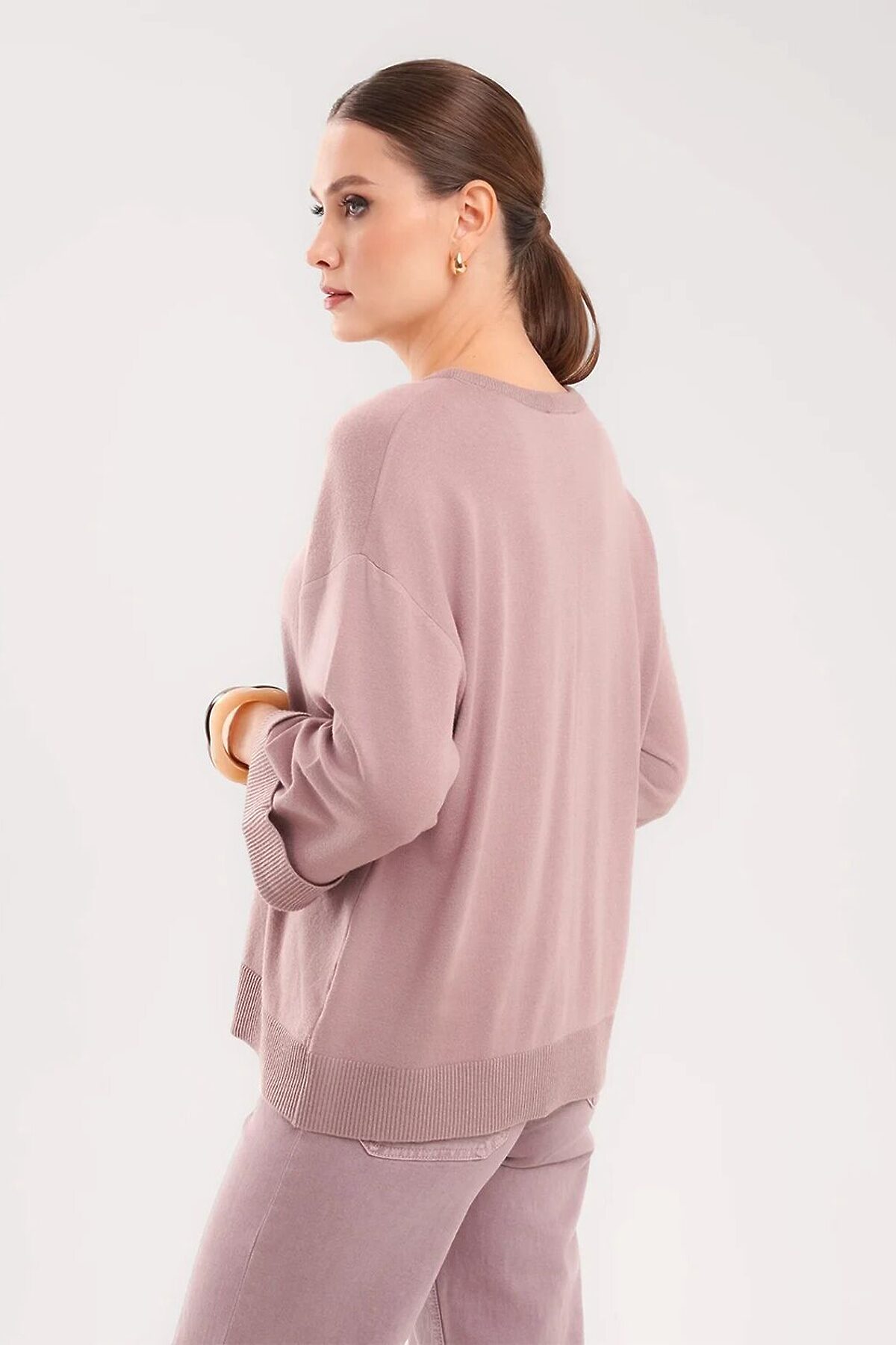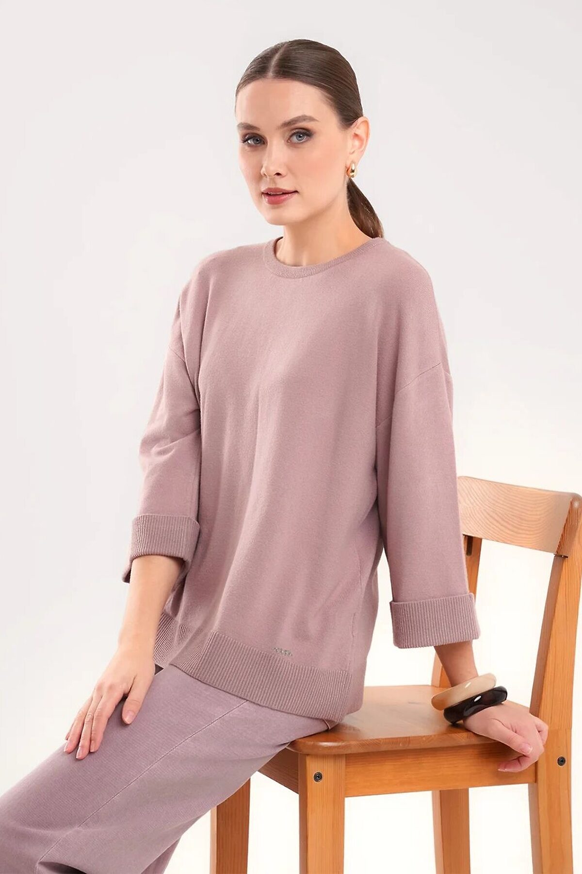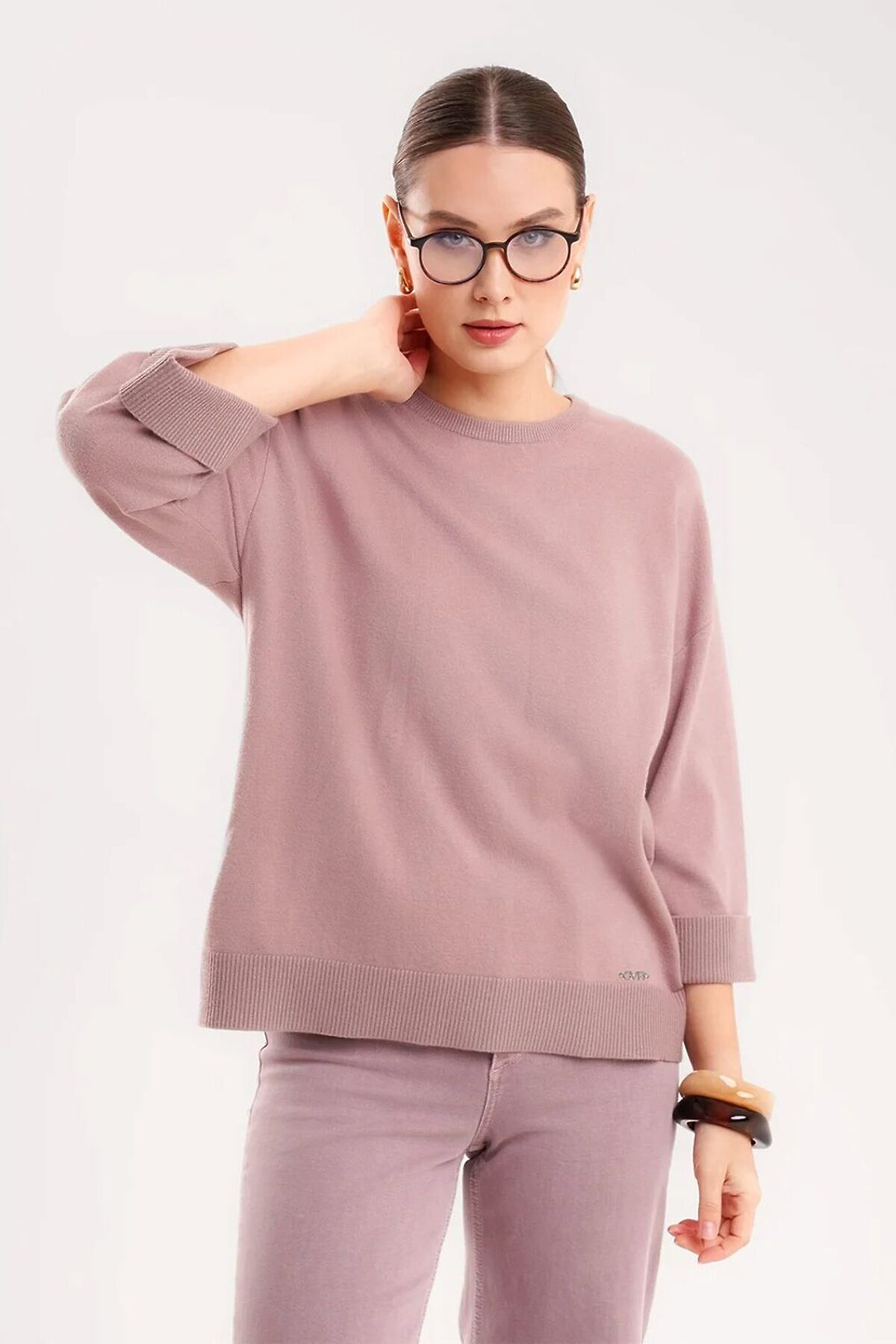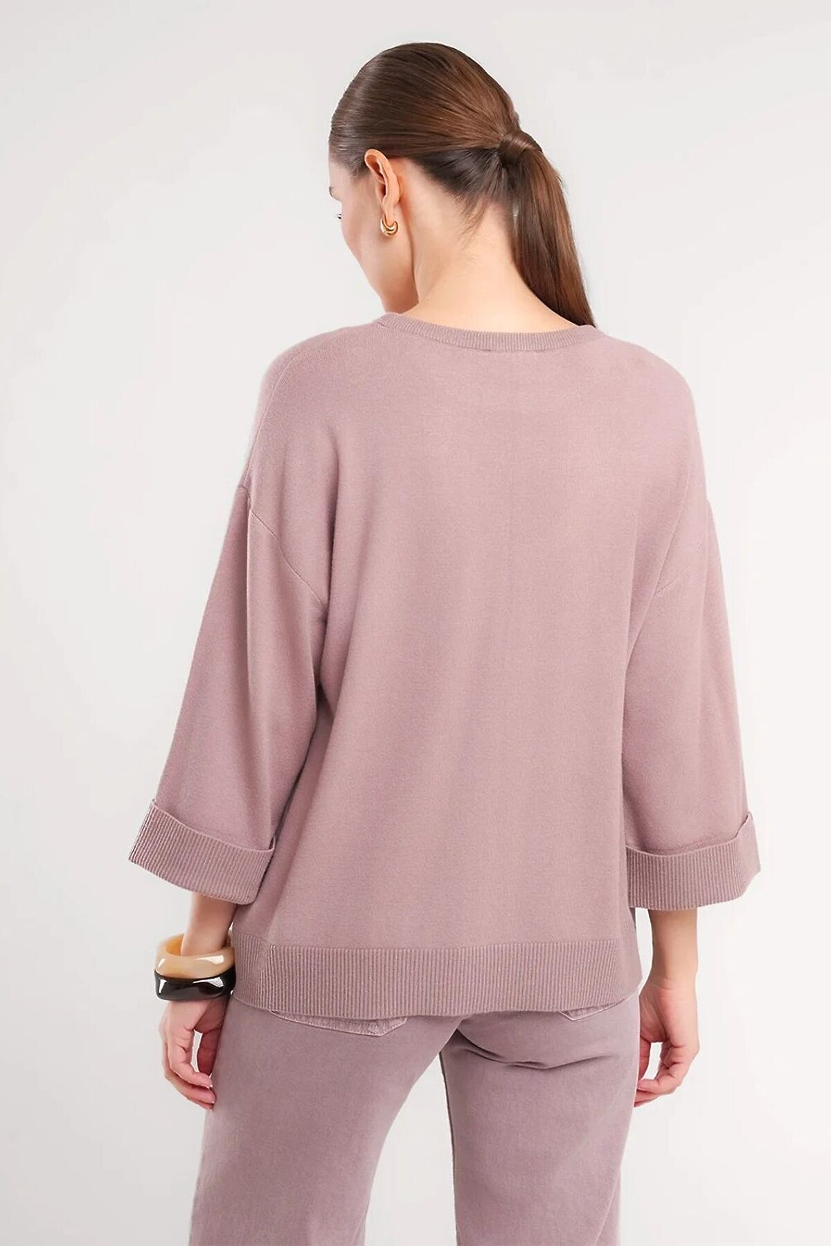 Вязаный джемпер прямого силуэта из поливискозной пряжи, переплетения гладь. Спущенный рукав длиной 3/4,по низу с отворотом. Округлая горловина с бейкой. По низу изделия манжет, металлическая нашивка