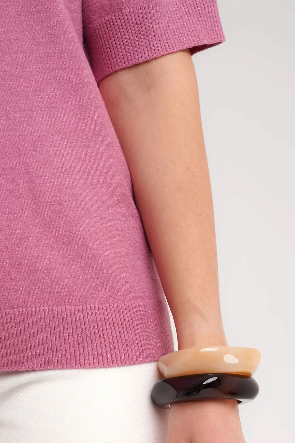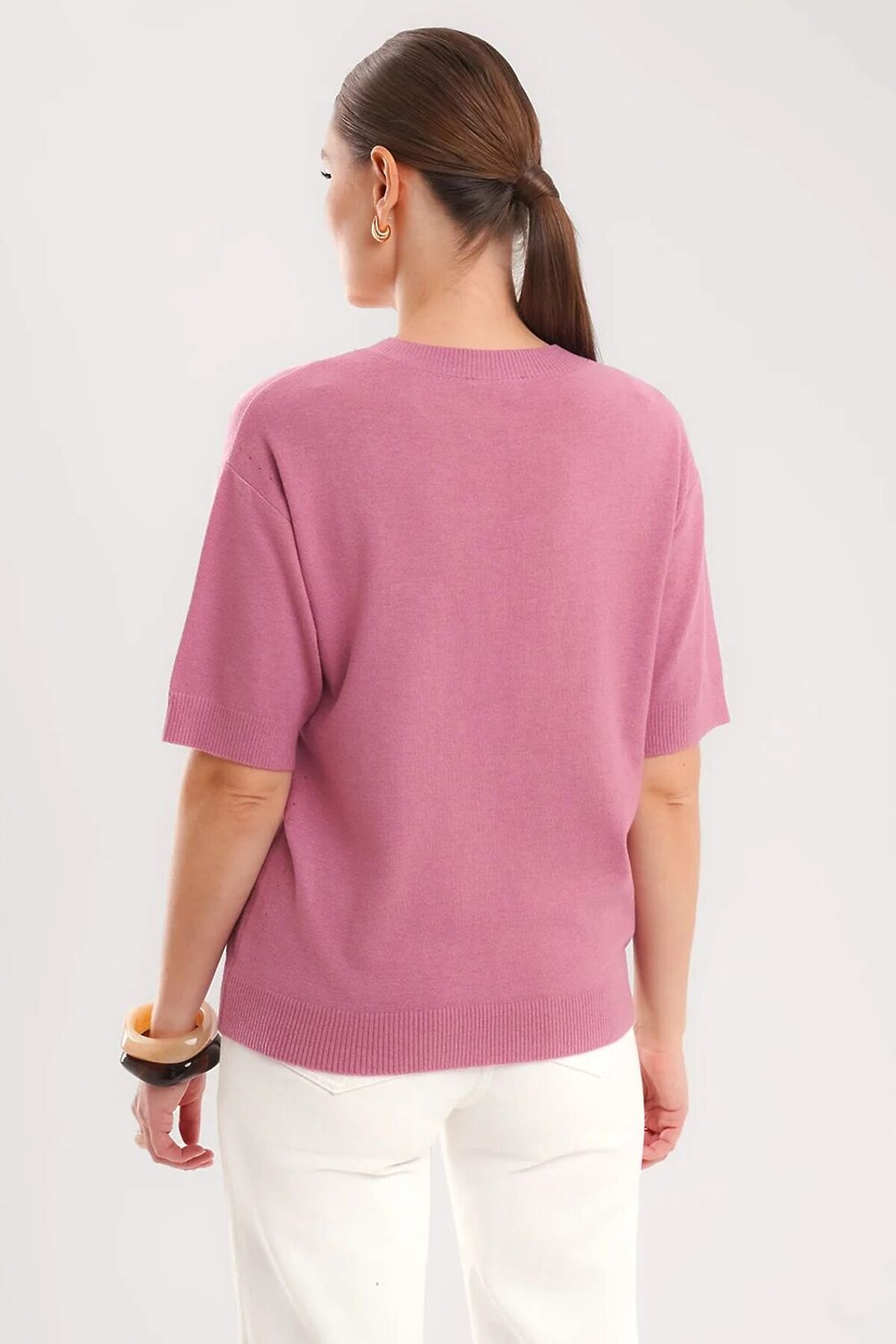 Вязаный джемпер умеренного объема из вискозной пряжи с добавлением нейлона, переплетения гладь. Втачной короткий рукав. Округлая горловина, по горловине бейка. По низу изделия и рукавов манжеты. По пройме и боковому шву вывязанные дырки.