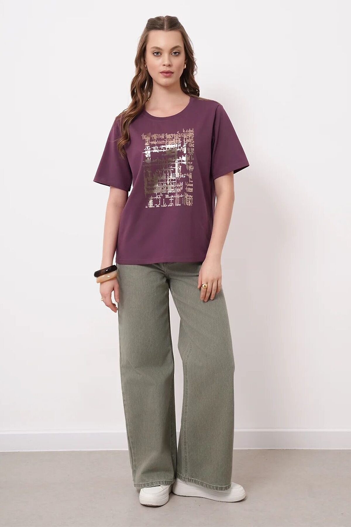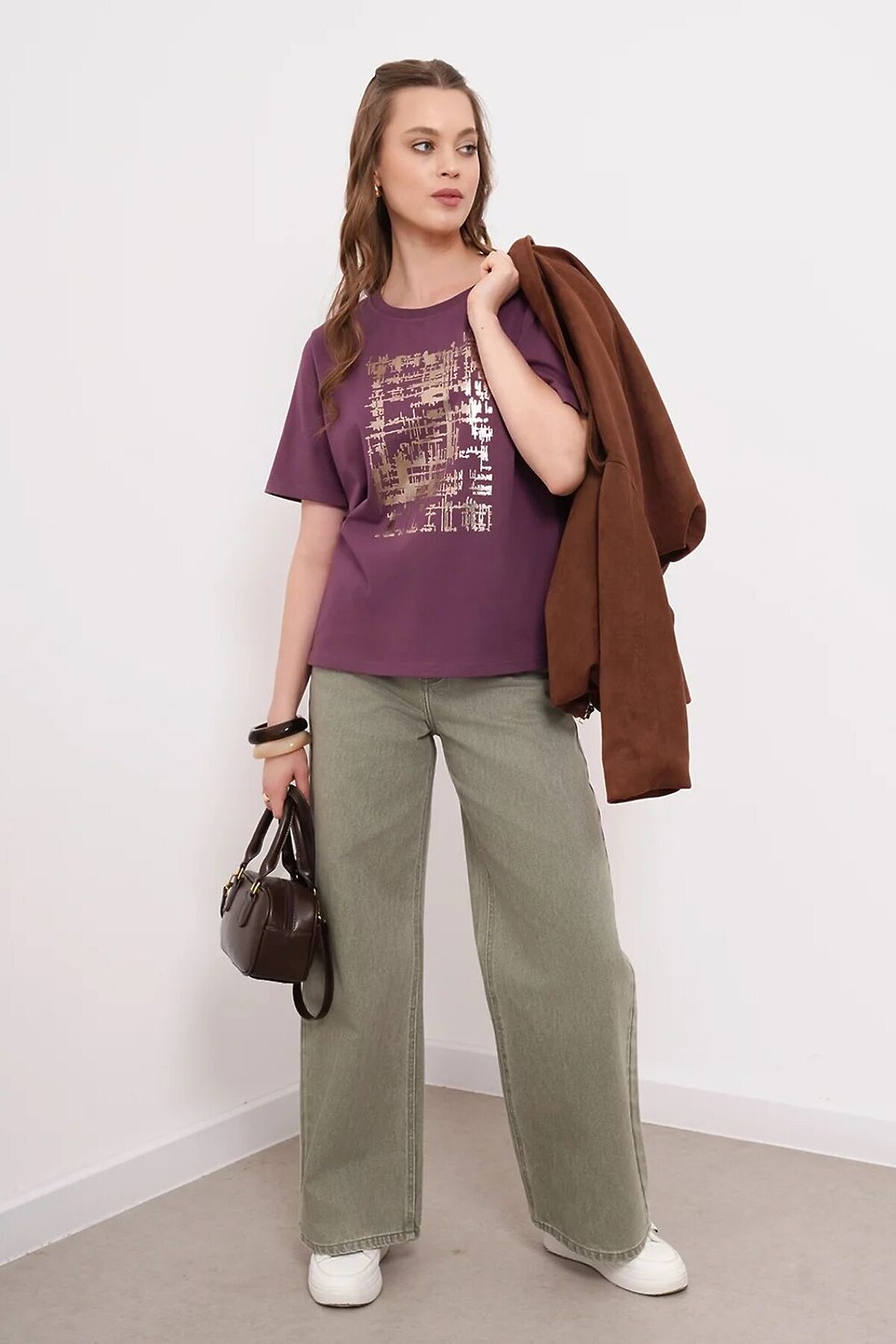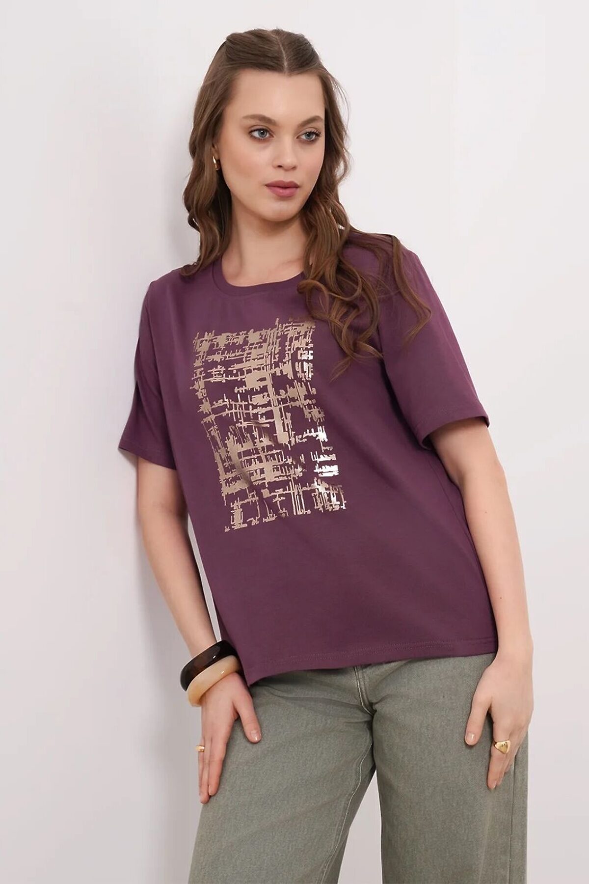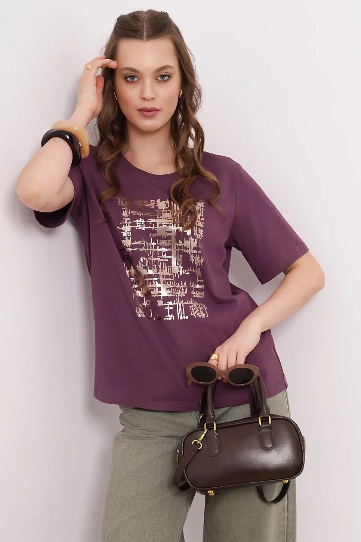 Футболка из хлопкового трикотажного полотна. Округлая горловина с обтачкой. Короткий втачной рукав. Спереди принт фольга.