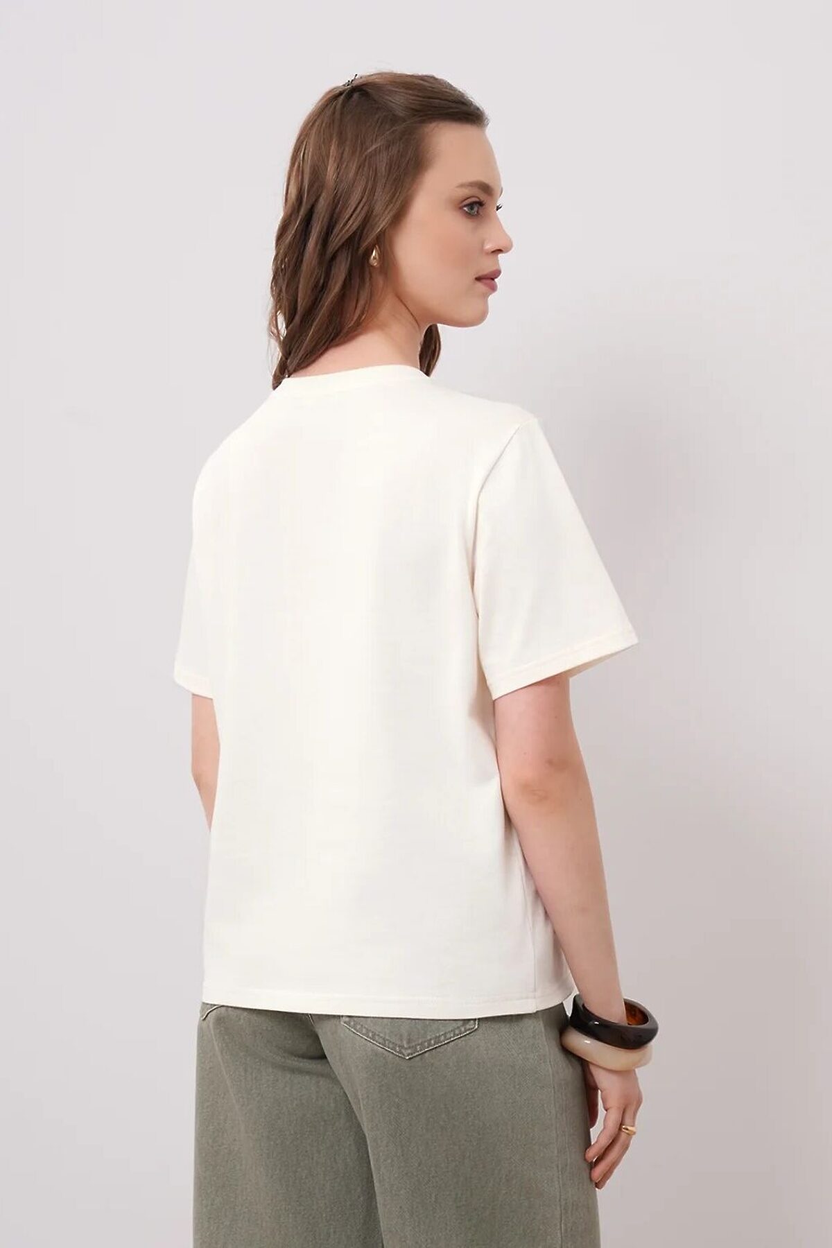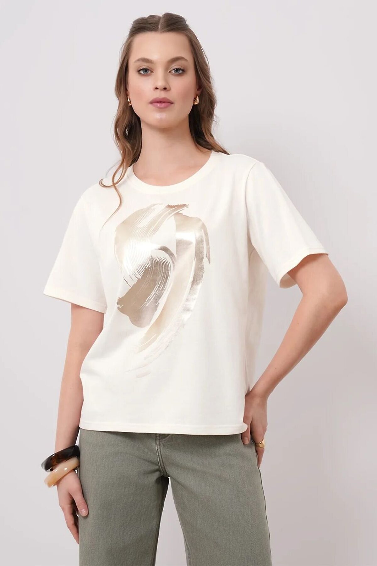 Футболка из хлопкового трикотажного полотна. Округлая горловина с обтачкой. Короткий втачной рукав. Спереди принт фольга.