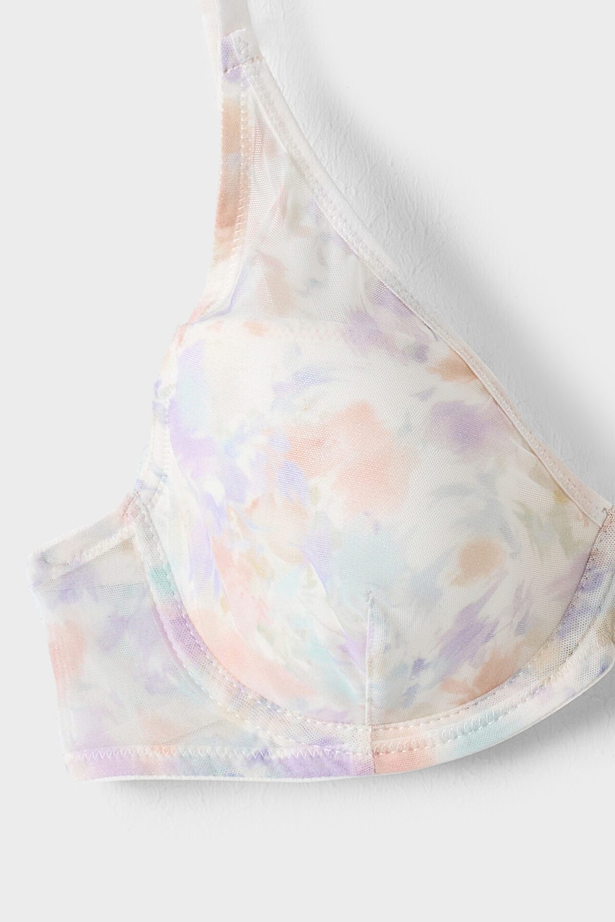 Бюстгальтер женский. На каркасах. Чашки t-shirt. Бочки и ластовица из сетки. Чашки из сетки, с вытачками. Ластовица на подкладке. Пройма и верхний срез стана обработаны тесьмой жесткой без зуба. Нижний срез стана обработан тесьмой жесткой без зуба. Застежка двойная. Бретели. Передний срез чашек из сетки обработан ловаблем. Верхний срез формованных чашек обработан ловаблем.