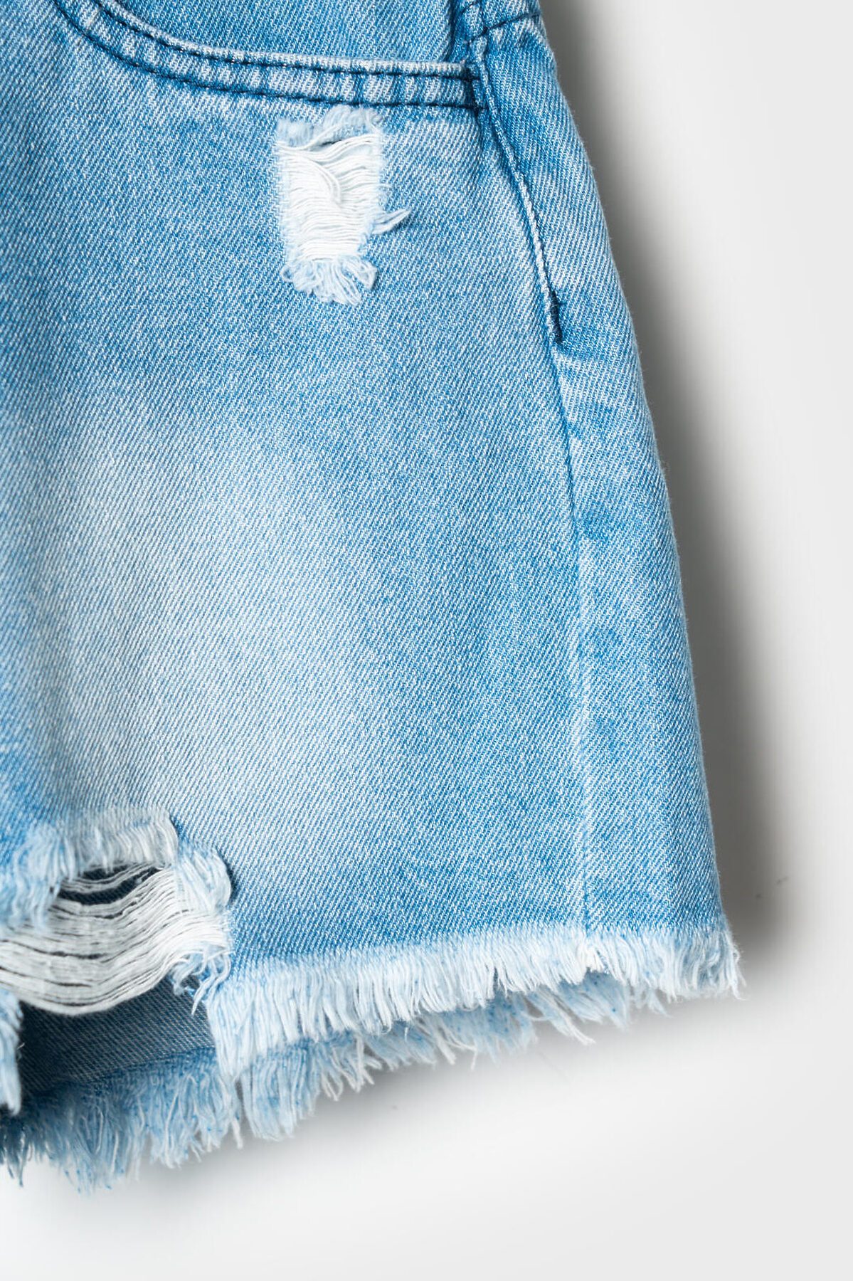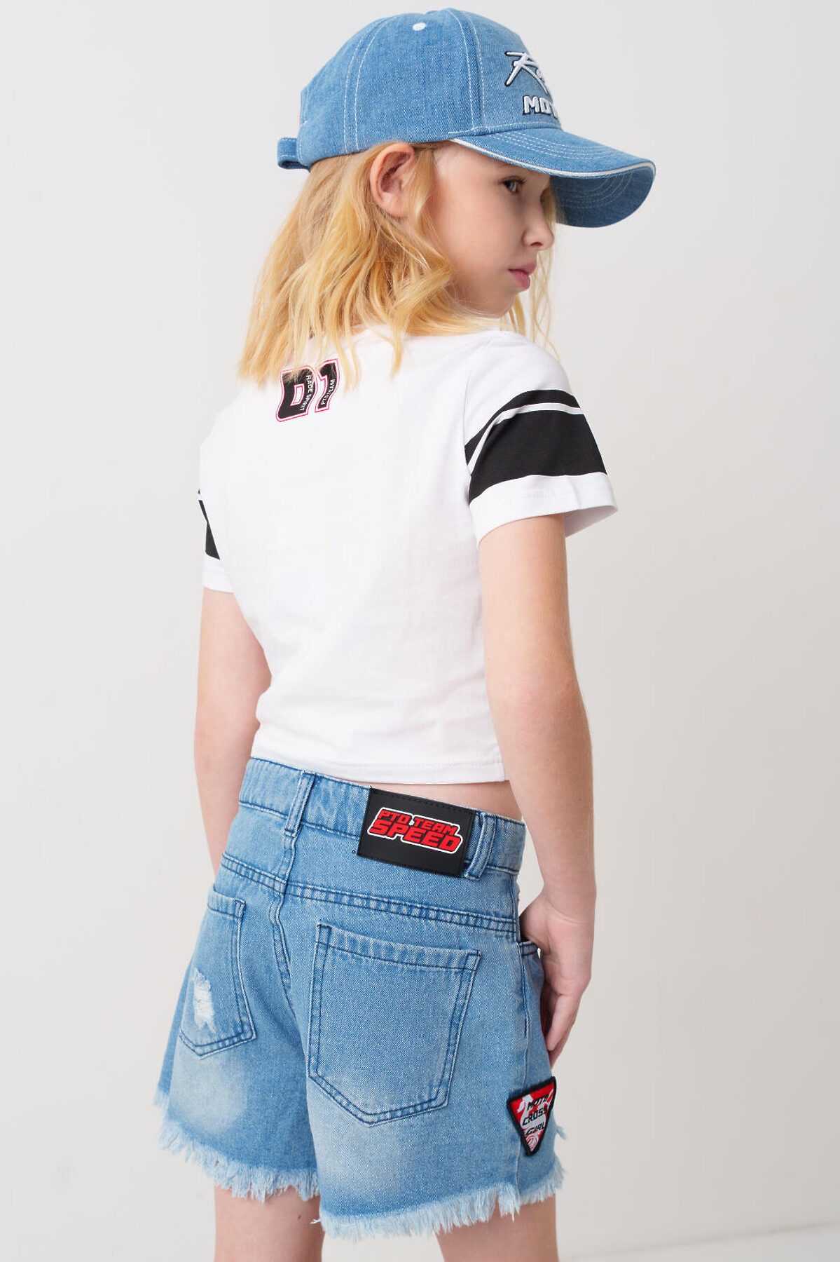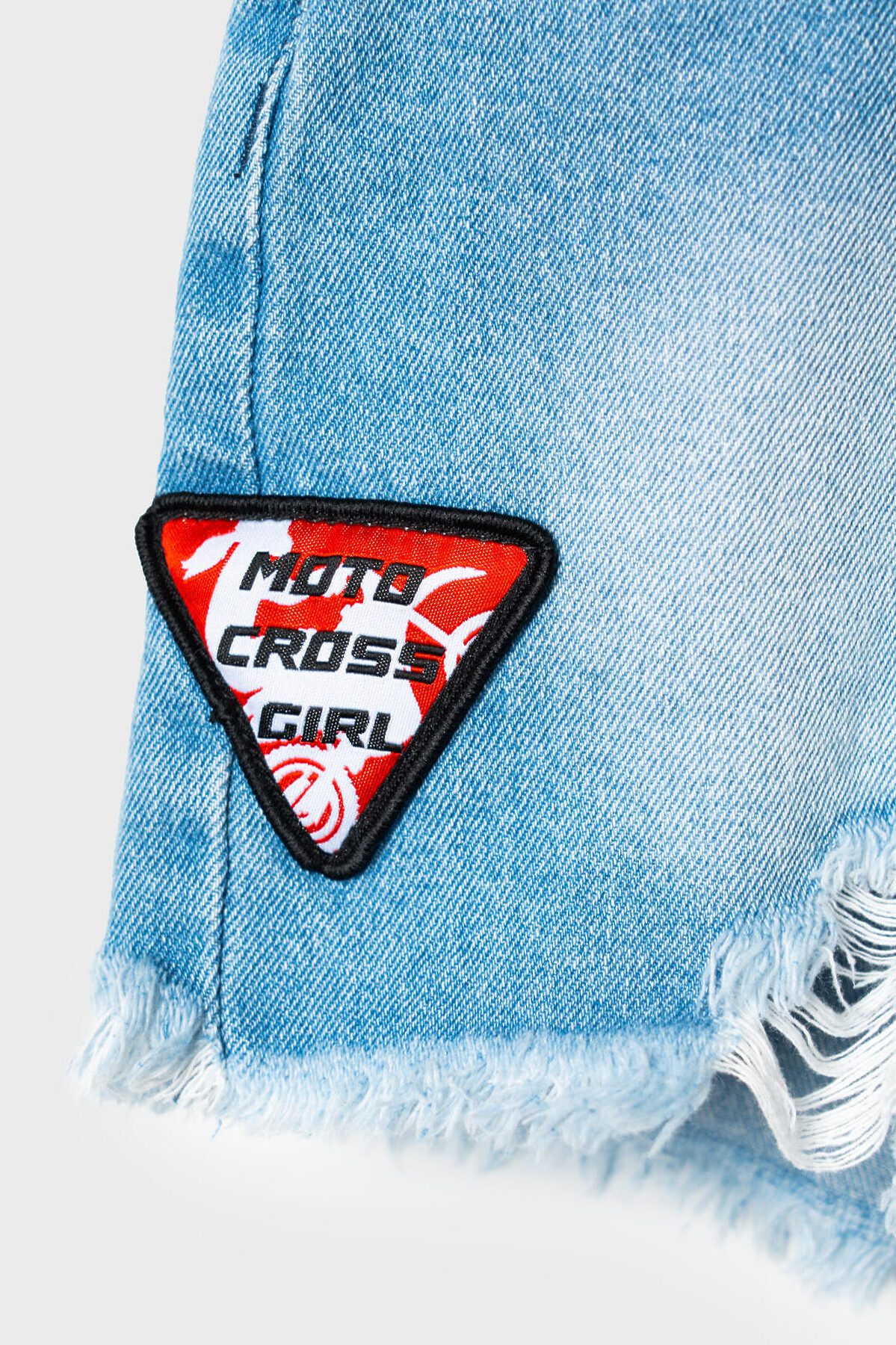 Джинсовые шорты для девочки подростка. Шорты короткие, с модным рваным краем и потертостями. Спереди — карманы и патч, сзади — два накладных кармана и силиконовая нашивка. Шорты застегиваются на болт и молнию. В поясе предусмотрена внутренняя регулировка.