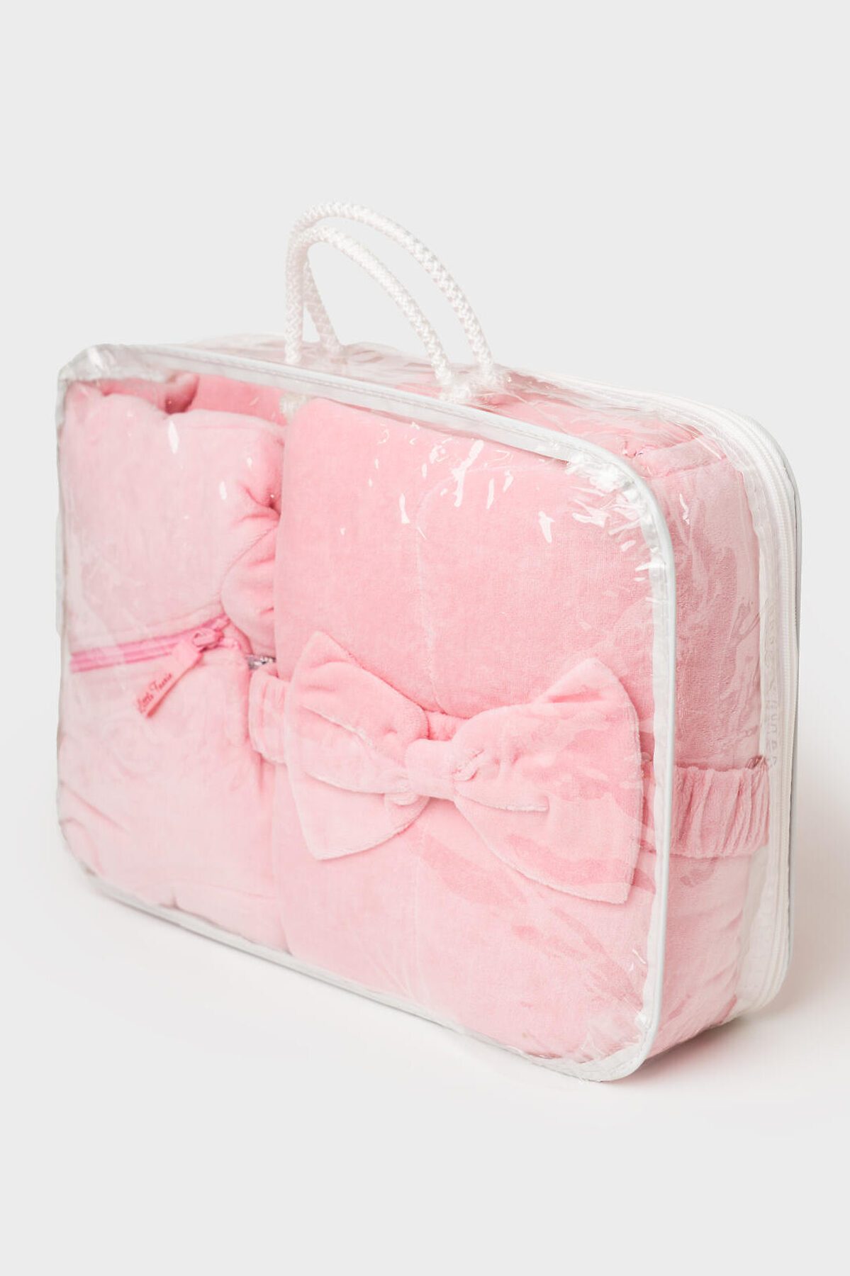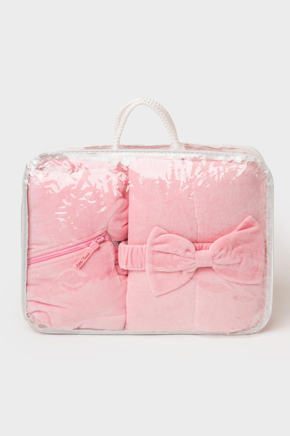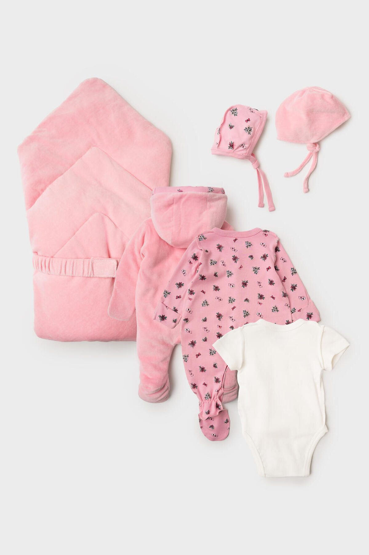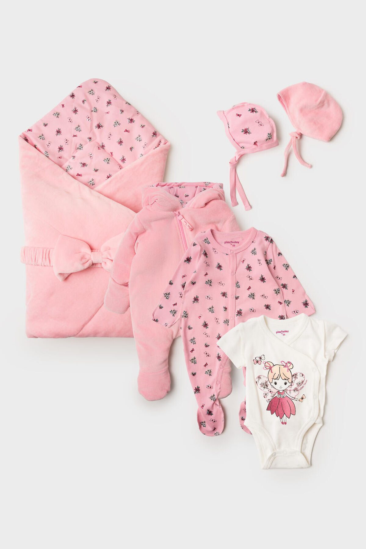 Комплект из шести предметов для новорождённой девочки. В него входят два комбинезона, боди с коротким рукавом, чепчик, шапочка и тёплый конверт-одеяло. Изделия выполнены в нежных розовых и молочных тонах. На боди и одном из комбинезонов размещён яркий принт с феей и бабочками, остальные элементы оформлены рисунком с бабочками. Утеплённый комбинезон имеет капюшон с подкладкой и удобную косую застёжку-молнию. Конверт украшен декоративным бантом. Боди, чепчик, комбинезон выполнены с наружными швами для дополнительного комфорта малышей. Боди с двумя рядами кнопок, растет вместе с малышом.