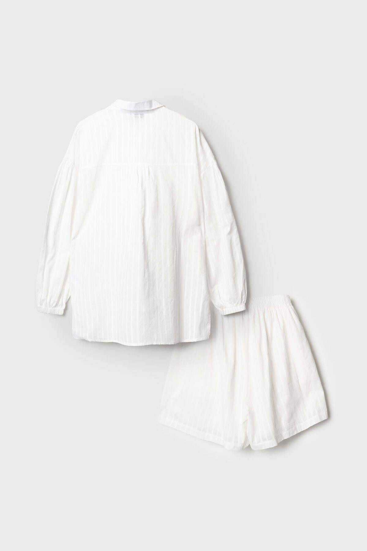Легкий женский хлопковый костюм. Рубашка оверсайз с длинным рукавом и застежкой на пуговицы. Классический воротник, боковые разрезы. Манжеты на резинке. Свободные шорты на резинке.