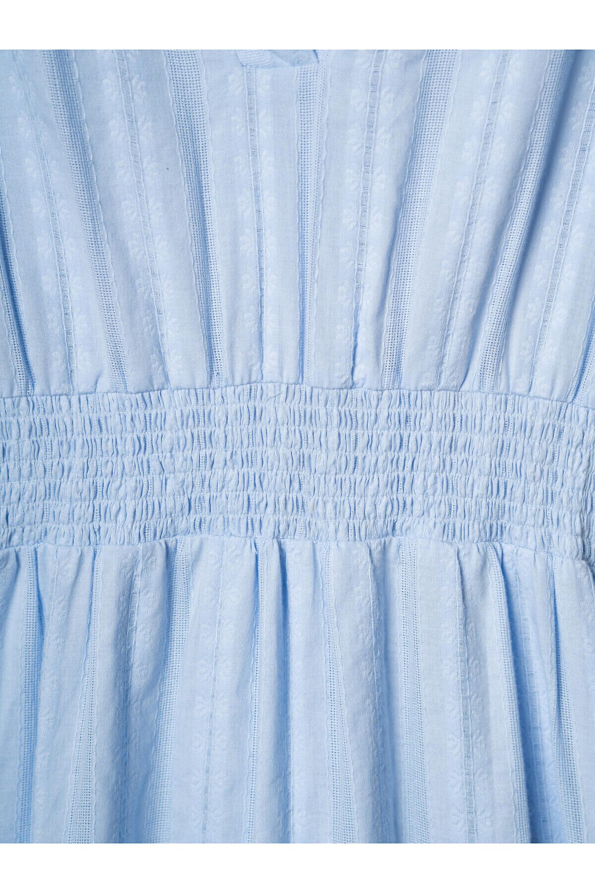 Женское летнее платье в длине миди. Модель имеет широкую резинку по талии. Верхняя часть дополнена подкладкой для комфорта. Хлопковая ткань с тонким фактурным рисунком и цветочными элементами придаёт изделию нежный и воздушный вид. V-образный вырез делает образ более выразительным.