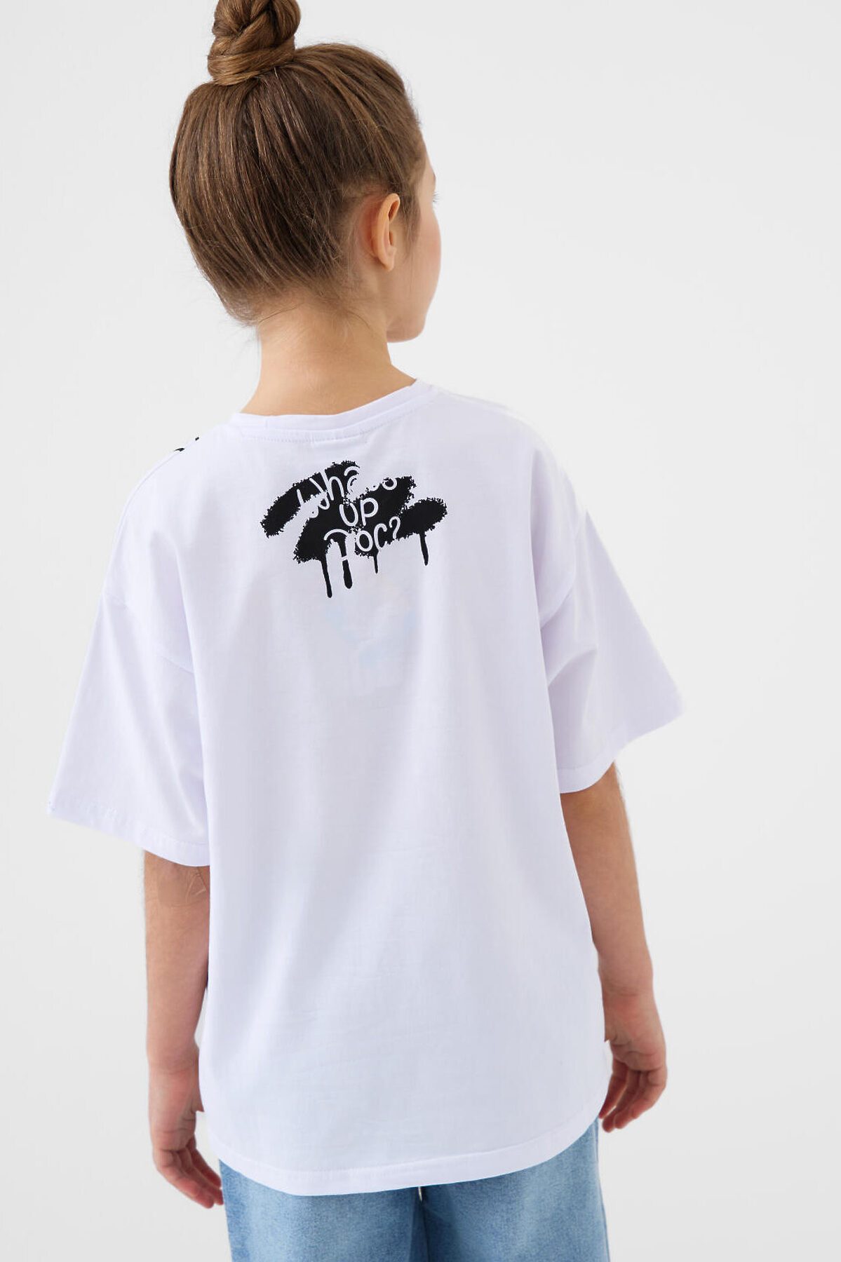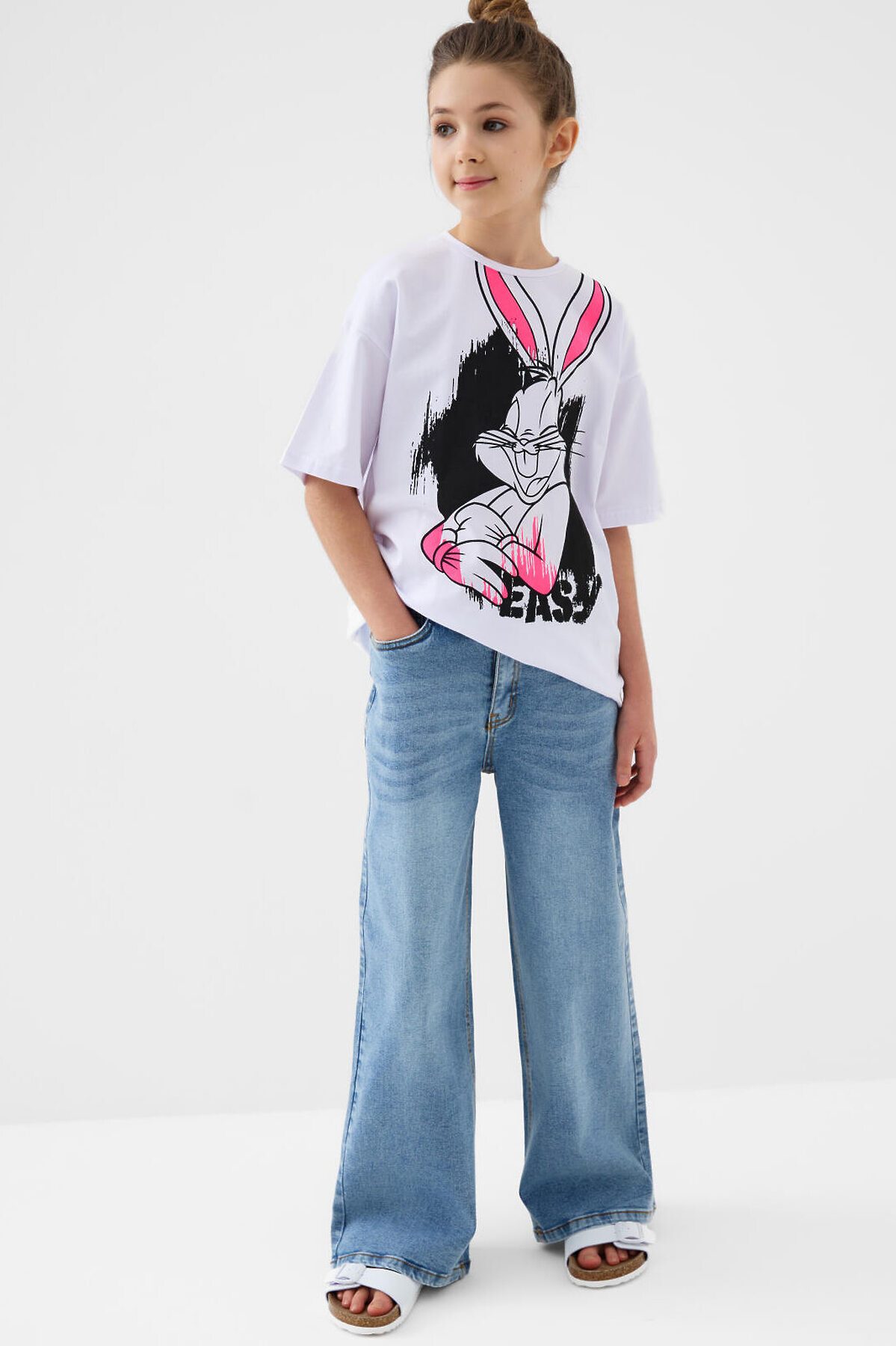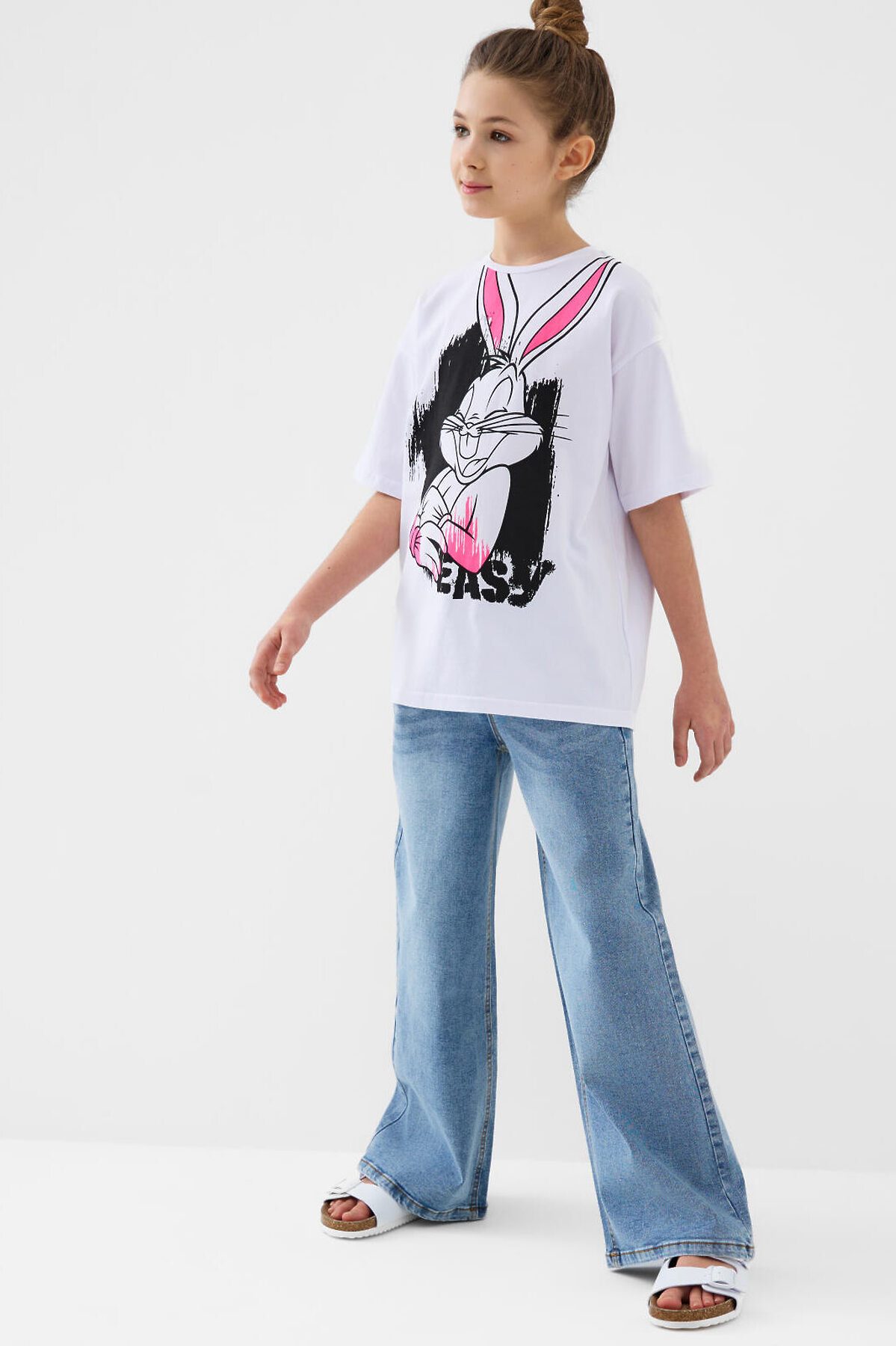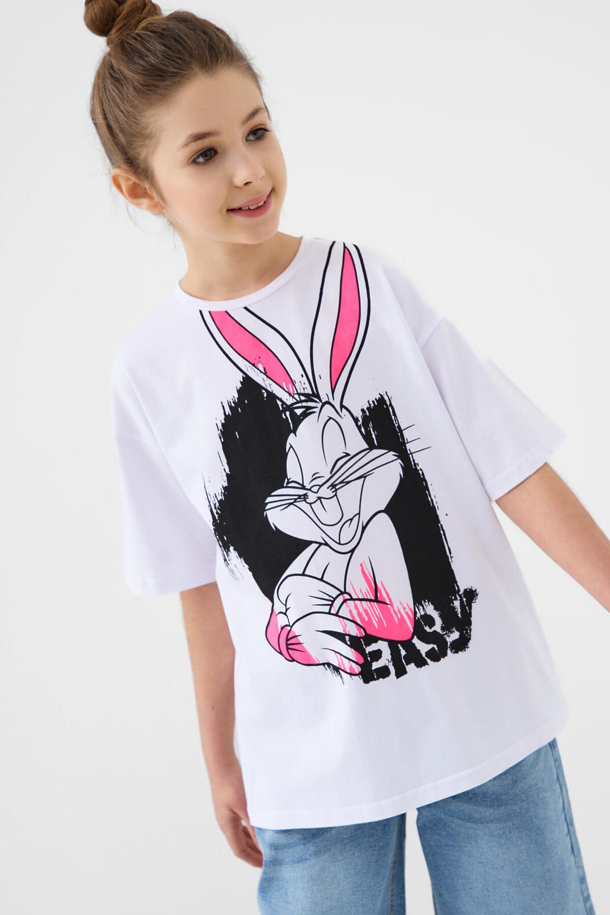 Футболка оверсайз для девочки подростка. Модель выполнена из эластичного хлопкового трикотажа джерси. На груди расположен крупный принт с любимым персонажем "Looney Tunes" Бакз Банни.