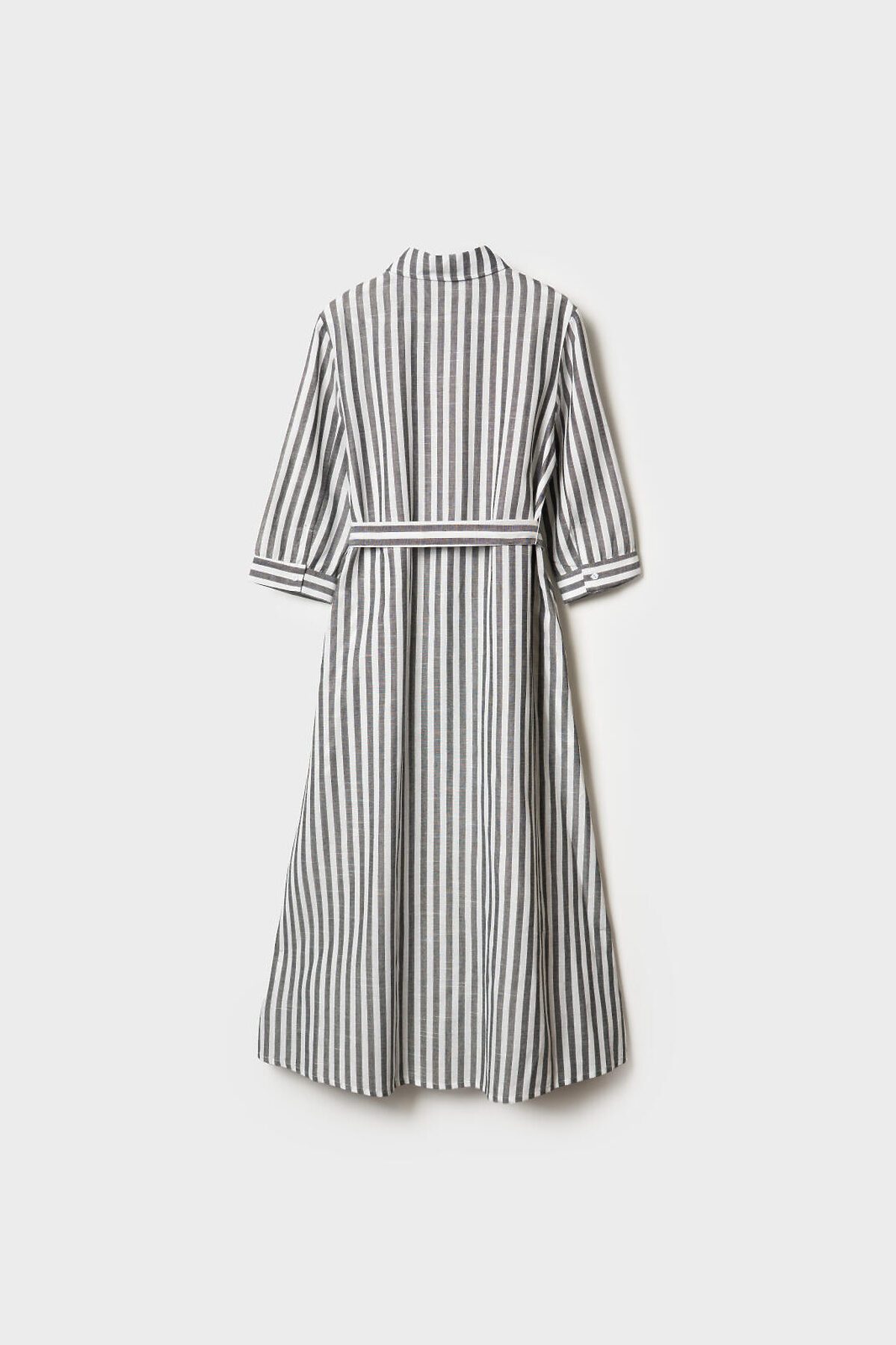 Женское платье в длине макси. Модель выполнена из хлопковой ткани, имеет прямой верх и расширенную к низу юбку, за счёт чего красиво смотрится в движении. Платье застёгивается на пуговицы. Линия талии подчёркивается съёмным поясом. Рукава длинные, с манжетами на пуговицах. По бокам предусмотрены удобные карманы. Воротник классический, отложной.