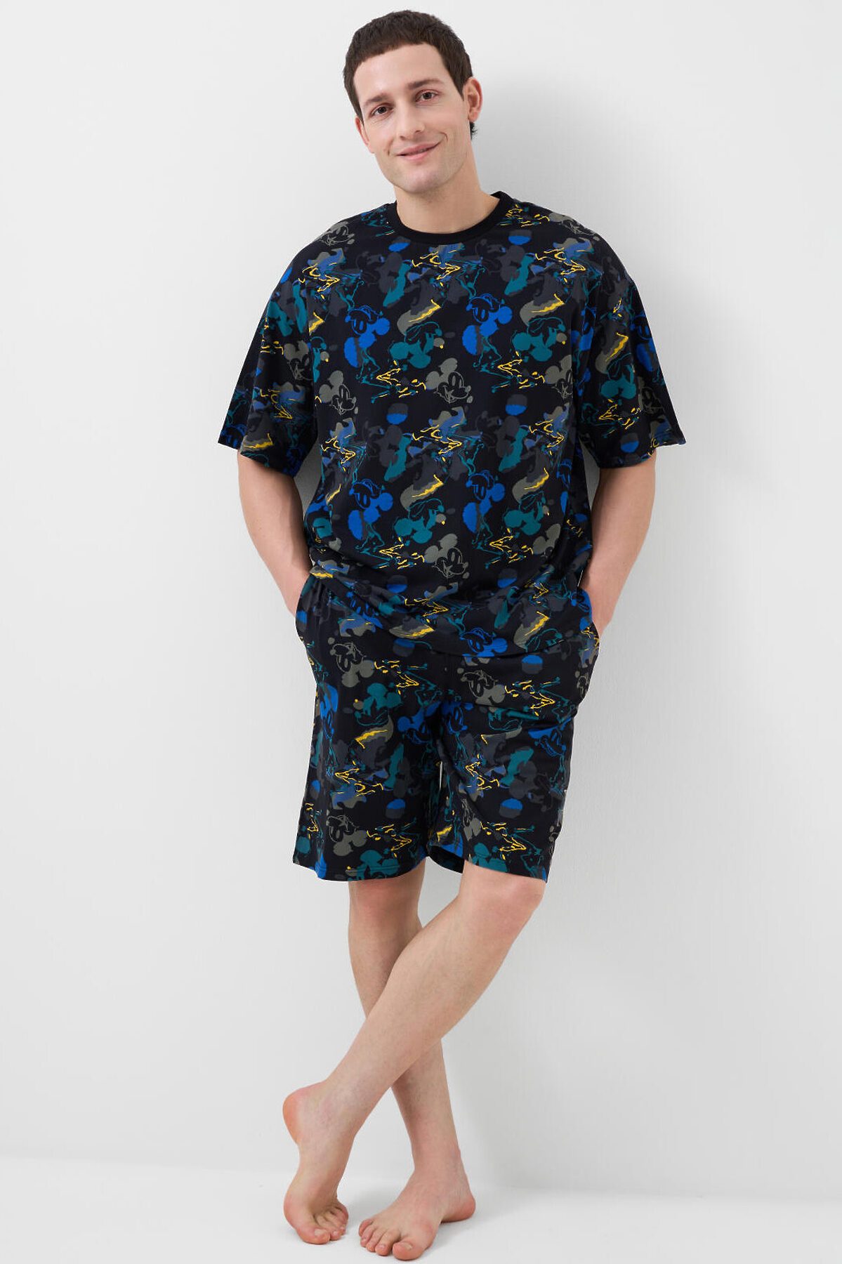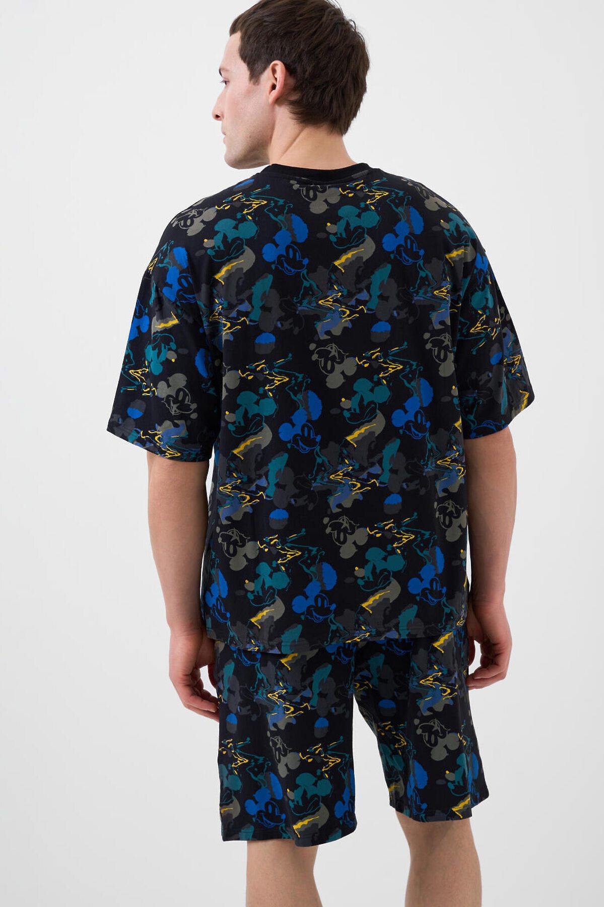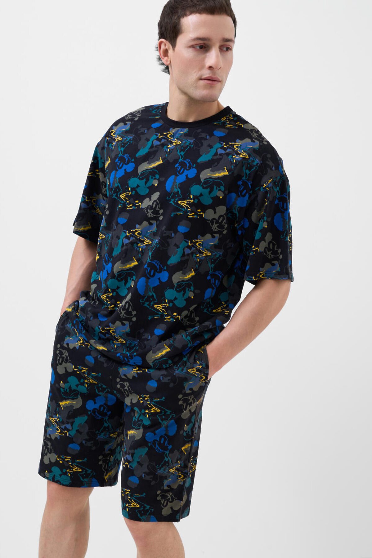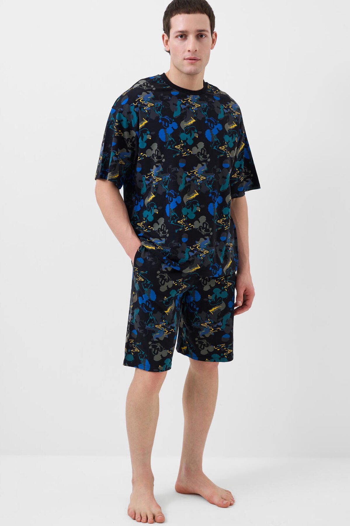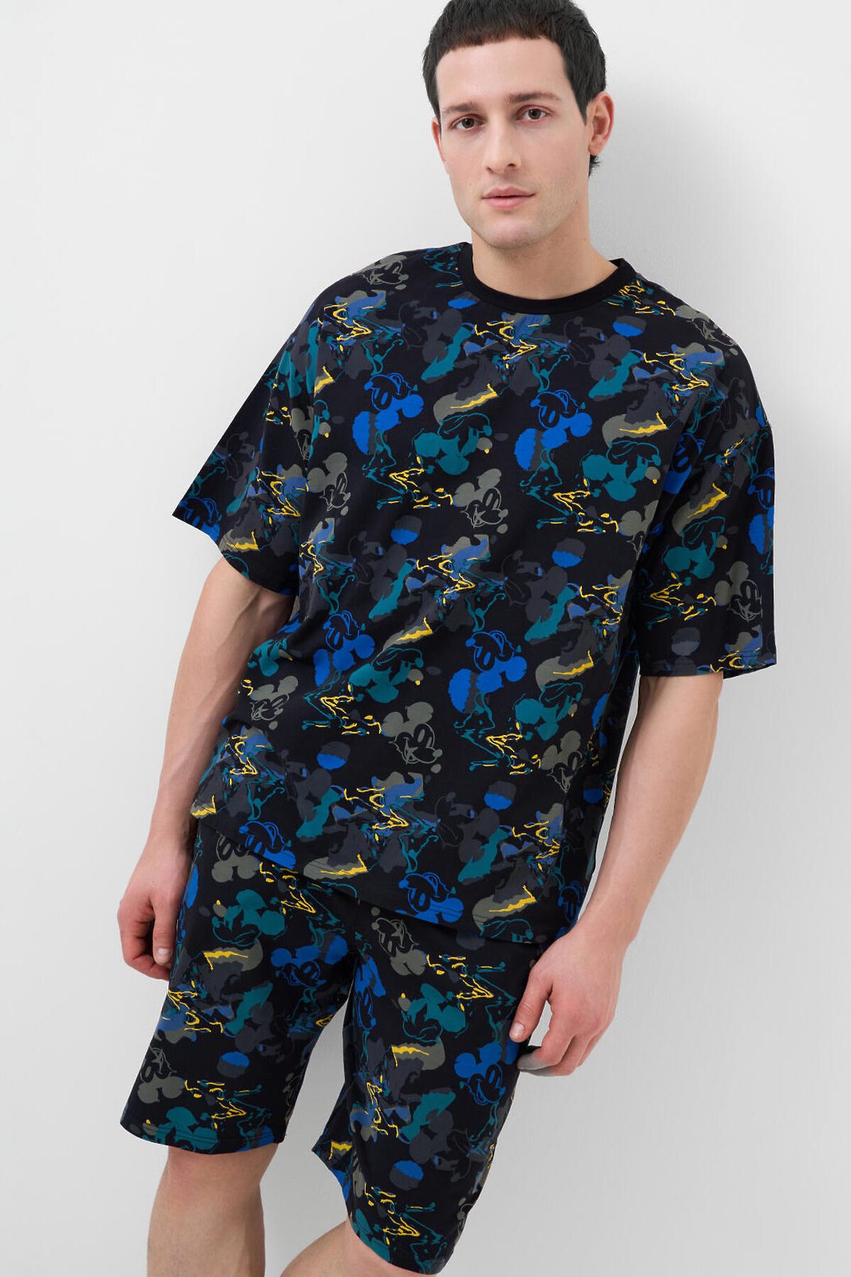 Мужская пижама. Состоит из оверсайз футболки и шорт. Изделие выполнено из мягкого, хлопкового трикотажа с ярким принтом. Футболка свободного кроя, с круглой горловиной и короткими рукавами. Шорты со средней длиной, на удобной резинке и регулируются шнуром. Можно составить family look c детским вариантом пижамы аналогичного дизайна.