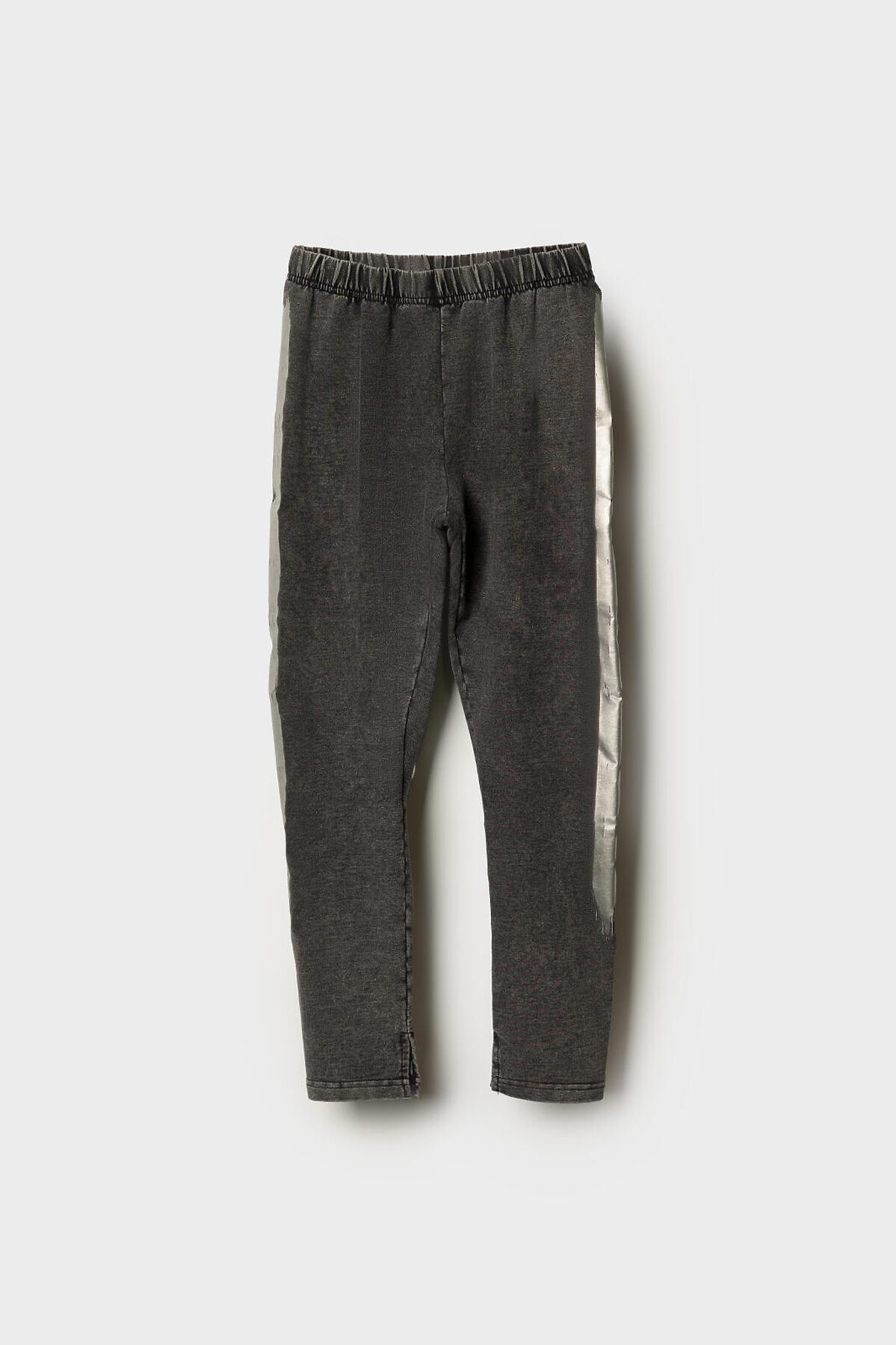 Легинсы для девочки подростка. Модель с высокой посадкой и облегающим силуэтом. Выполнены из хлопкового трикотажа по виду похожего на деним. Пояс выполнен с внутренней резинкой, благодаря чему легинсы хорошо держатся и комфортны в носке. По низу штанин - небольшие боковые разрезы, которые добавляют удобства и стильный акцент. По бокам расположен декоративный принт с серебрянным блеском.