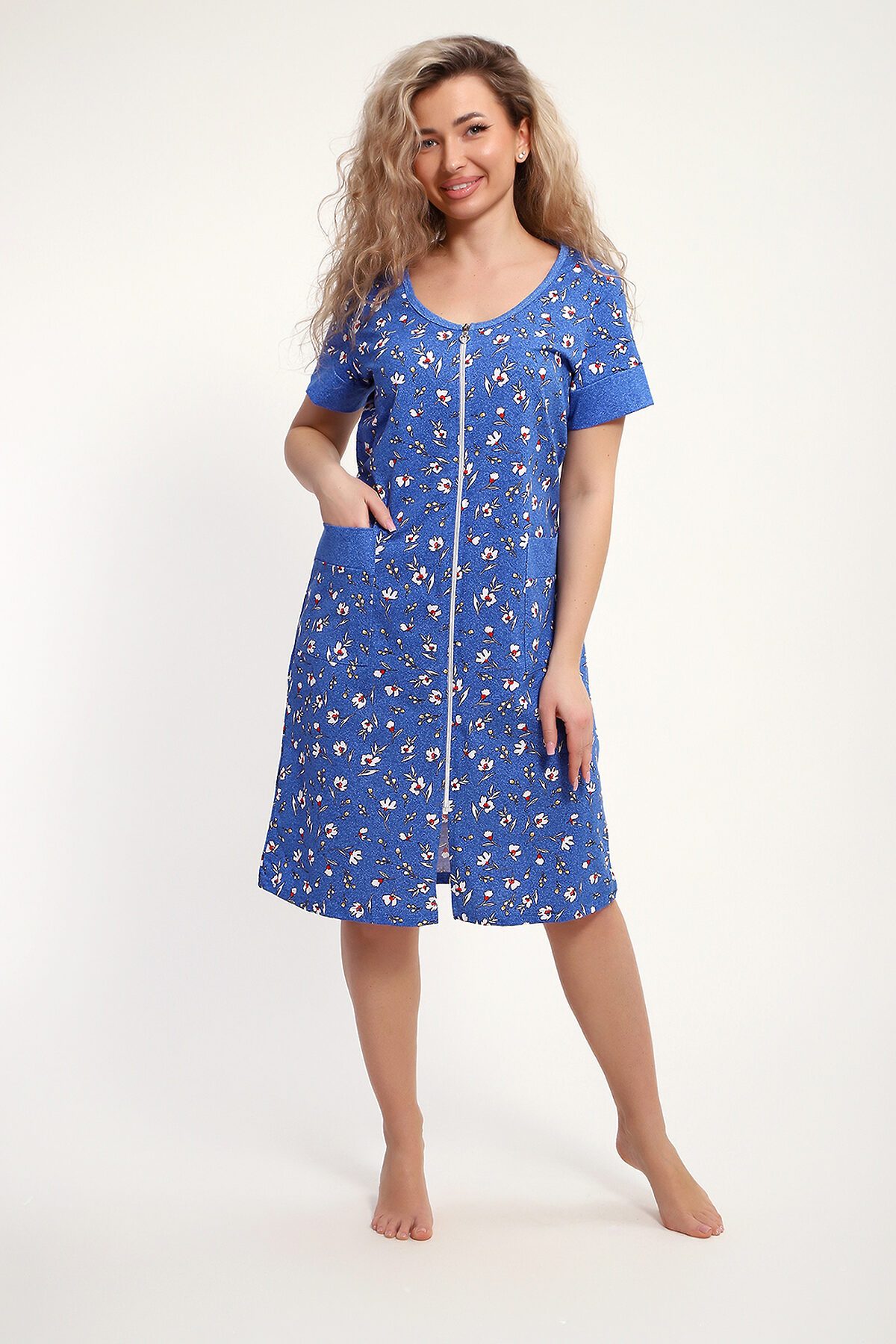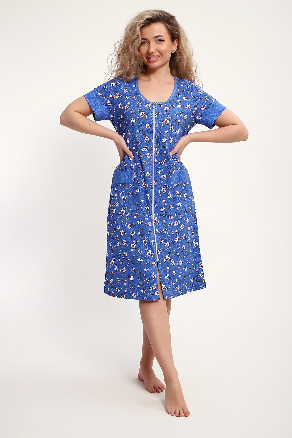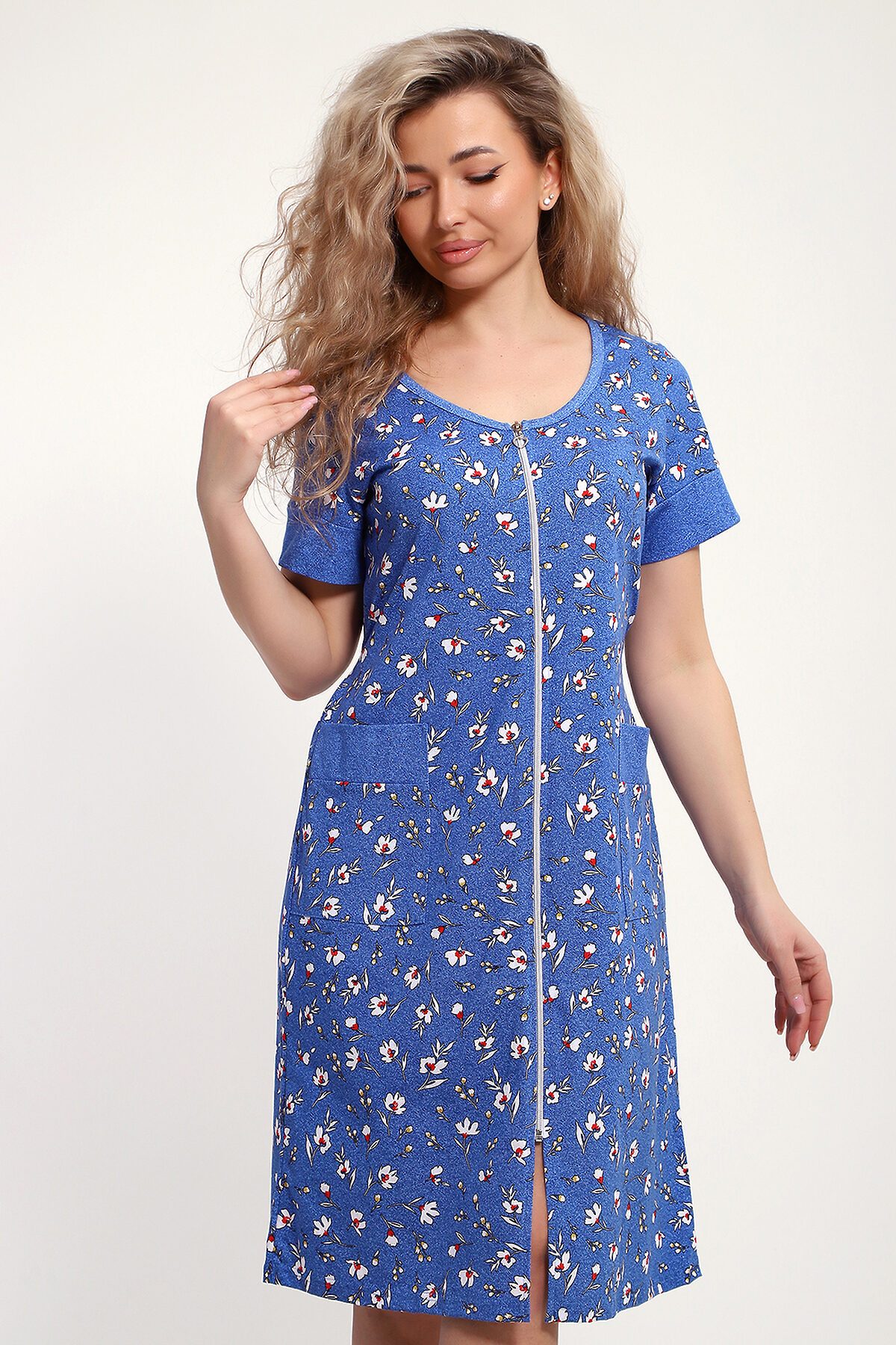 Женский халатик на молнии самая распространенная и универсальная одежда для домашнего отдыха и хозяйственных хлопот. После трудного рабочего дня, приходя домой, первым делом хочется переодеться. И данная модель это идеальный вариант среди представительниц прекрасной половины человечества. Модель выполнена из 100% хлопчатобумажной ткани. Халат так же дополняет яркая отделка по рукавам и карманам. А пояс на линии талии поможет легко смоделировать женственный силуэт и при этом Вы будете чувствовать себя легко и непринуждённо. Данная модель прекрасно подойдёт для дома, дачи и отдыха, создавая по-настоящему яркий образ и хорошее настроение! Рост модели на фото 165см.