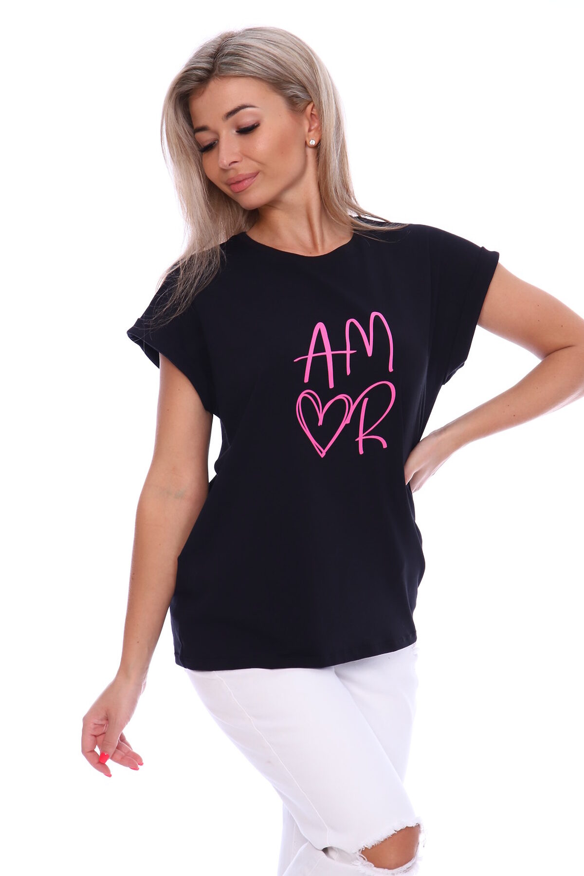 Футболка женская с оригинальным принтом, из хлопковой ткани с лайкрой. Ткань держит форму, не вытягивается, приятная на ощупь. Стильная футболка классического фасона со спущенным рукавом. Посадка свободная. Такая модель подойдет абсолютно всем и станет необходимой вещью в вашем гардеробе.
