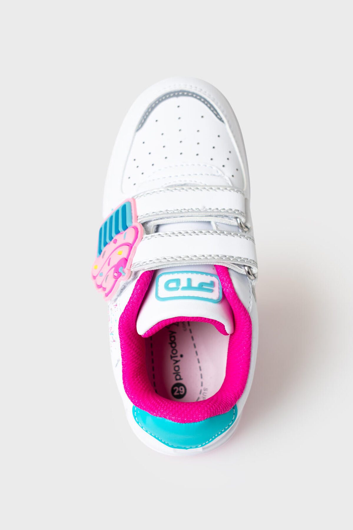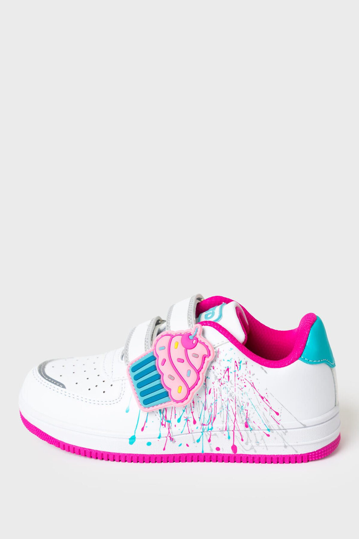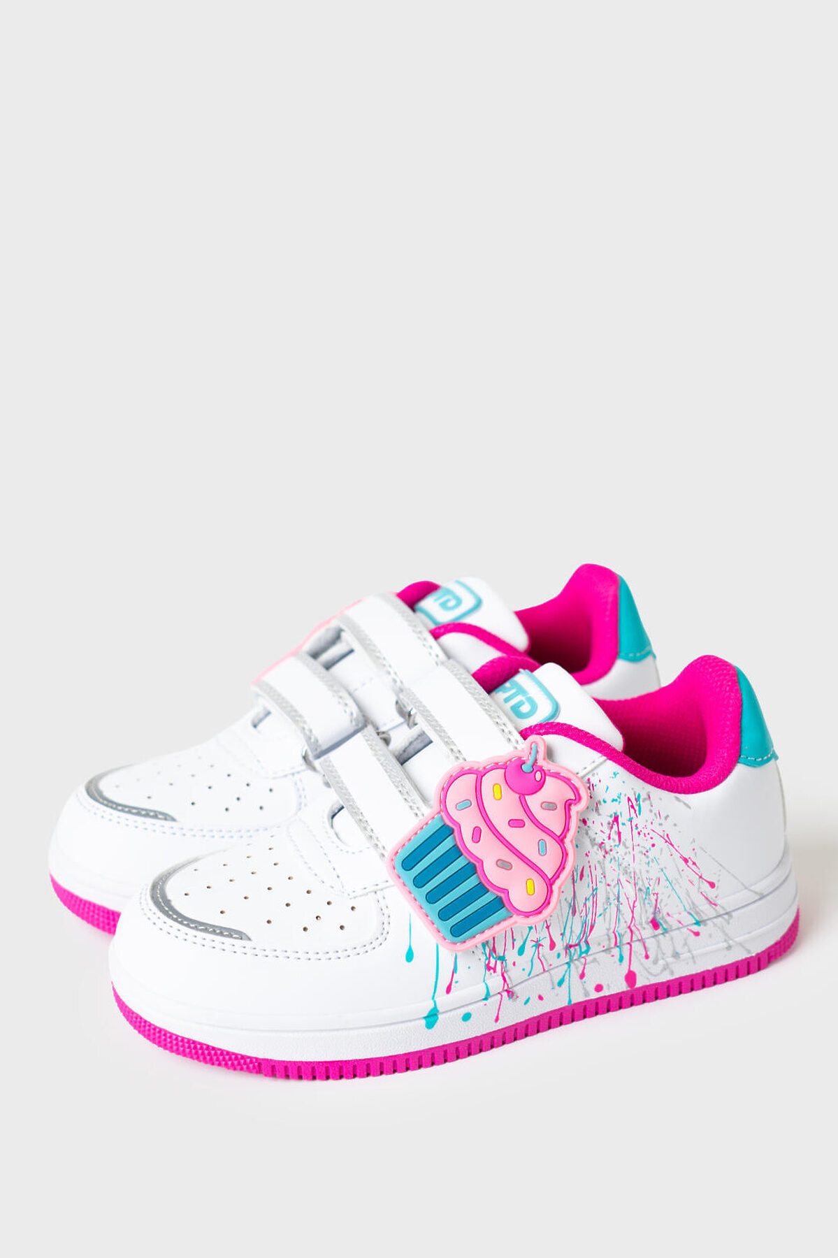 Оригинальные кеды для девочек на широкой липучке. Липучка декорирована крупным патчем - пироженкой.. Кроссовки выполнены из искусственной кожи, по своим свойствам схожим с натуральной кожей. В обуви есть светоотражающие элементы. В носочной части обуви стоит текстильная подкладка c высоким содержанием хлопка 80%, которая обладает высокой гигроскопичностью. В пяточной части обуви текстильная подкладка обладает хорошей износостойкостью. Профилированная съемная стелька из натуральной кожи с анатомической формой подсводника обеспечивает правильную нагрузку на стопу. Формоустойчивый задник поддерживает стопу в правильном положении. Эргономичная форма колодки обеспечивает правильное формирование стопы ребенка. Подошва из ТПР гибкая, не скользит и устойчива к истиранию.
