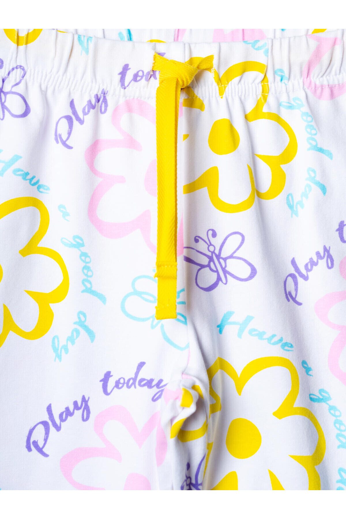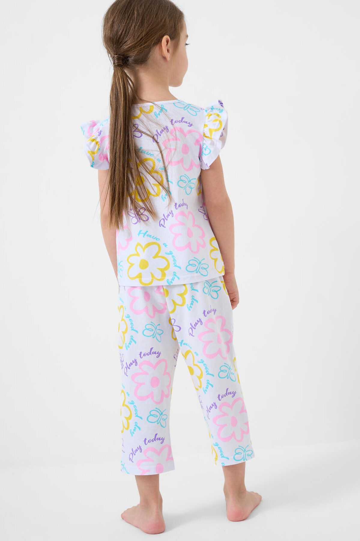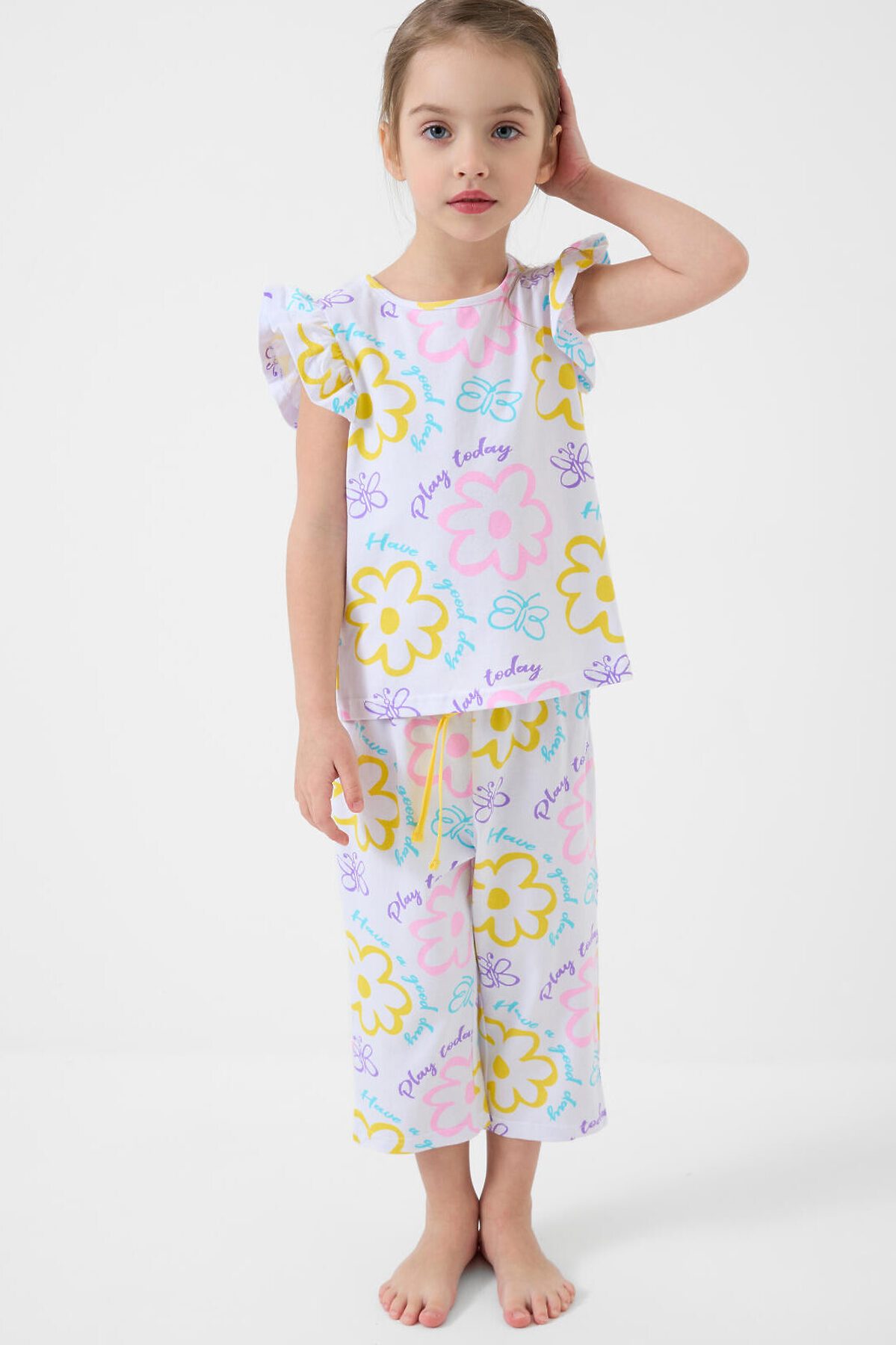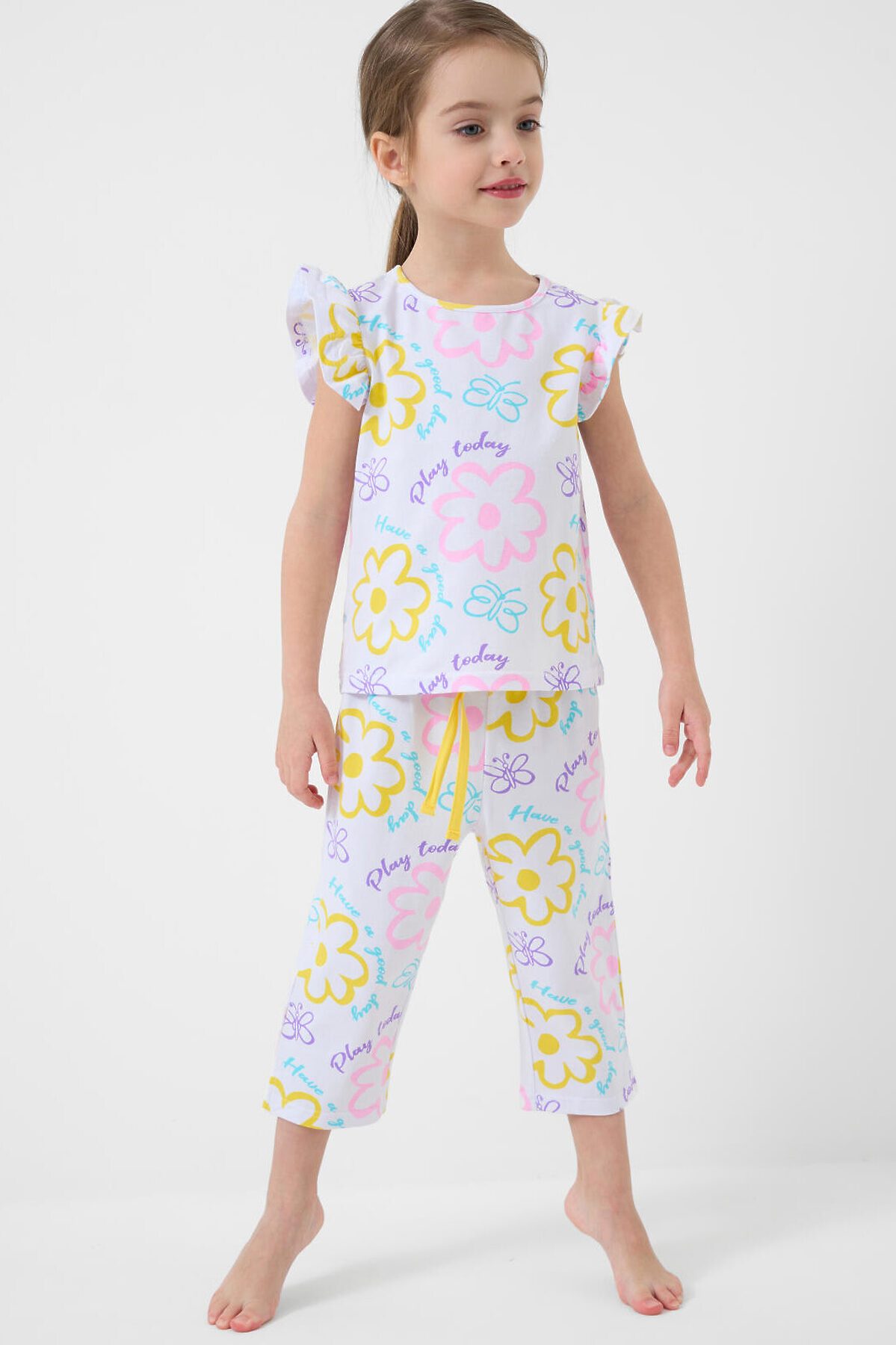 Детская пижама для девочки. Состоит из футболки, прямого кроя с короткими рукавами и бридж. Модель выполнена из мягкого, хлопкового трикотажа. Яркий принт с цветами, бабочками и надписями делает комплект весёлым и привлекательным. Рукава украшены воланами, что придаёт образу воздушность. У футболки круглая горловина с аккуратной отделкой, бриджи — на удобной резинке и с декоративным шнурком на поясе.