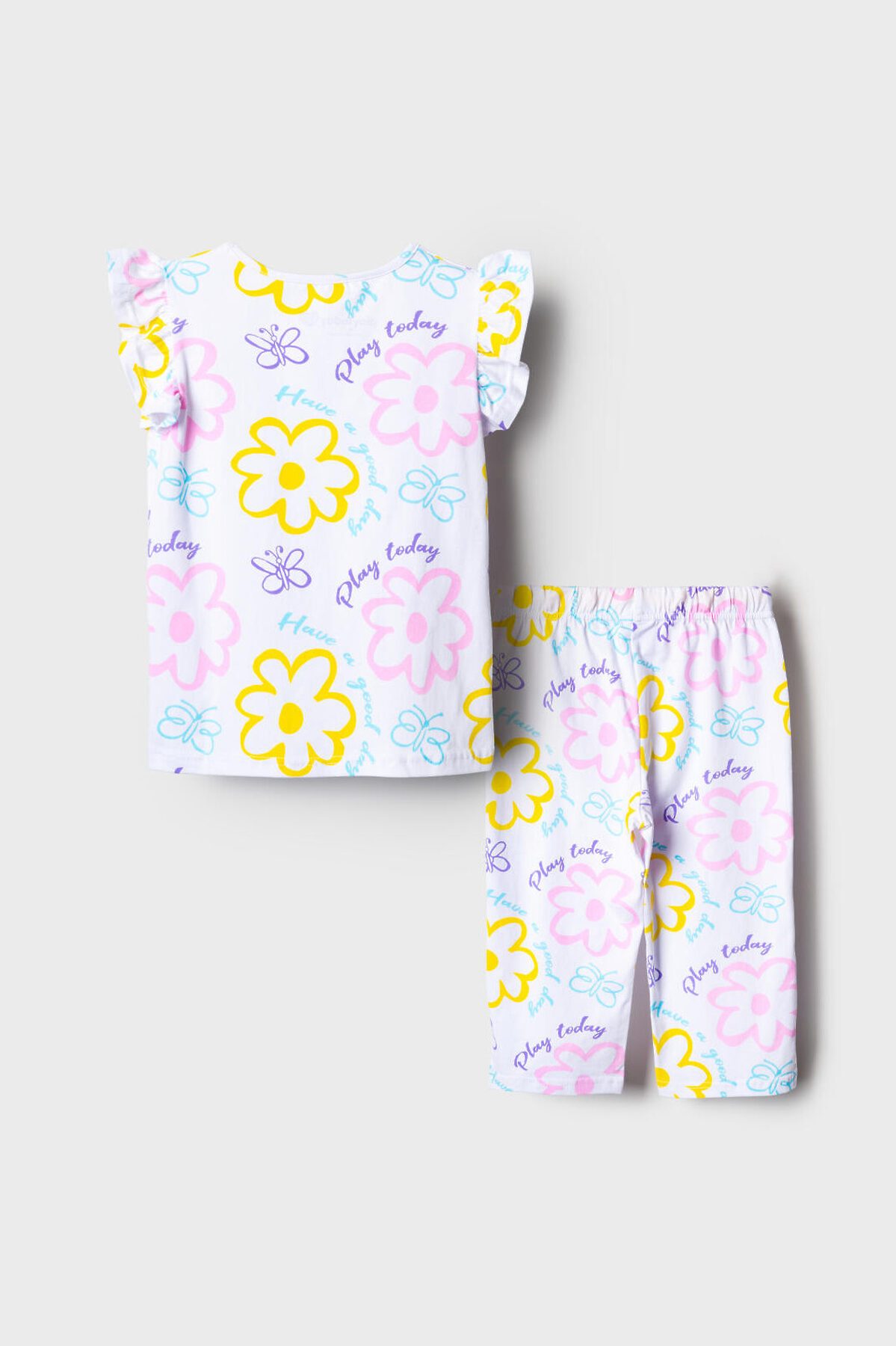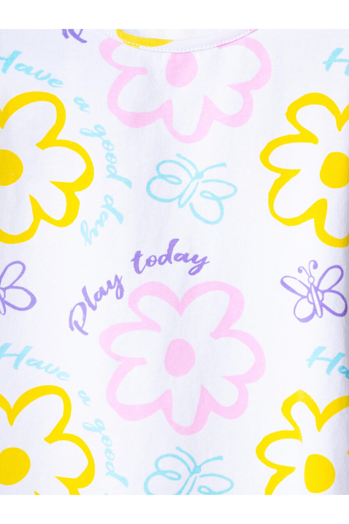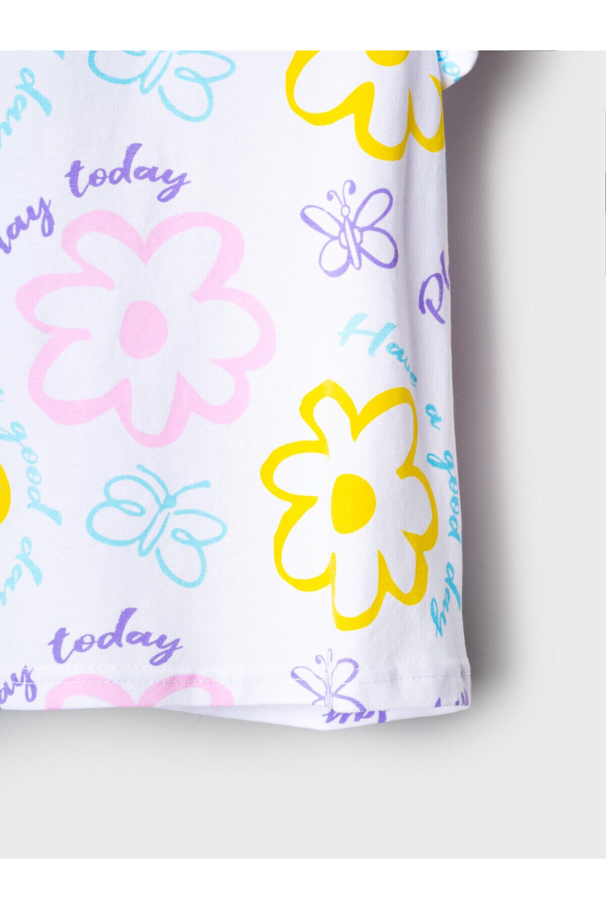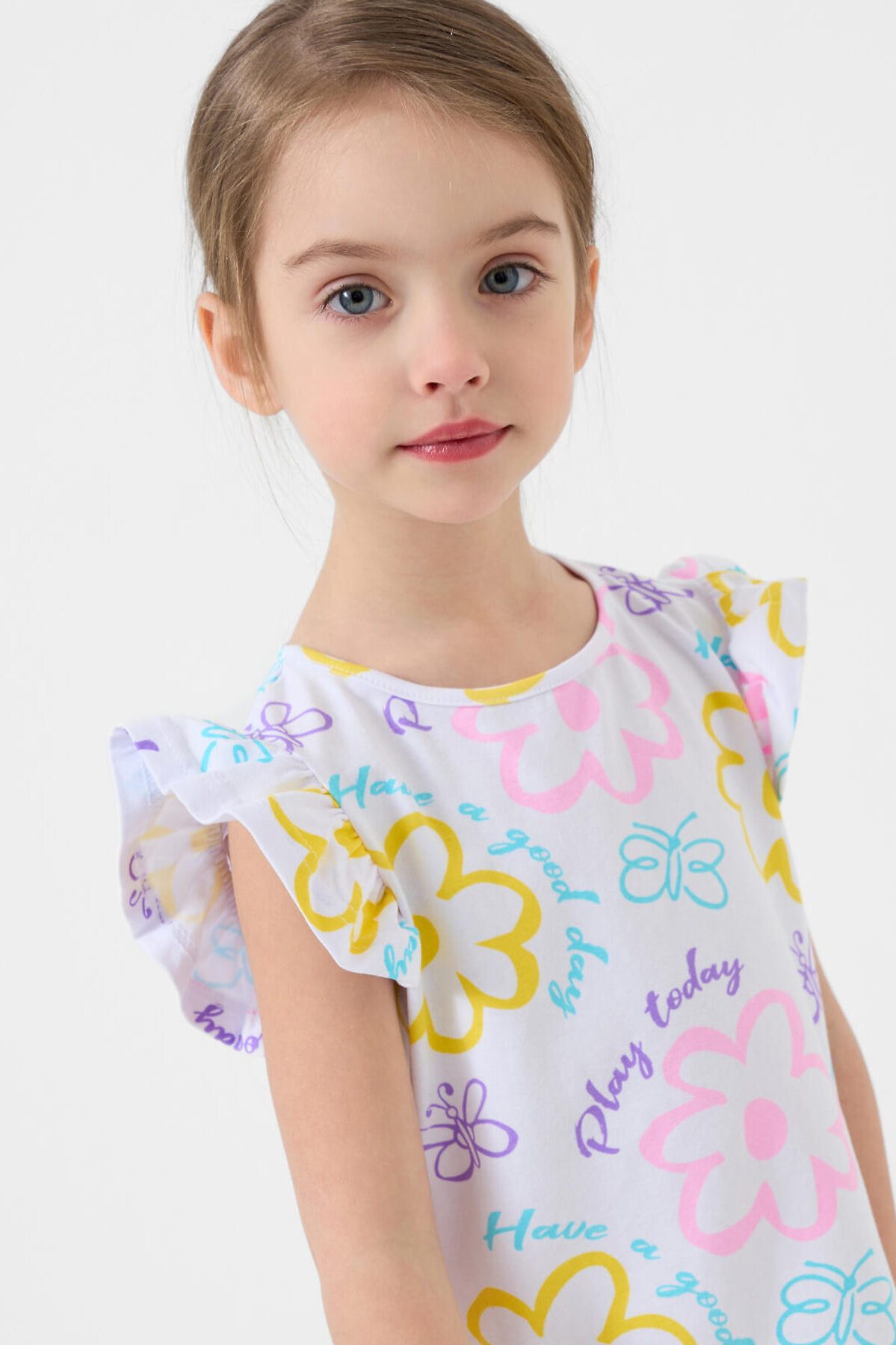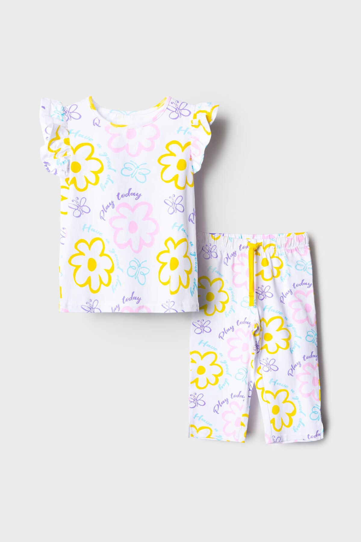 Детская пижама для девочки. Состоит из футболки, прямого кроя с короткими рукавами и бридж. Модель выполнена из мягкого, хлопкового трикотажа. Яркий принт с цветами, бабочками и надписями делает комплект весёлым и привлекательным. Рукава украшены воланами, что придаёт образу воздушность. У футболки круглая горловина с аккуратной отделкой, бриджи — на удобной резинке и с декоративным шнурком на поясе.