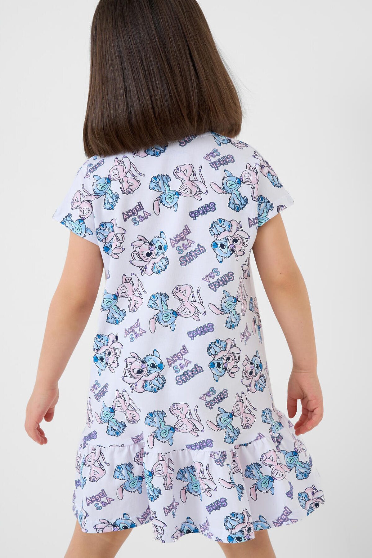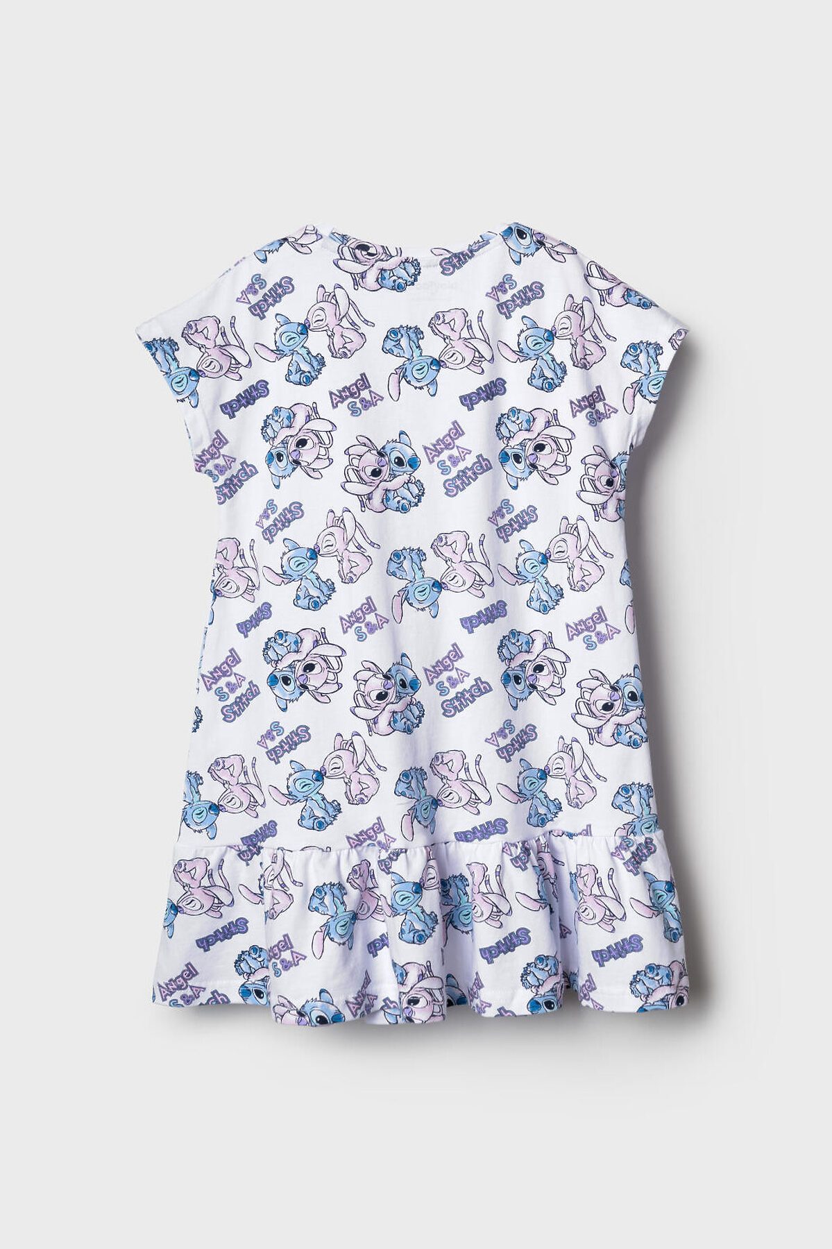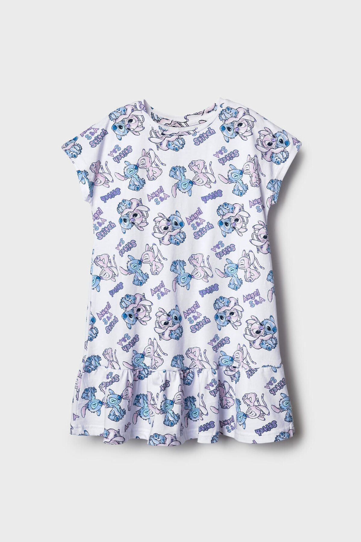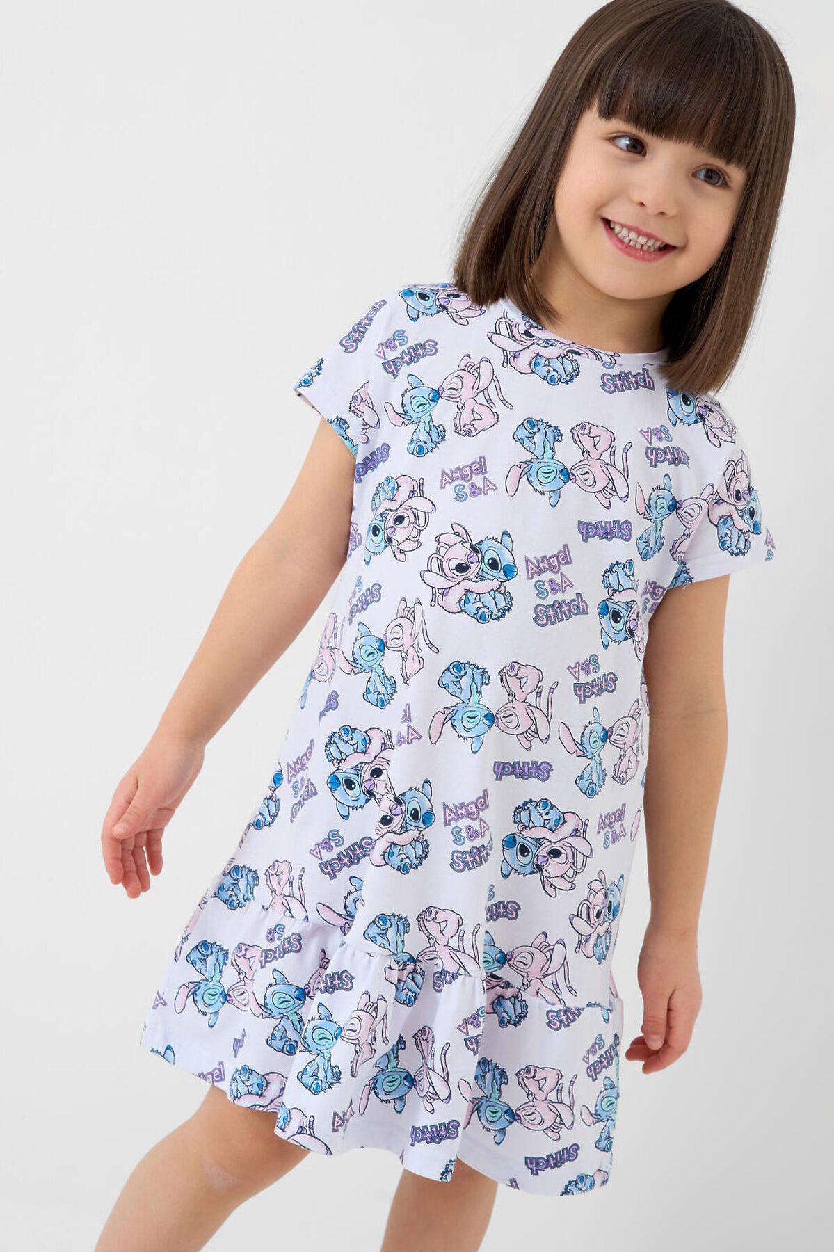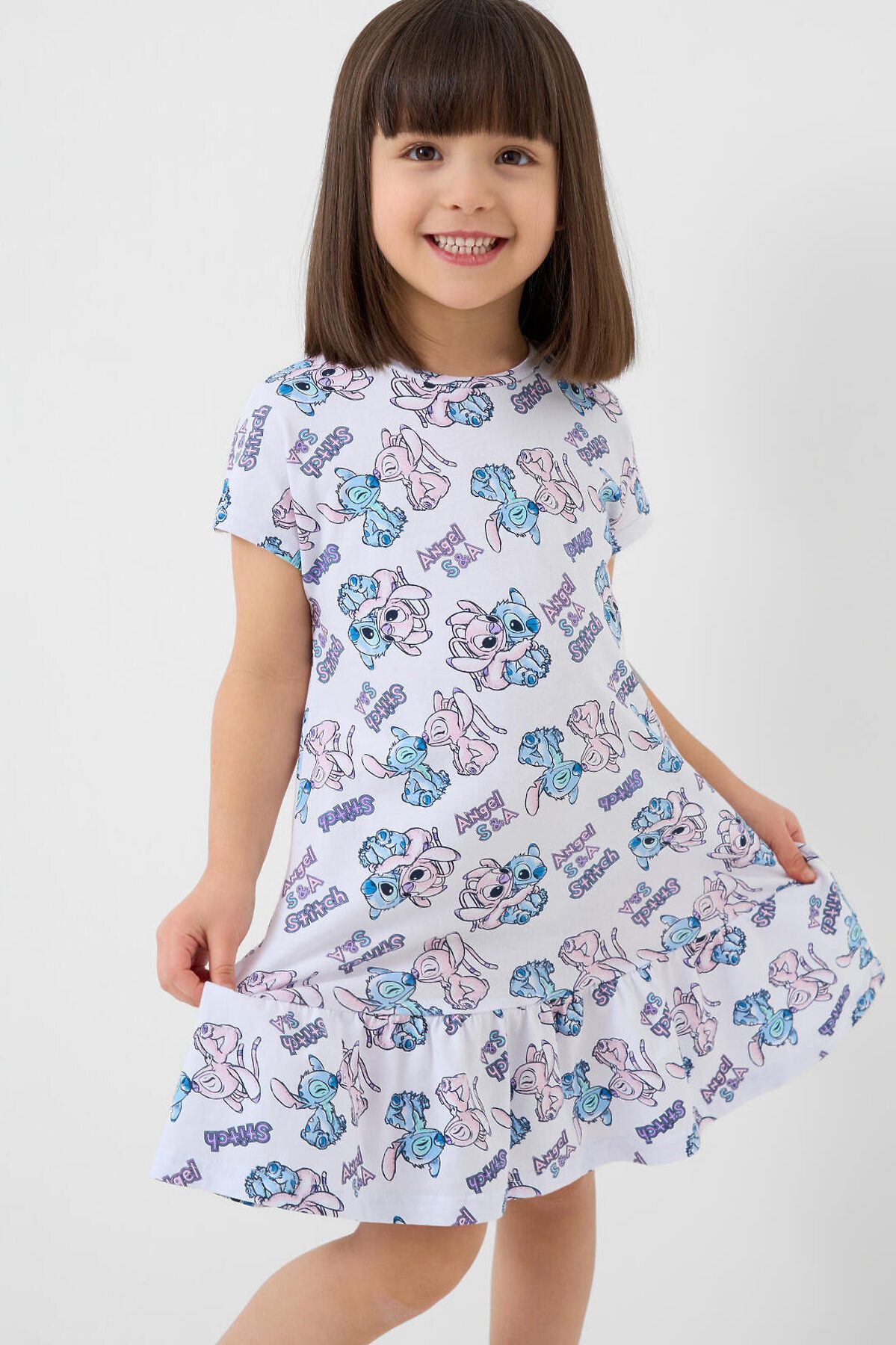 Детская ночная сорочка для девочки. Выполнена из мягкого хлопкового трикотажного материала. Модель прямого кроя, с короткими рукавами и широким воланом по низу, что придаёт ей воздушность и дополнительный объём. Горловина круглая, аккуратно обработана кантом. Главной особенностью дизайна является яркий и весёлый принт с персонажами Лило и Стич.