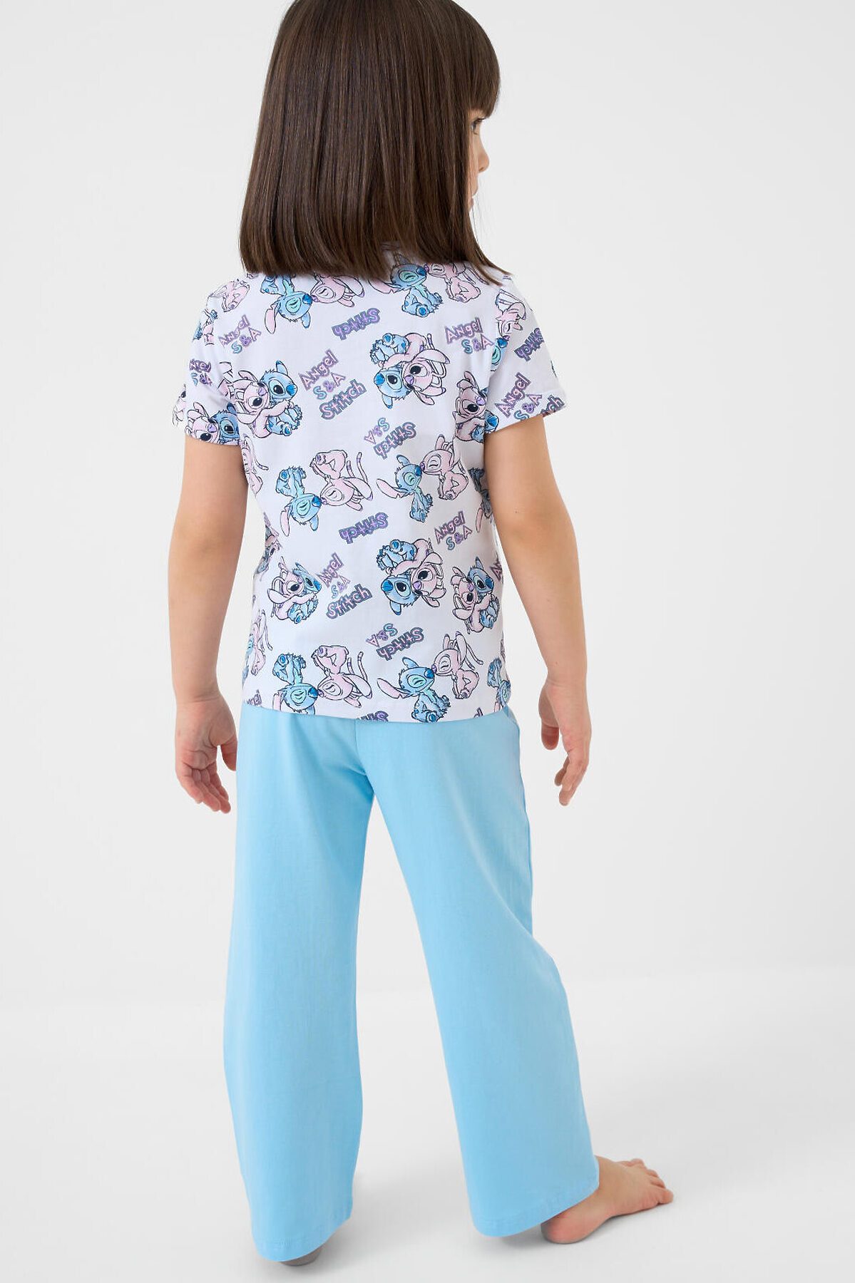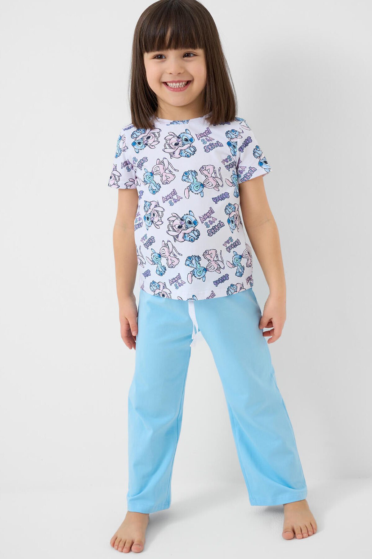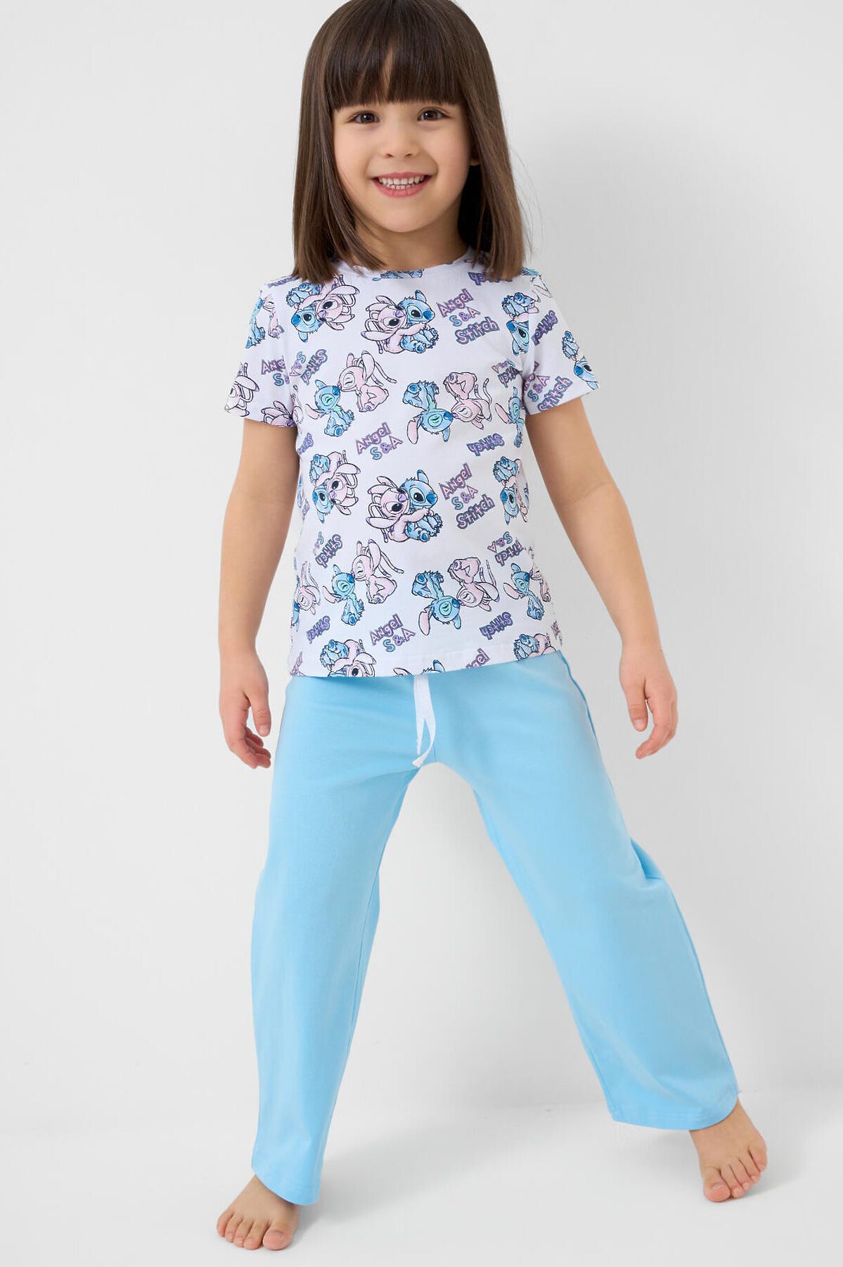 Пижама детская с Лило и Стич для девочки. Комплект состоит из футболки, прямого кроя и длинных брюк. Футболка белая с ярким и милым принтом. Брюки — на удобной резинке. Материал — мягкий, хлопковый трикотаж, приятный к телу.