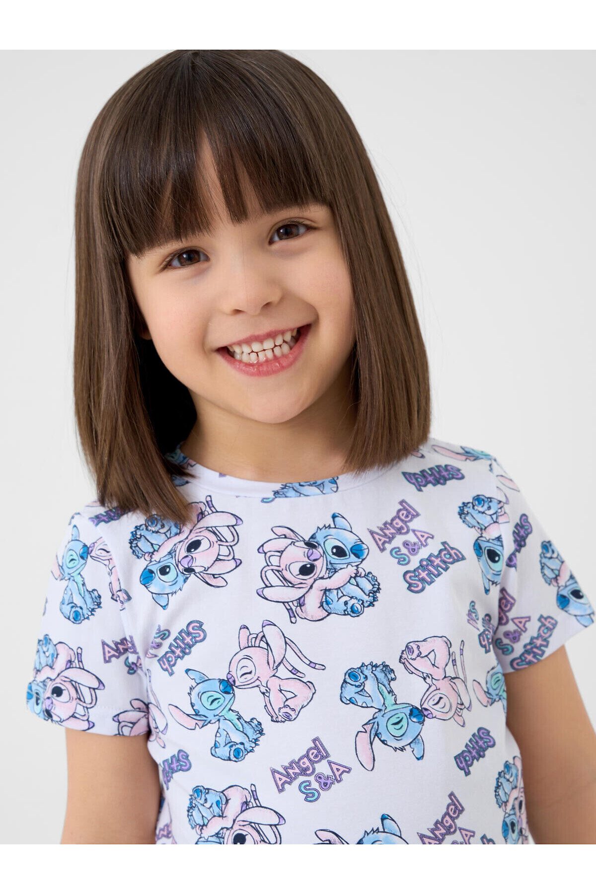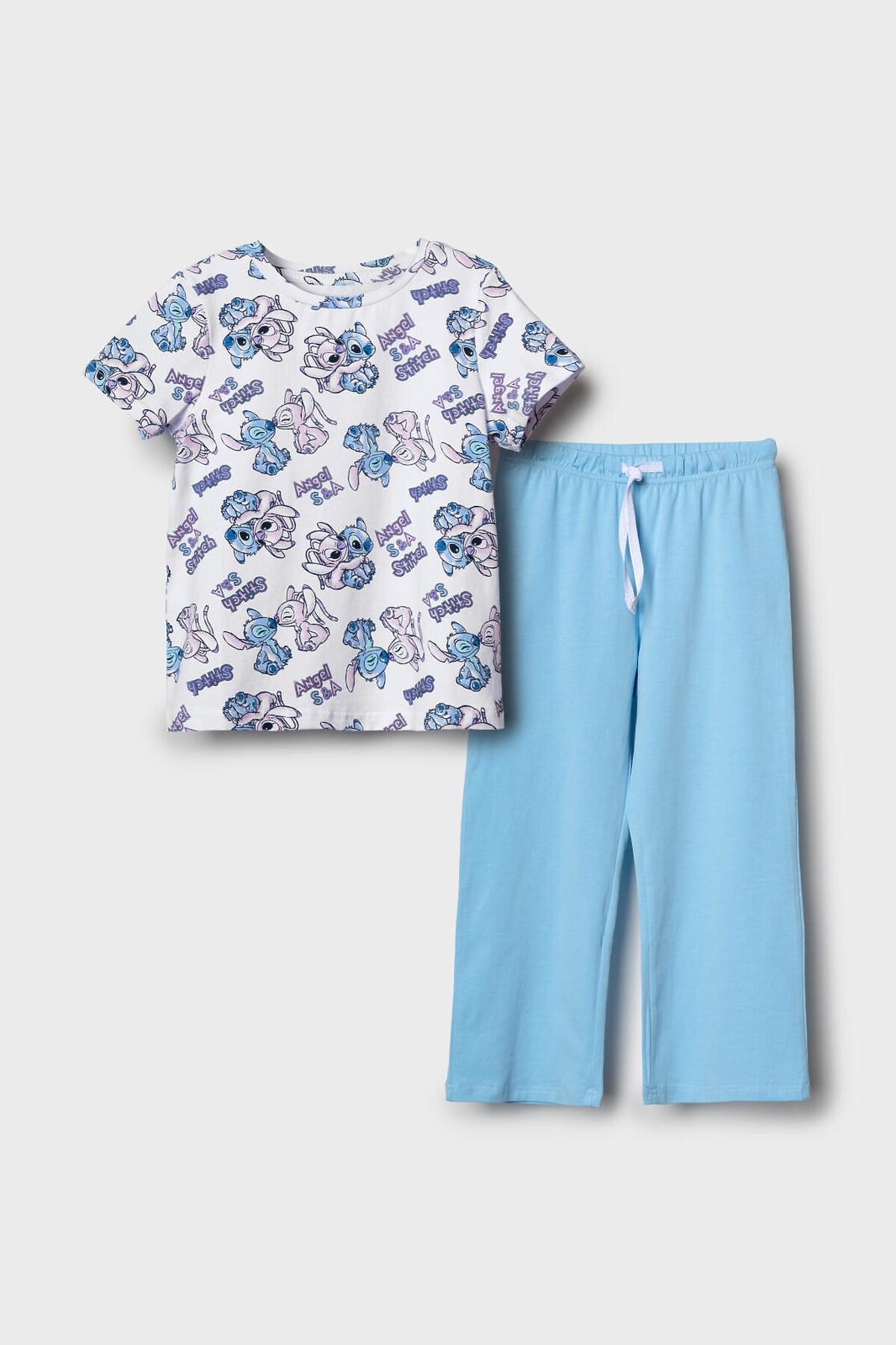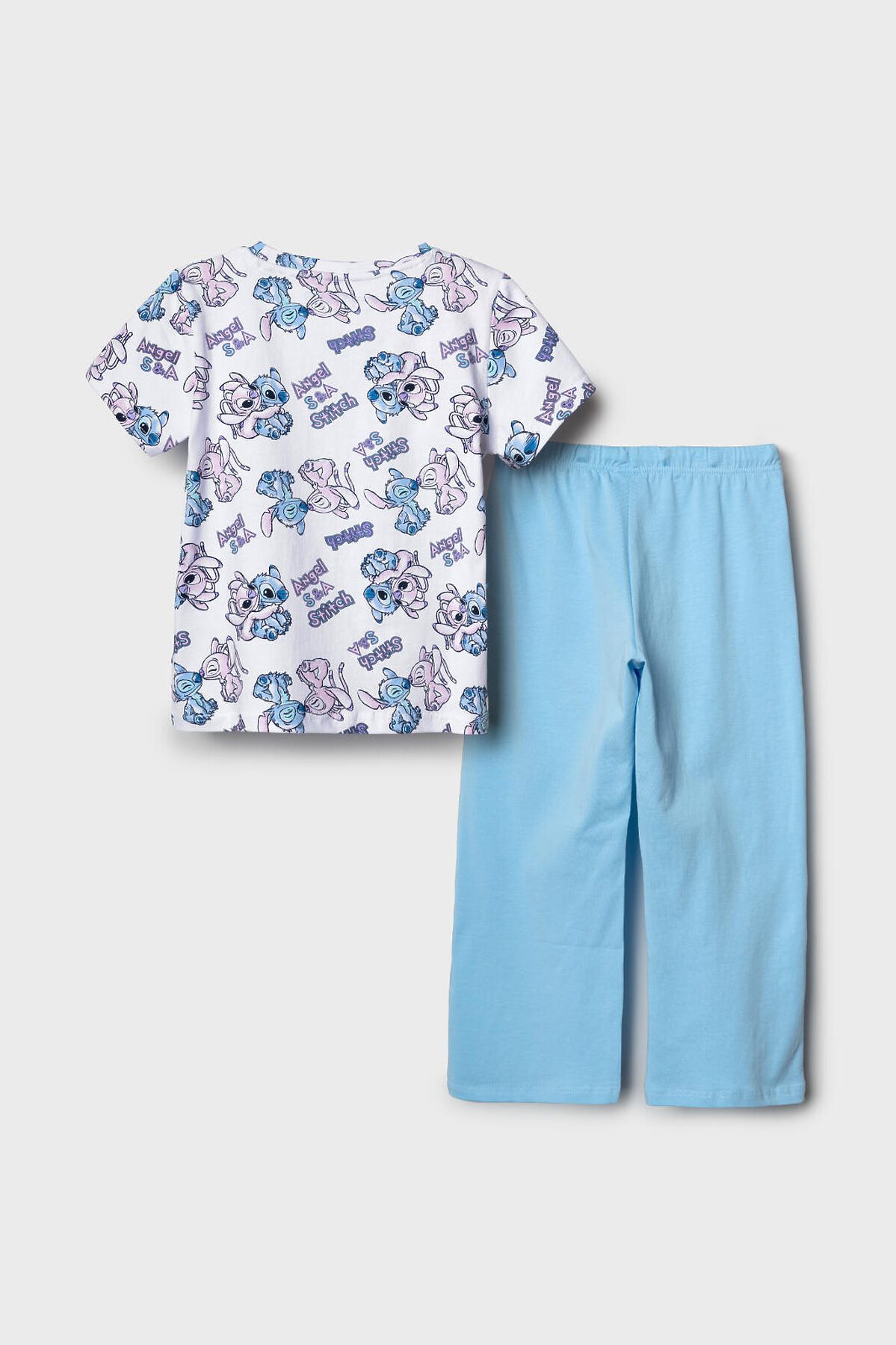 Пижама детская с Лило и Стич для девочки. Комплект состоит из футболки, прямого кроя и длинных брюк. Футболка белая с ярким и милым принтом. Брюки — на удобной резинке. Материал — мягкий, хлопковый трикотаж, приятный к телу.