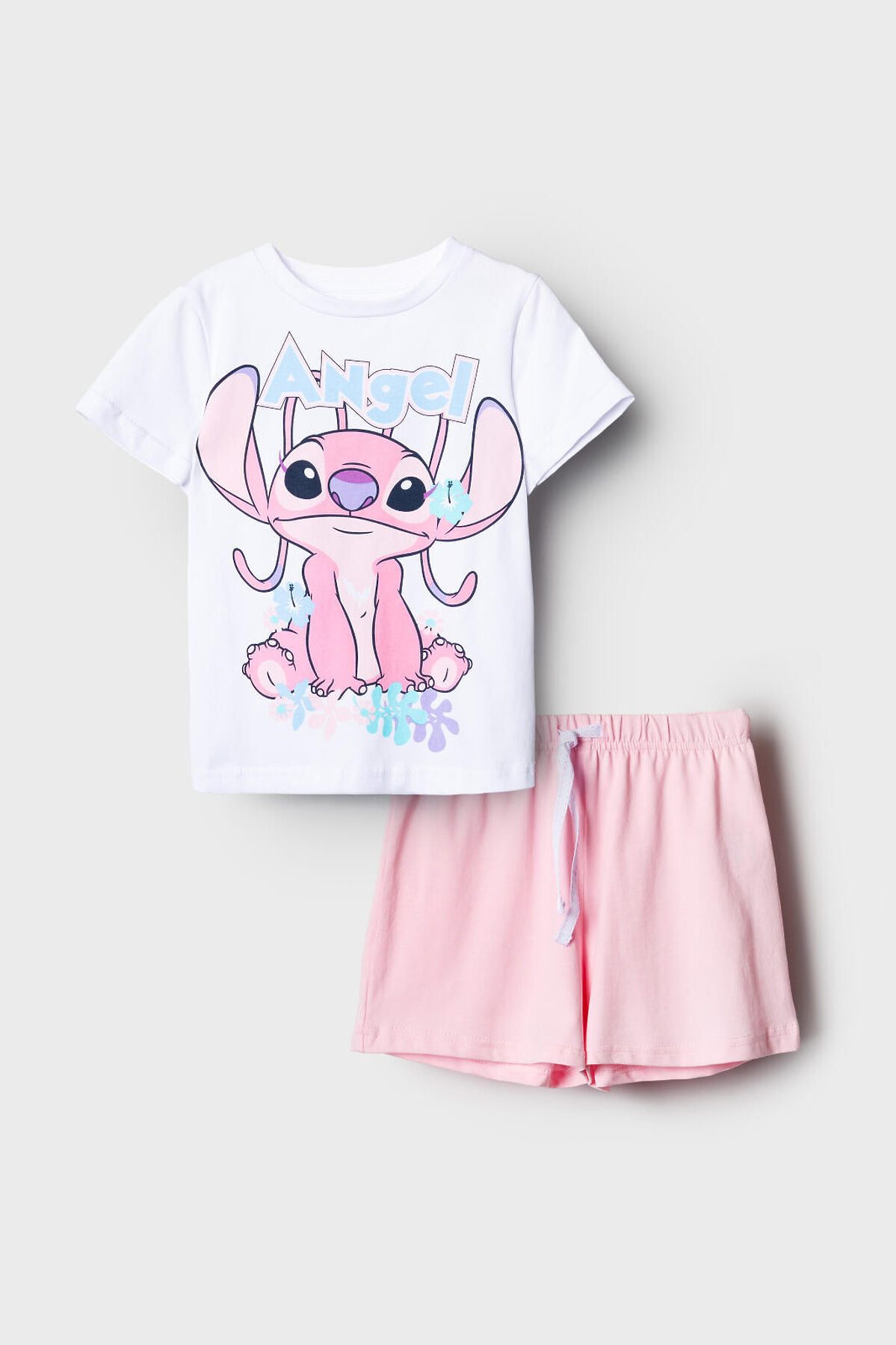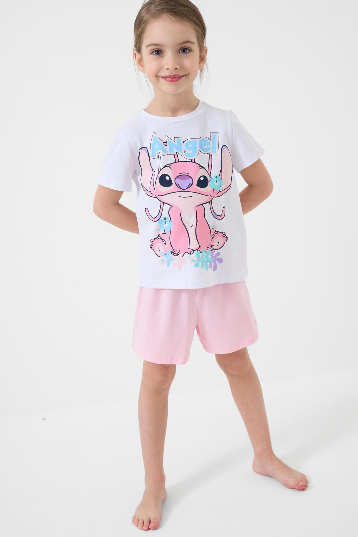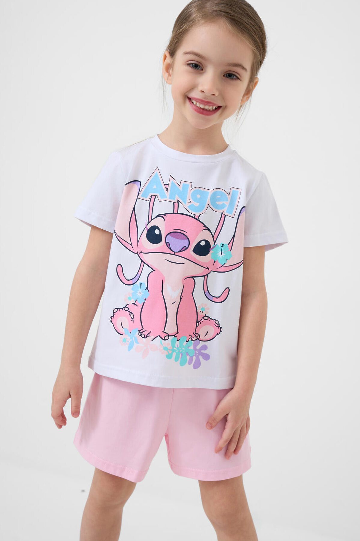 Детская пижама для девочки. Комплект состоит из белой футболки, прямого кроя с короткими рукавами и светло-розовых шорт. На футболке — крупный цветной принт с изображением Лило и Стич. Шорты на резинке, дополнены декоративным шнурком на поясе. Материал — легкий, хлопковый трикотаж, приятный для тела.